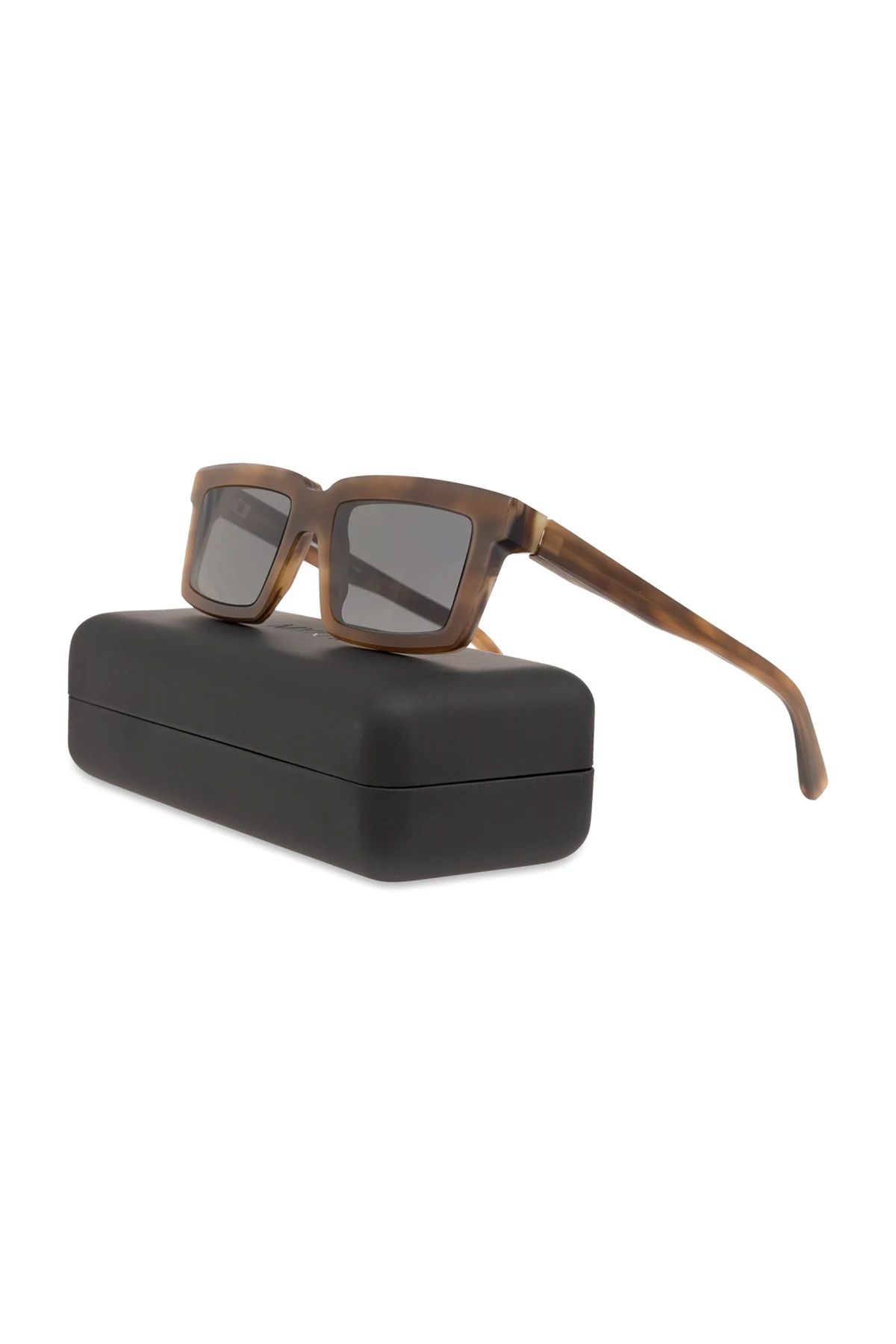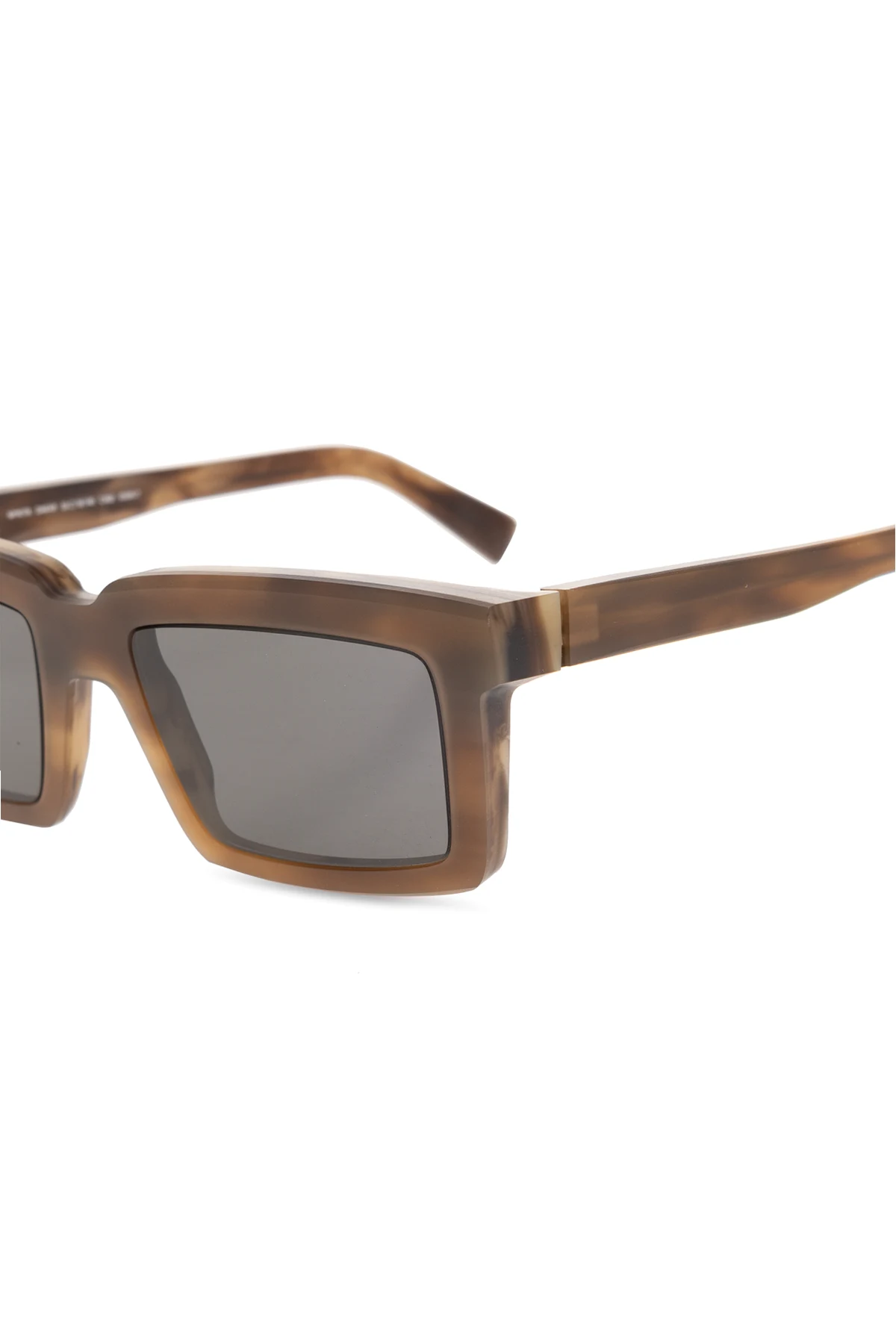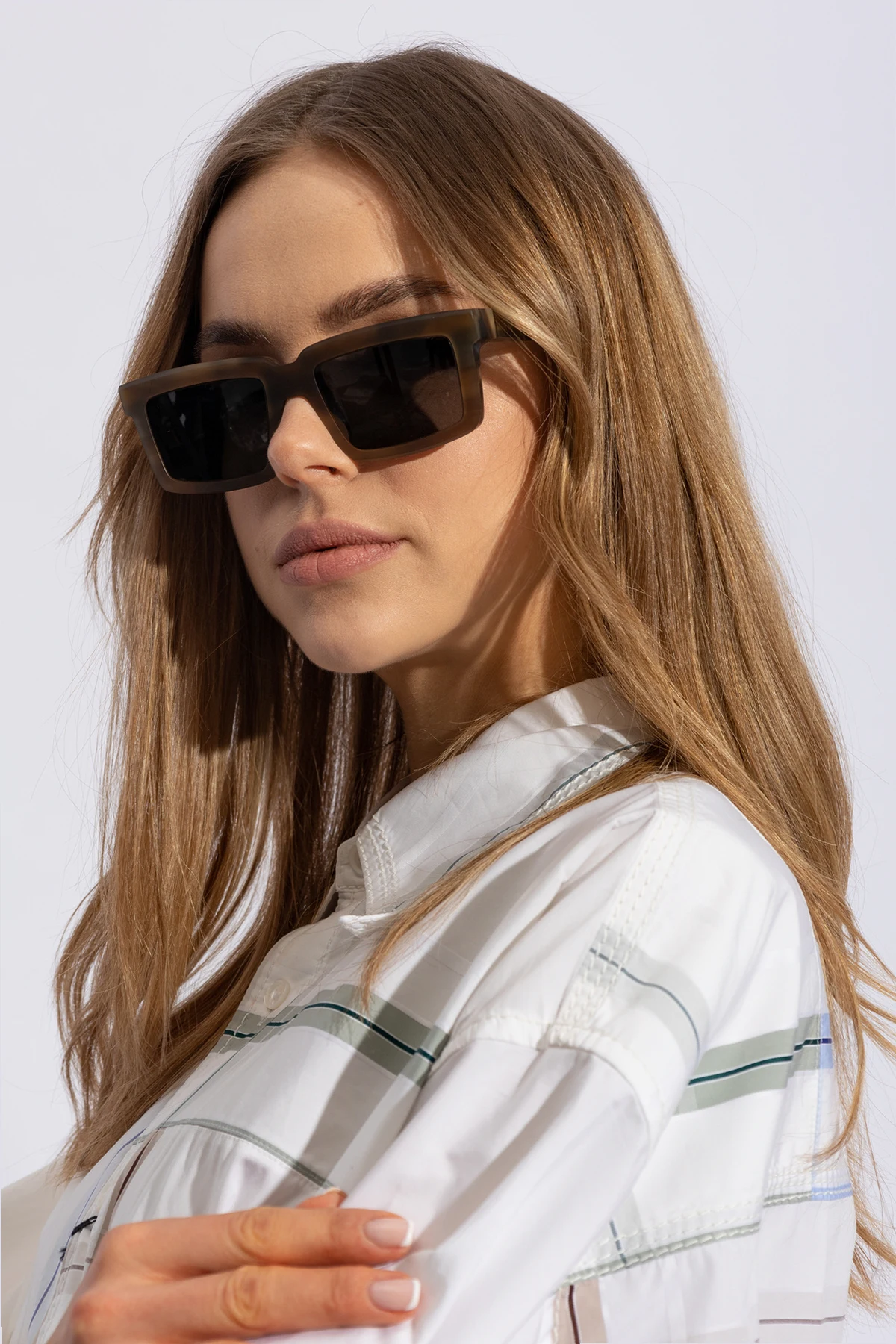Ich brązowa oprawka, wykonana z najwyższej jakości acetatu z certyfikatem ISCC PLUS , prezentuje subtelne przejścia tonalne, od jaśniejszych beżów po głębokie odcienie brązu, nadając tym okularom niepowtarzalny charakter. Prostokątne, szerokie soczewki z lekko zaokrąglonymi rogami, oprócz dodania wizualnej masywności, gwarantują optymalną ochronę przed promieniowaniem UV, dzięki zastosowaniu szarych soczewek przyciemnianych technologią najnowszej generacji.