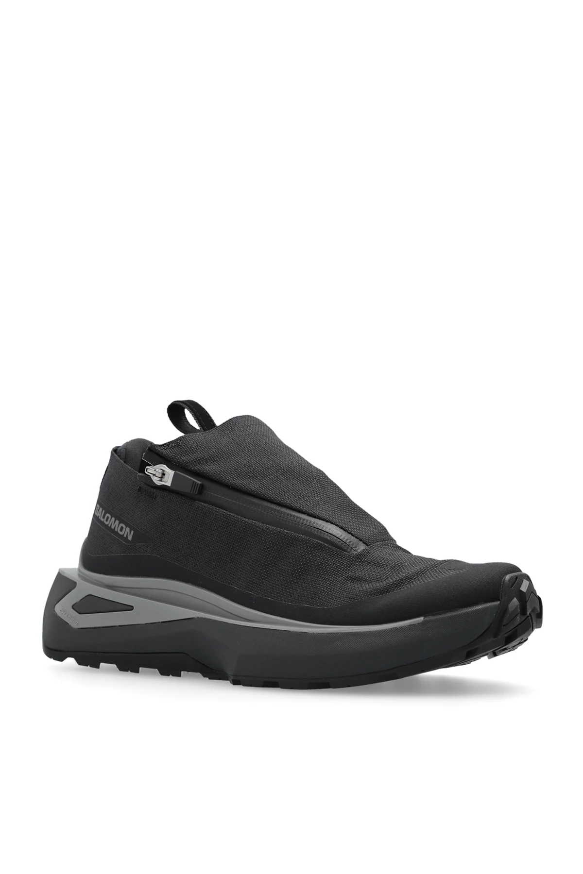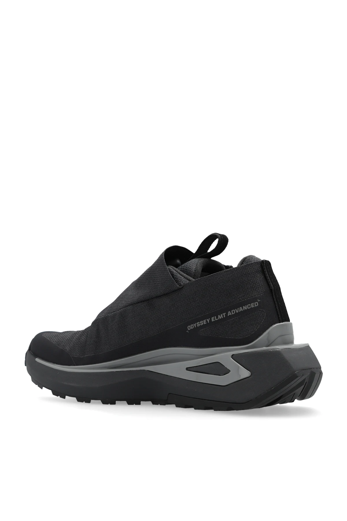 Czarno-szare, sznurowane buty sportowe, model ‘ODYSSEY ELMT ADVANCED’ Salomon. Wykonane z materiału. Ozdobione logo. Wykorzystana technologia Contagrip® to podeszwa stworzona z myślą o maksymalnej przyczepności na grząskich, miękkich, nieregularnych i nierównych nawierzchniach. Ma głębokie kostki bieżnika wykonane z materiału zapewniającego dobrą przyczepność.