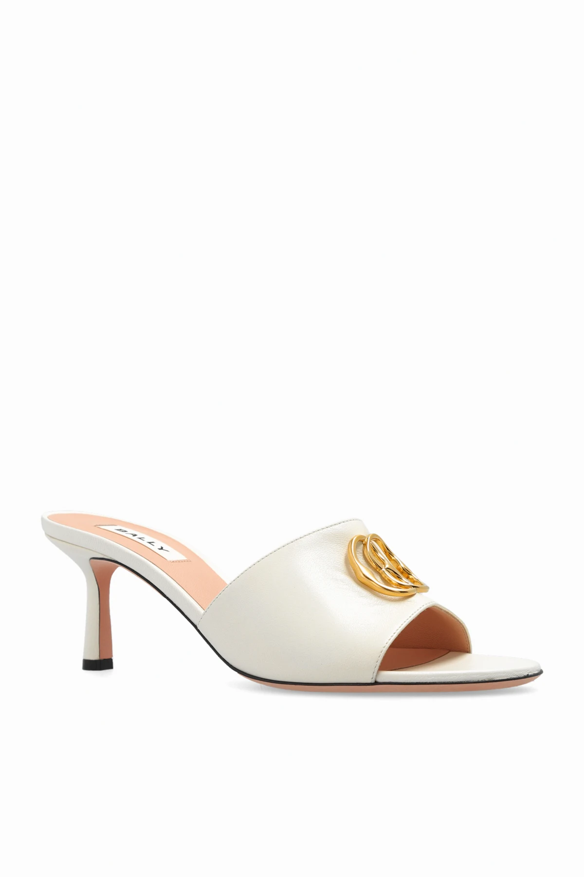 Kremowe klapki na obcasie, model ‘Geha’ Bally. Wykonane ze skóry jagnięcej. Ozdobione metalową aplikacją w kształcie logo w kolorze złotym. Migdałowy nosek. Różowa, skórzana podeszwa.