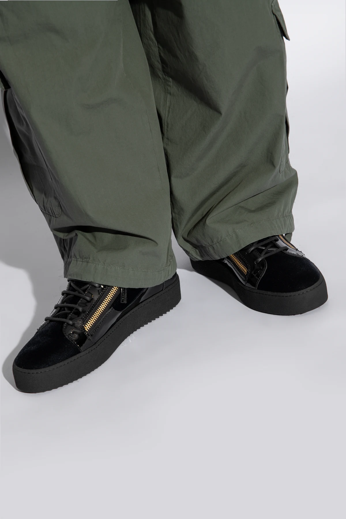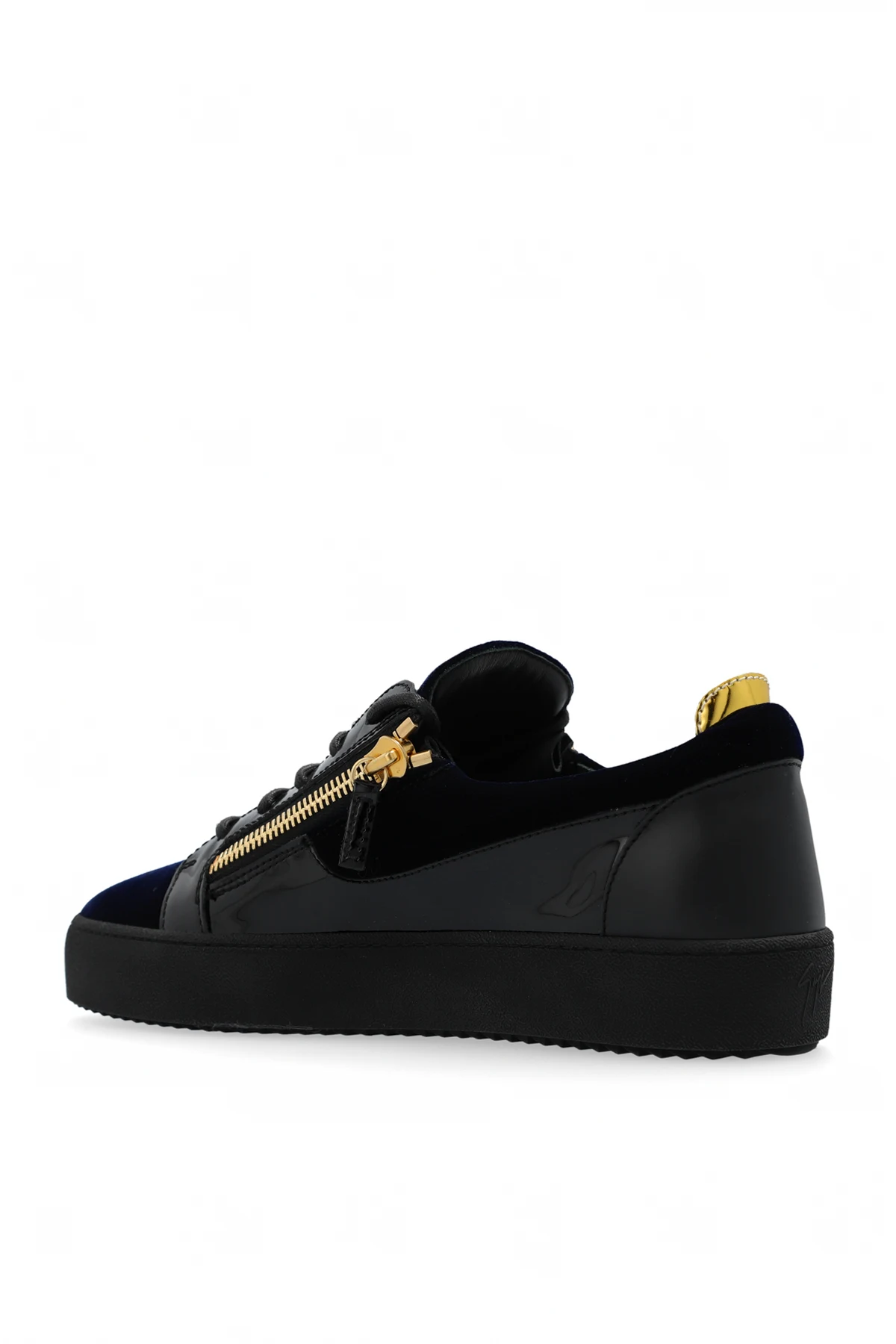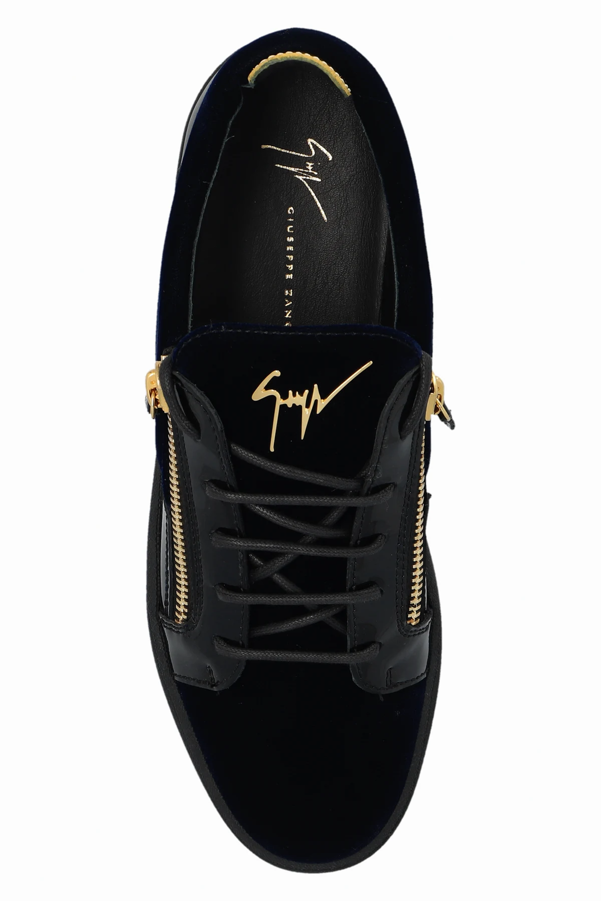 Sznurowane buty sportowe w kolorze czarno-złoto-granatowym Giuseppe Zanotti. Wykonane z aksamitu wykończonego skórą. Z przodu metalowe logo. Po bokach zamek. Okrągły nosek. Podeszwa wykonana z gumy w kolorze czarnym.