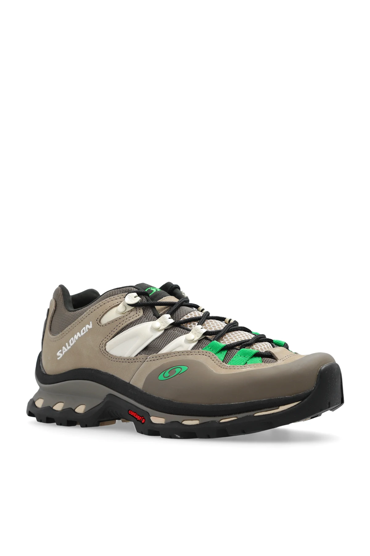 Brązowo-szaro-zielone, sznurowane buty sportowe, model ‘XT-QUEST 2’ Salomon. Wykonane ze skóry, materiału i tworzywa sztucznego. Ozdobione logo. Cholewka wsparta dodatkową powierzchnią utwardzającą przy palcach. Biało-zielona, gumowa podeszwa.