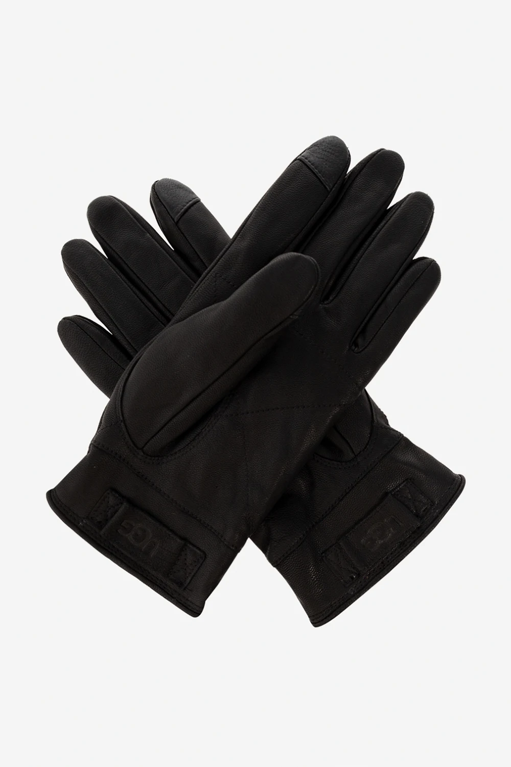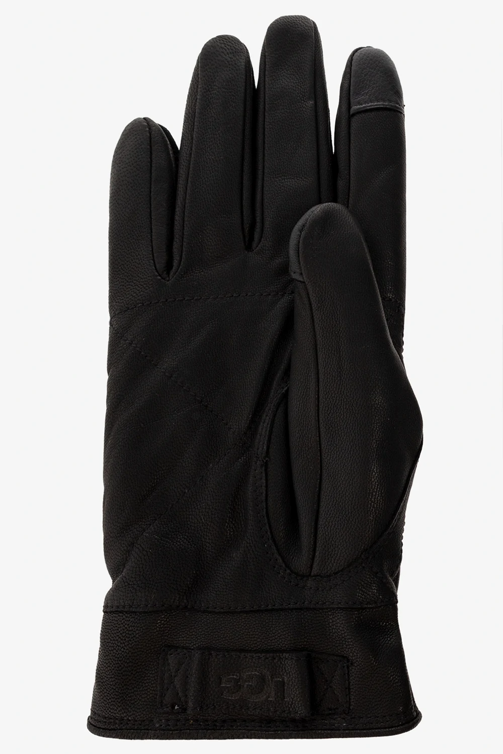 Czarne rękawiczki UGG. Wykonane ze skóry. Z tyłu naszywka z wytłoczonym logo. Warstwa wewnętrzna wykończona materiałem imitującym futro.