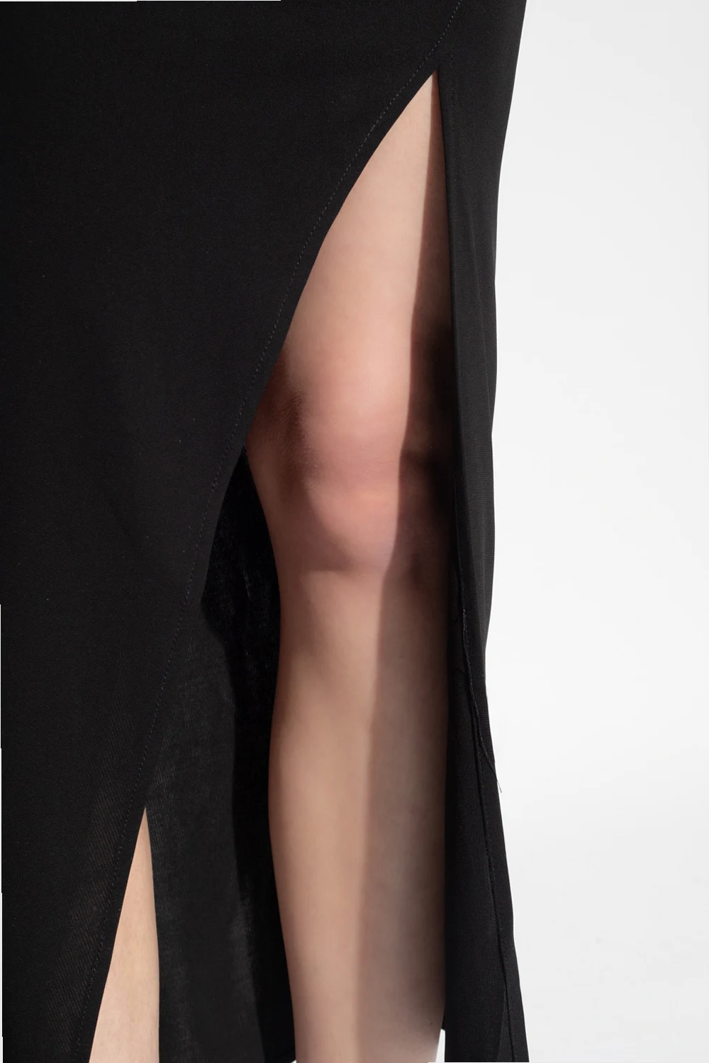 Czarna spódnica Helmut Lang. W pasie wszyta guma. Dekoracyjne, asymetryczne przeszycia. Na dole głębokie rozcięcie.
