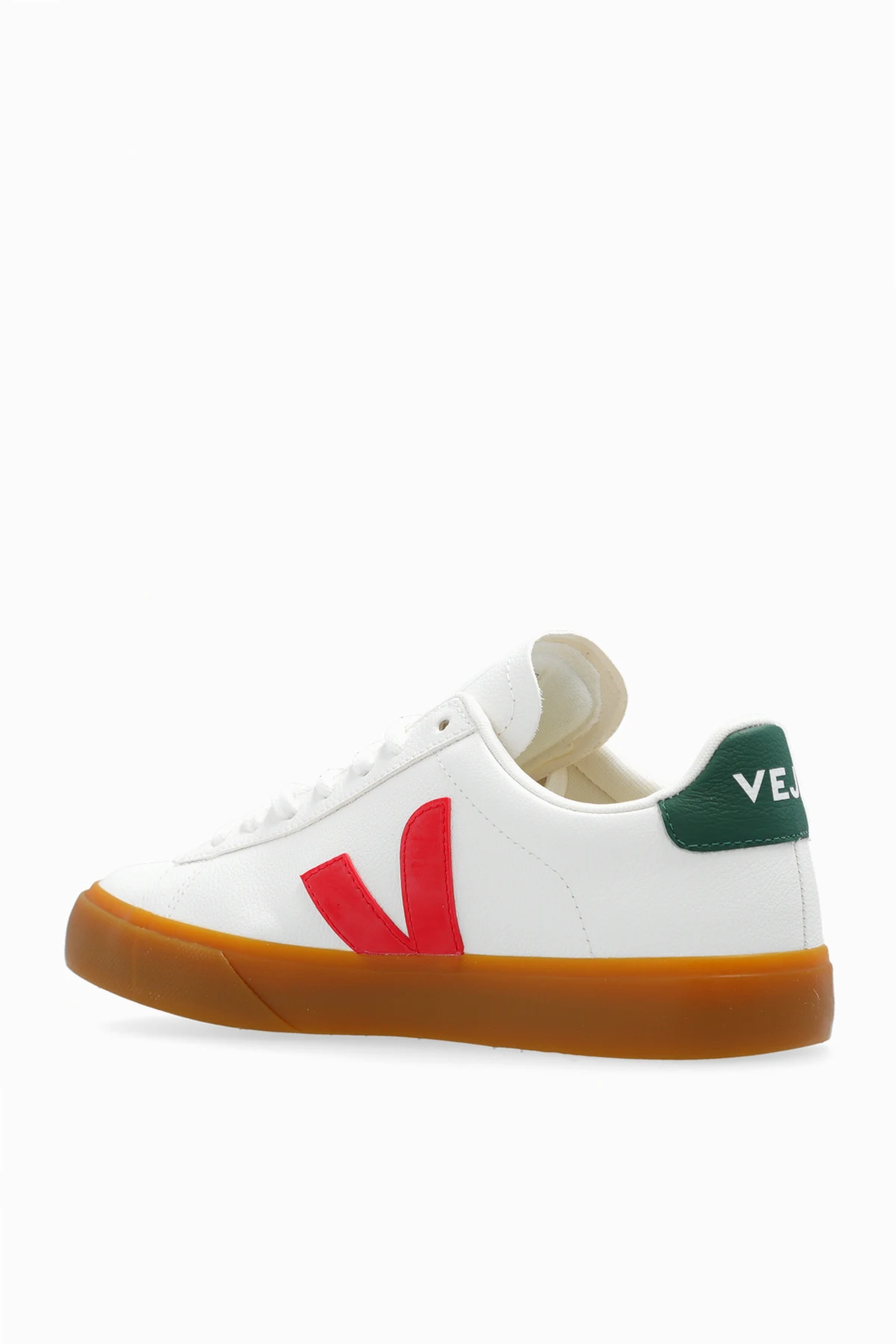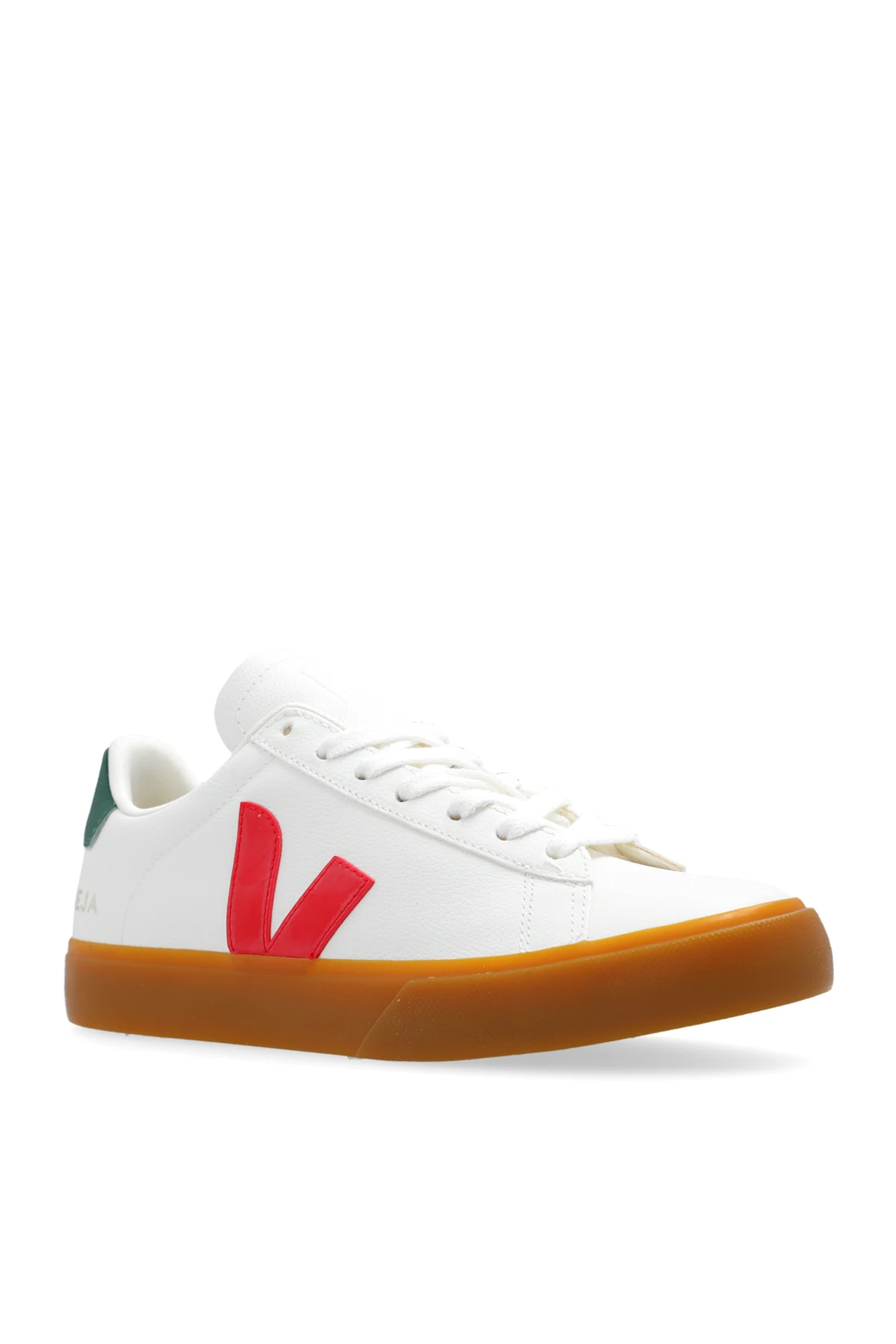 Biało-czerwono-zielone, sznurowane buty sportowe, model ‘Campo ChromeFree Leather’ Veja. Wykonane ze skory ChromeFree. Sznurowadła z bawełny organicznej. Z boku naszywka w kształcie litery ‘V’. Na języku i z tyłu logo. Wewnątrz materiał z recyklingu. Wkładka z gumy amazońskiej, trzciny cukrowej, pianki EVA pochodzącej z recyklingu i bawełny organicznej. Brązowa podeszwa wykonana z gumy amazońskiej, krzemionki, gumy z recyklingu, gumy syntetycznej i innych materiałów.