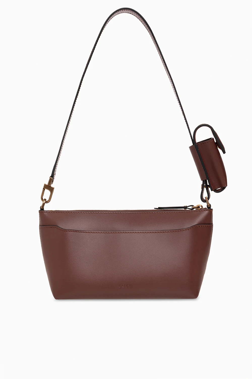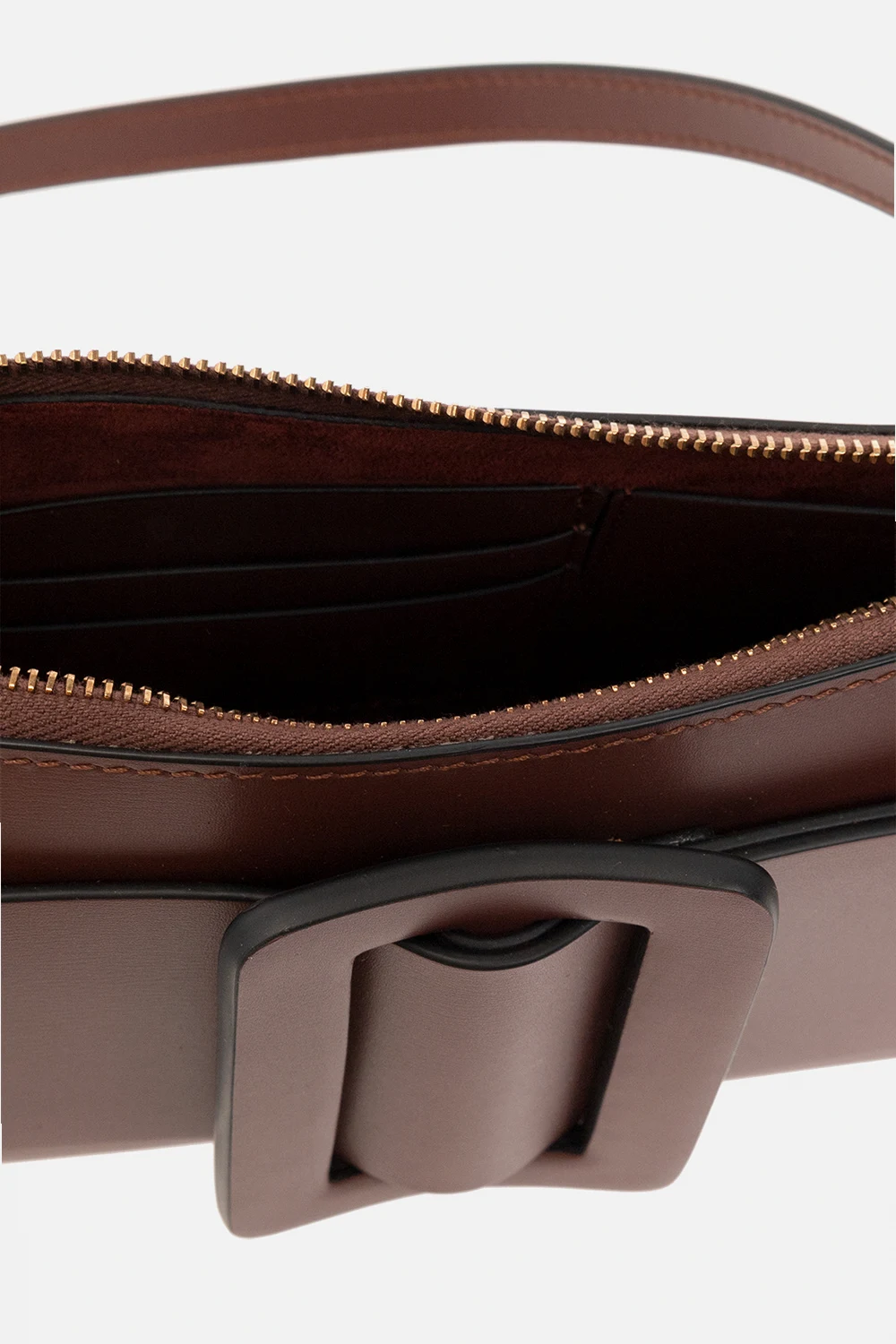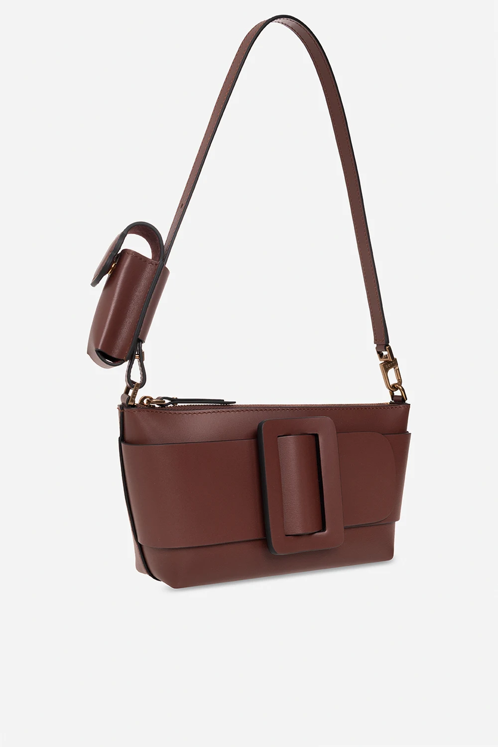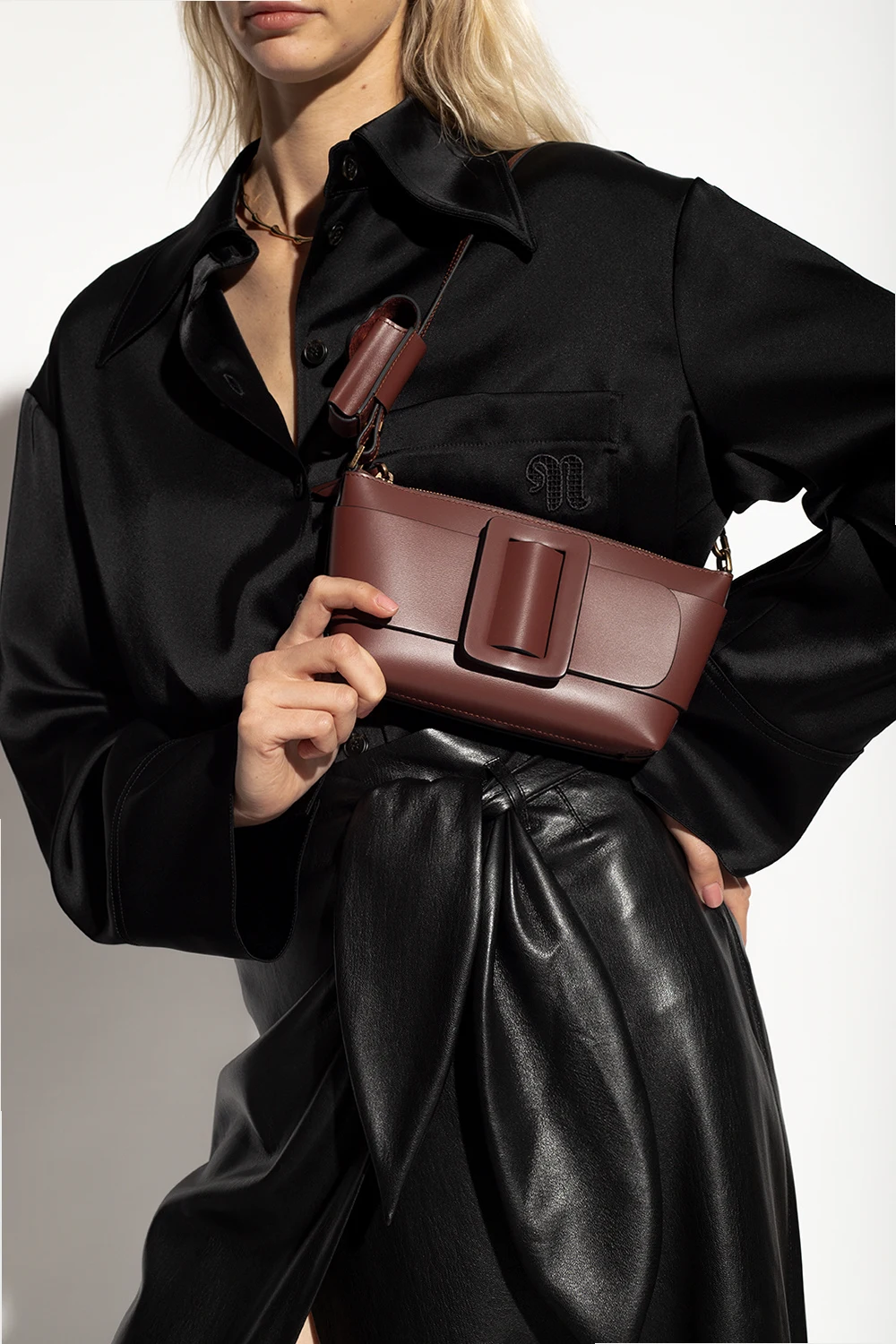 Bordowa torba na ramię, model ‘Buckle Pouchette’ BOYY. Wykonana z cielęcej skóry. Zamykana na zamek. Z przodu dekoracyjna klamra pokryta skórą. Z tyłu wsuwana kieszeń. Odpinany pas na ramię z wąską saszetką zamykaną na zatrzask. Zamszowe wnętrze. Wewnątrz komora i cztery miejsca na karty. Metalowe elementy w kolorze postarzanego złota.