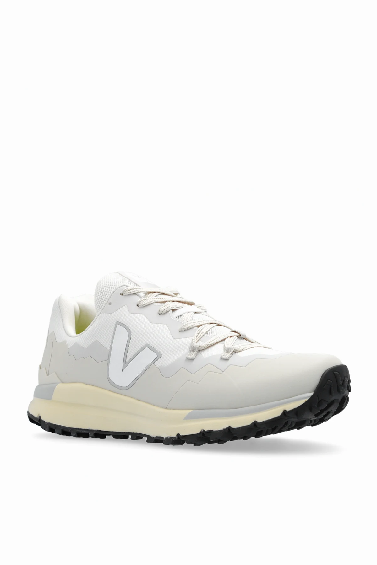 Biało-kremowo-szare, sznurowane buty sportowe, model ‘Fitz Roy Trek-Shell’ Veja. Cholewka wykonana z Trek-Shell*. Ozdobione panelami z TPU i aplikacją w kształcie litery ‘V’. Wkładka i podeszwa środkowa wykonane z pianki EVA na bazie biologicznej- z trzciny cukrowej, materiału z recyklingu i gumy amazońskiej. Czarna, gumowa podeszwa z mieszanki gumy amazońskiej, krzemionki mineralnej i kauczuku. Wyprodukowane w Brazylii.