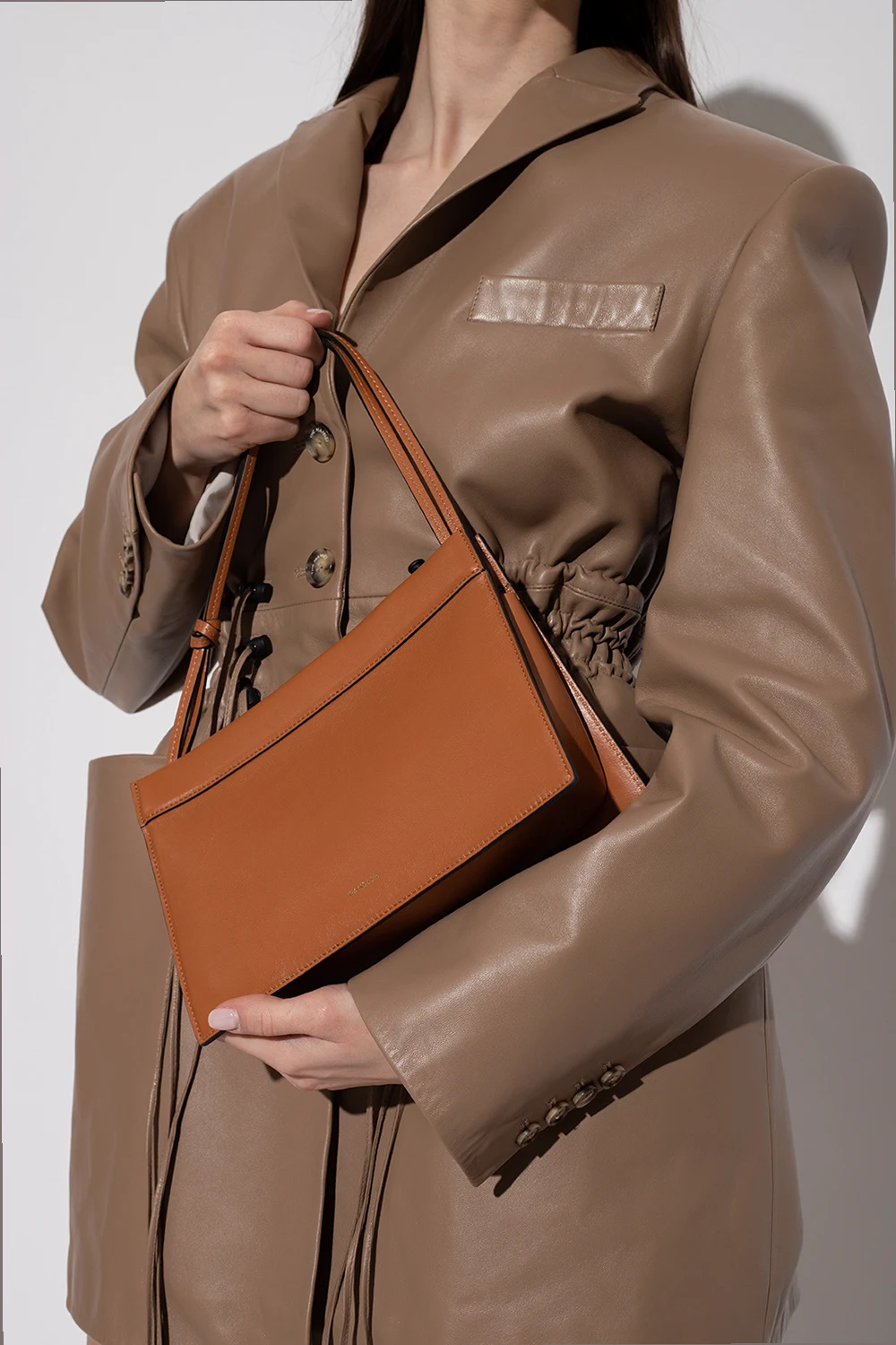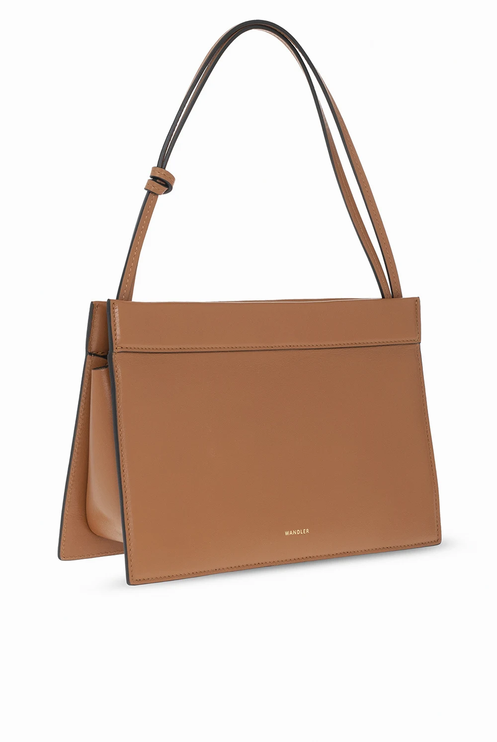 Brązowa torba do ręki, model 'Hannah' Wandler. Wykonana z cielęcej skóry. Zamykana na magnetyczne zatrzaski. Z przodu ozdobiona nadrukowanym logo w kolorze złotym. Podwójna rączka z ozdobnym węzłem. Wnętrze z zamszu w kolorze jasnobrązowym. Wewnątrz komora. Wykonana ręcznie we Włoszech.