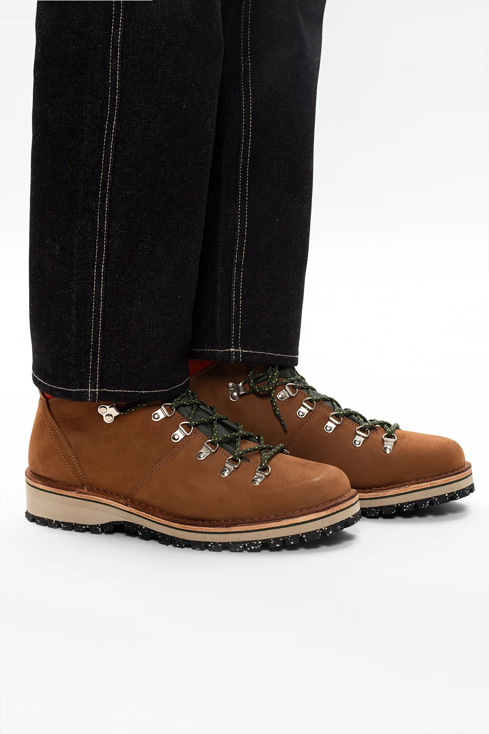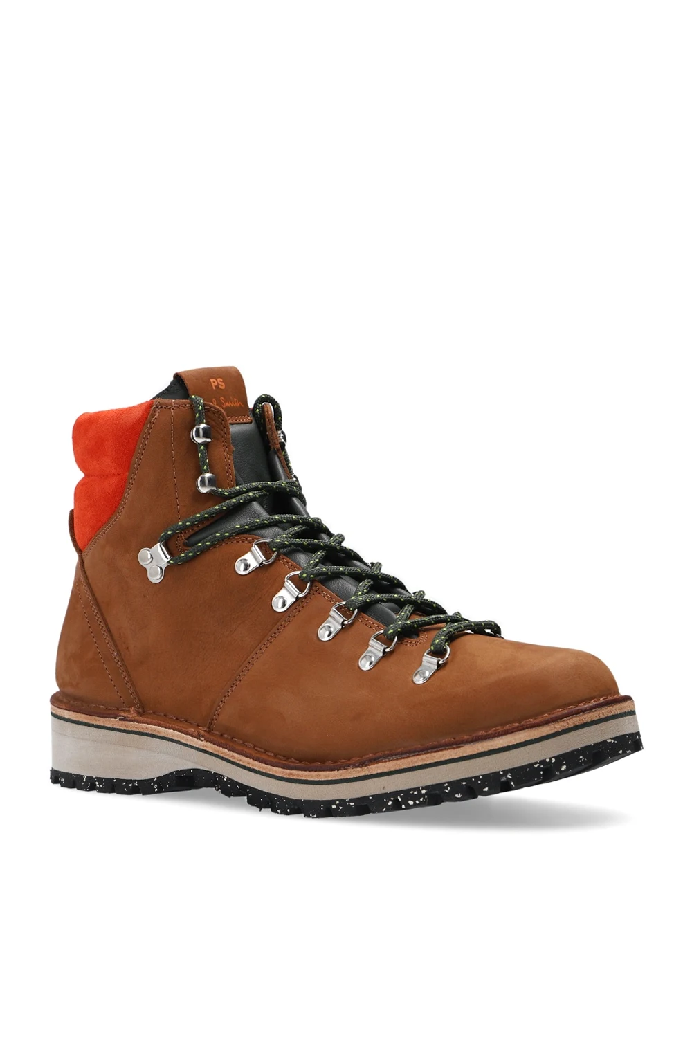Brązowe, sznurowane trapery, model ‘Ash’ PS Paul Smith. Wykonane ze skóry. Z tyłu zamszowa wstawka w kolorze pomarańczowym. Czarno-beżowa, gumowa podeszwa. Metalowe elementy w kolorze srebrnym.