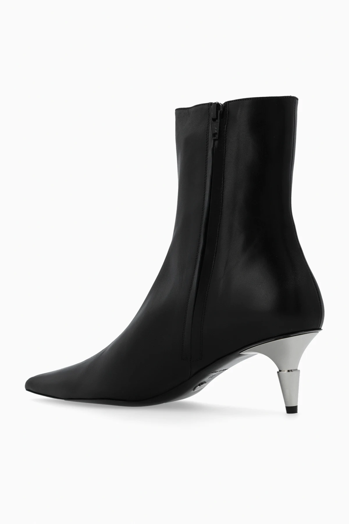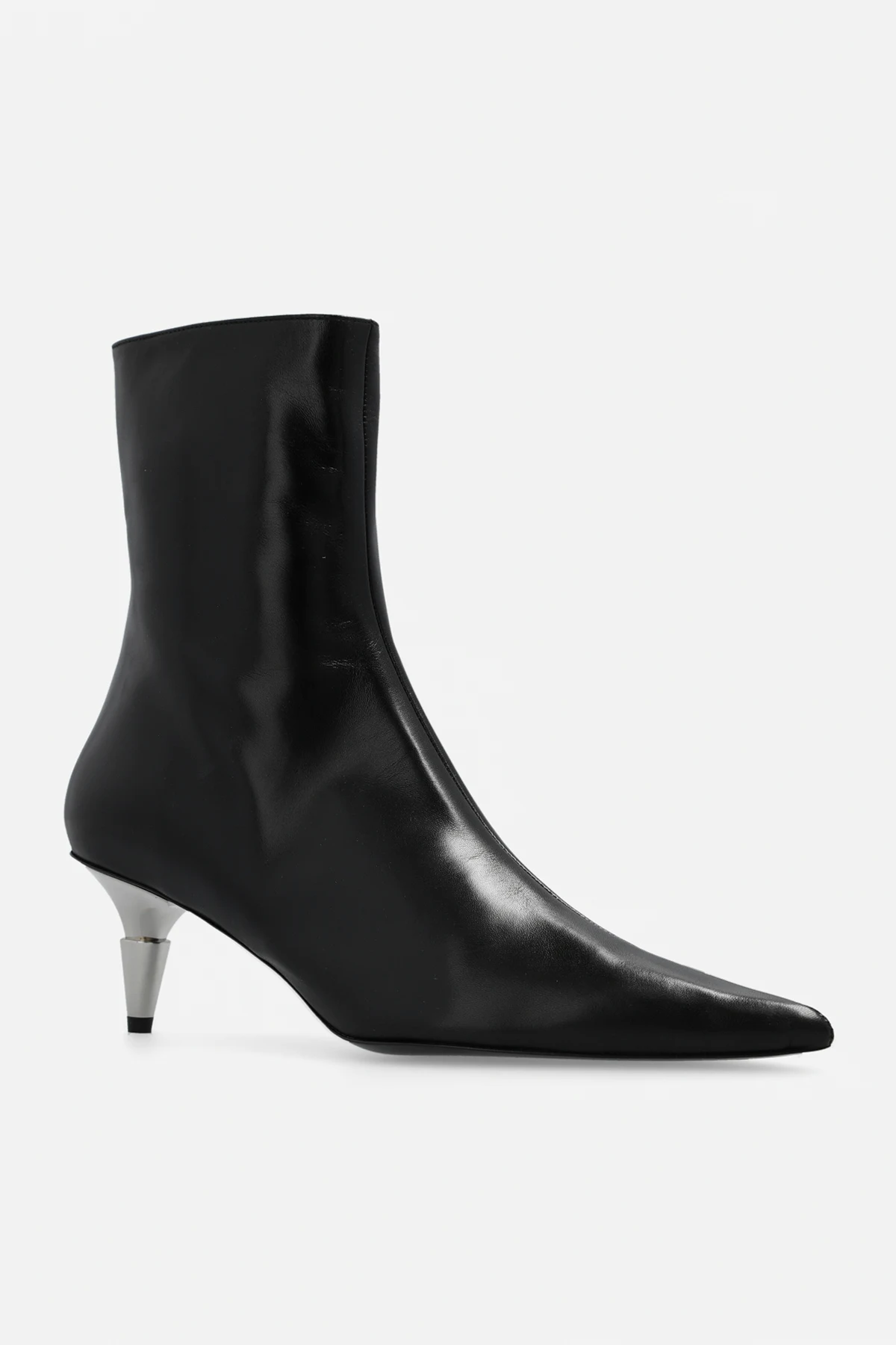 Czarne botki na obcasie, model ‘Spike’ Proenza Schouler. Wykonane ze skóry. Zapinane z boku na zamek. Nosek w szpic. Dekoracyjny obcas w kolorze srebrnym. Czarna, skórzana podeszwa.