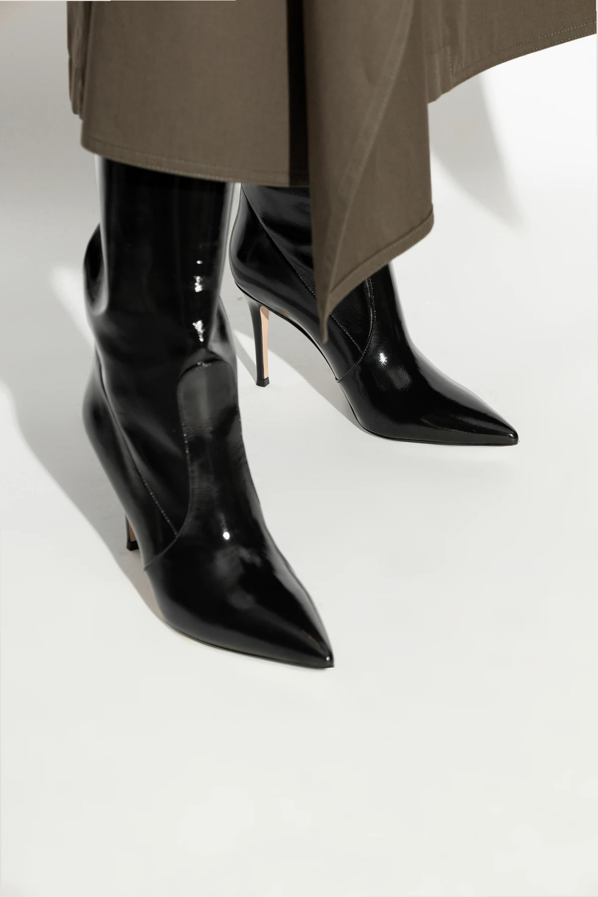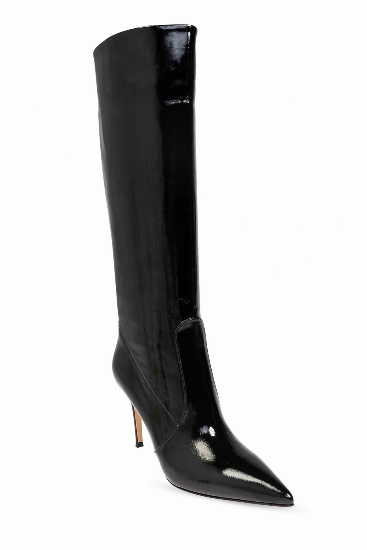 Wykonane z błyszczącego, lakierowanego materiału, kozaki "Hansen" zachwycają swoim luksusowym wyglądem. Klasyczny fason z wysoką cholewką sięgającą do kolana oraz smukły, szpiczasty nosek dodają im niepowtarzalnego uroku. Dominujący czarny kolor sprawia, że są one niezwykle uniwersalne i łatwe do zestawienia z różnorodnymi stylizacjami.