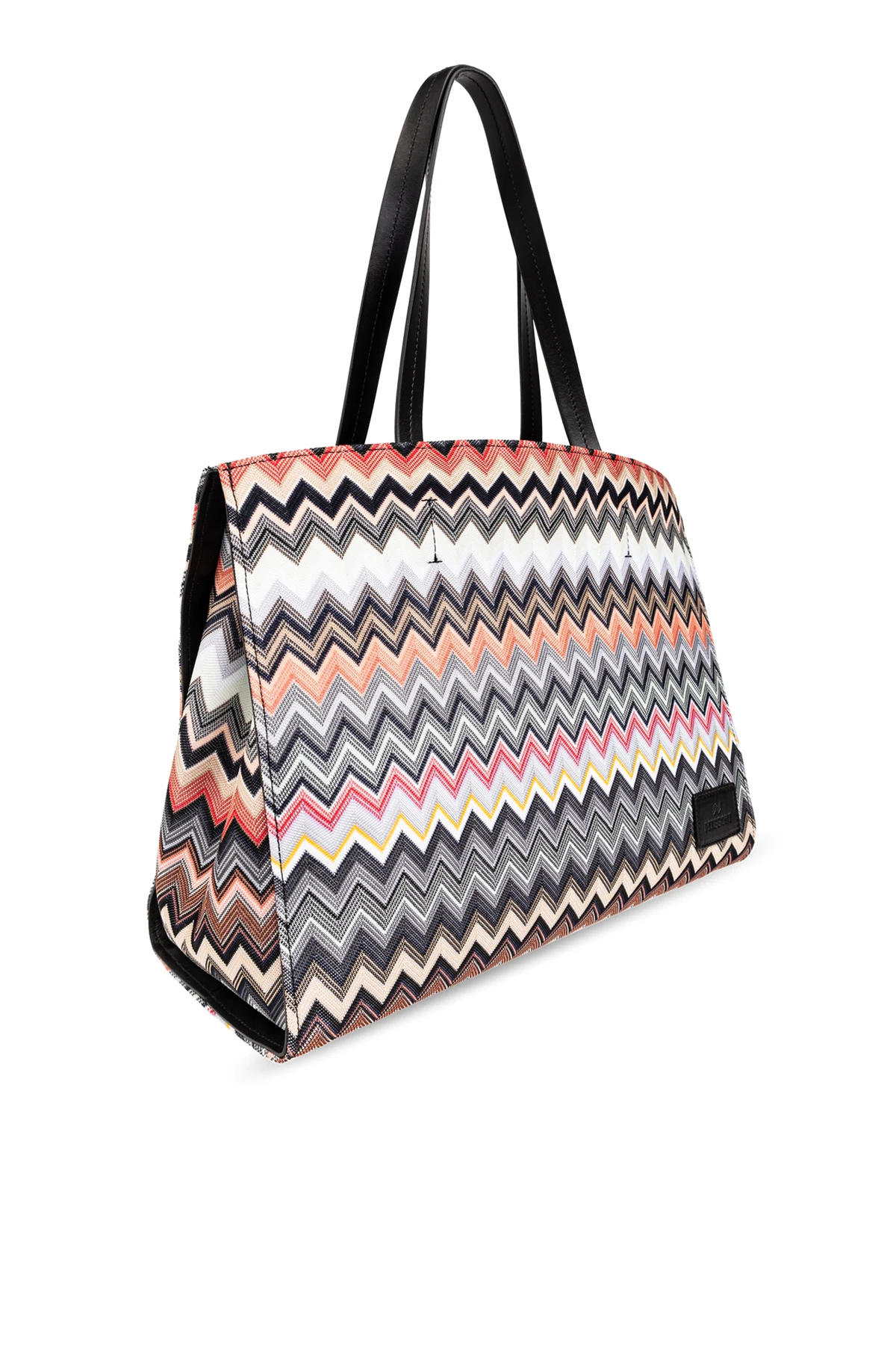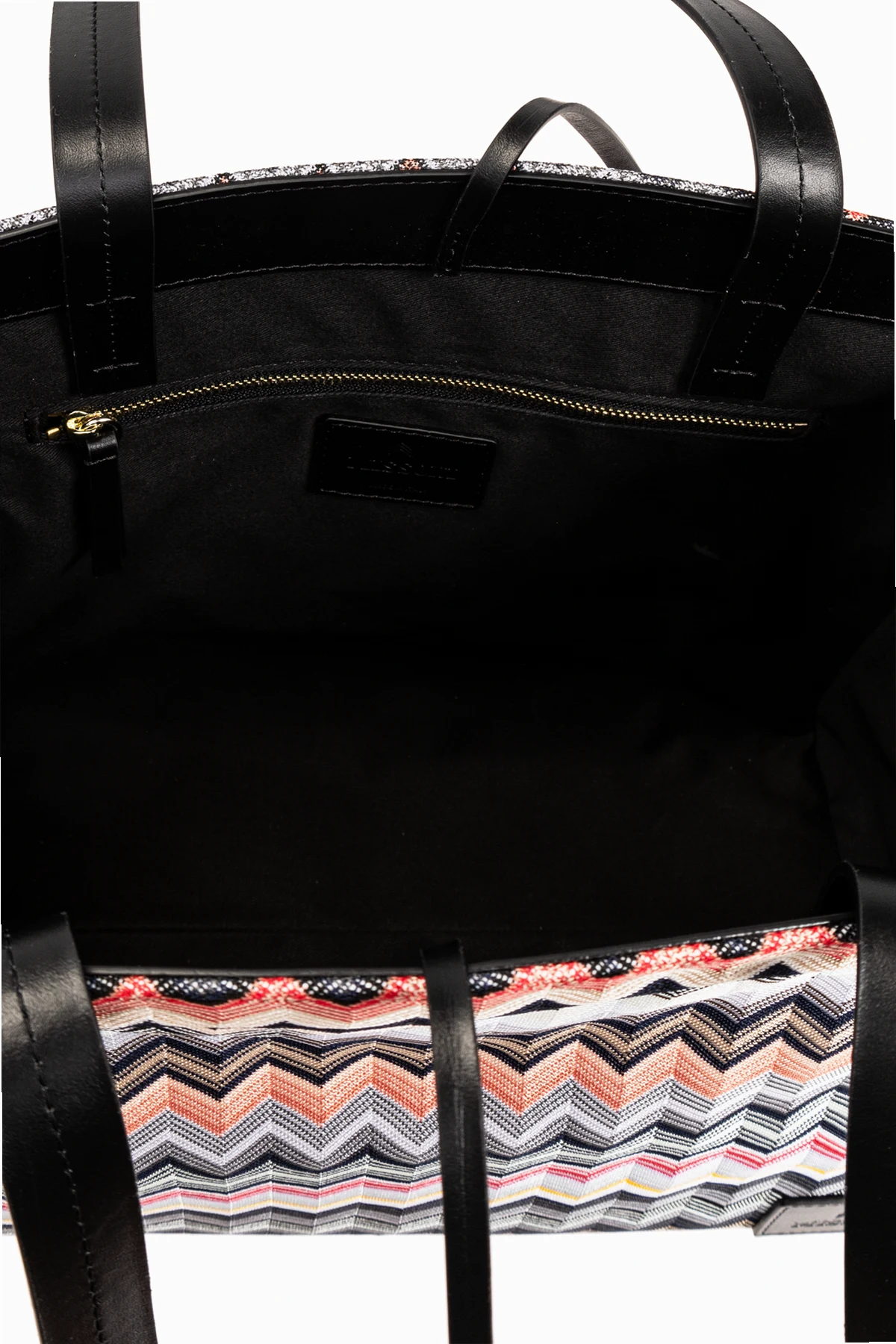 Projekt charakteryzuje się prostokątną formą z płaskim dnem, co gwarantuje stabilność i przestronność wnętrza, wyściełanego elegancką czarną podszewką. Wewnątrz, oprócz głównej komory, znajdują się funkcjonalne kieszenie, w tym jedna z bezpiecznym zamknięciem na zamek, idealne do przechowywania drobnych, cennych przedmiotów. Detale w kolorze złotym oraz subtelna, prostokątna metka z logo Missoni, umieszczona w dolnym rogu torby, dodają całej konstrukcji wyrafinowanego charakteru.