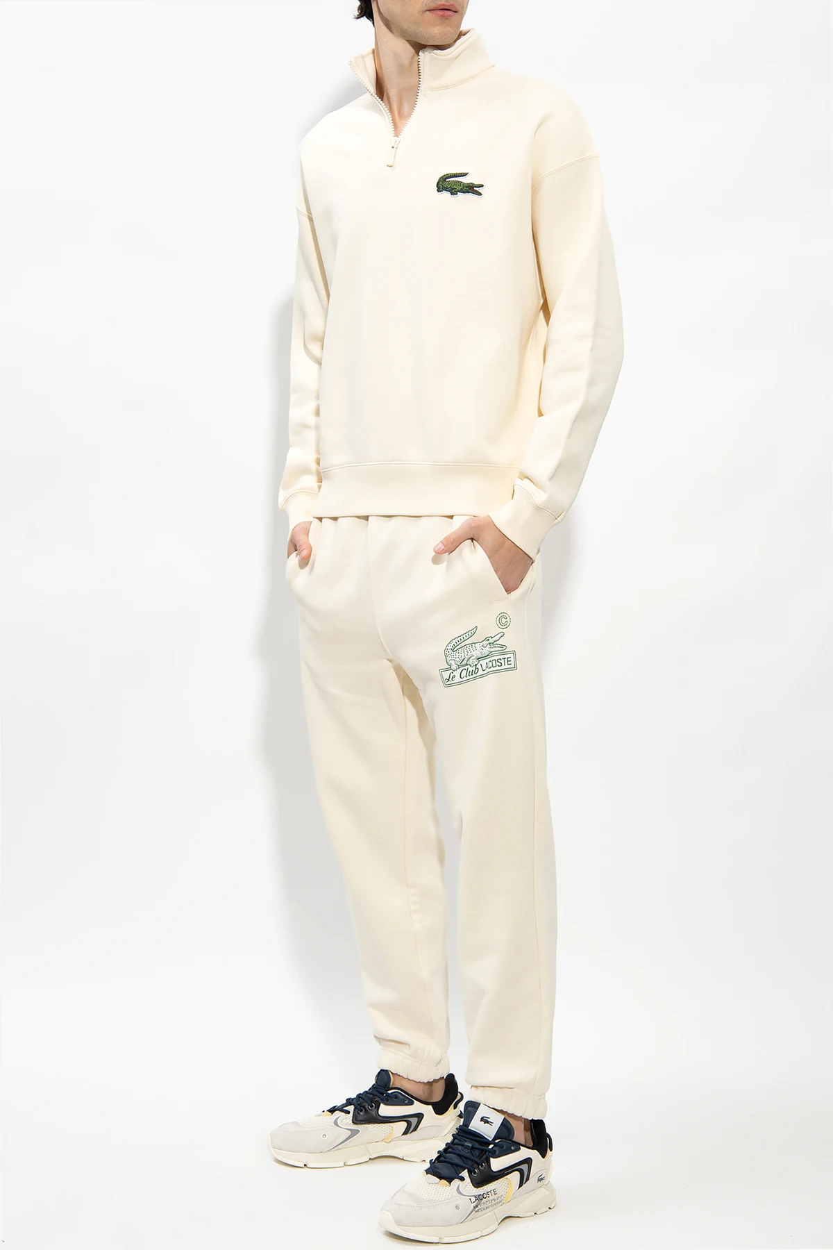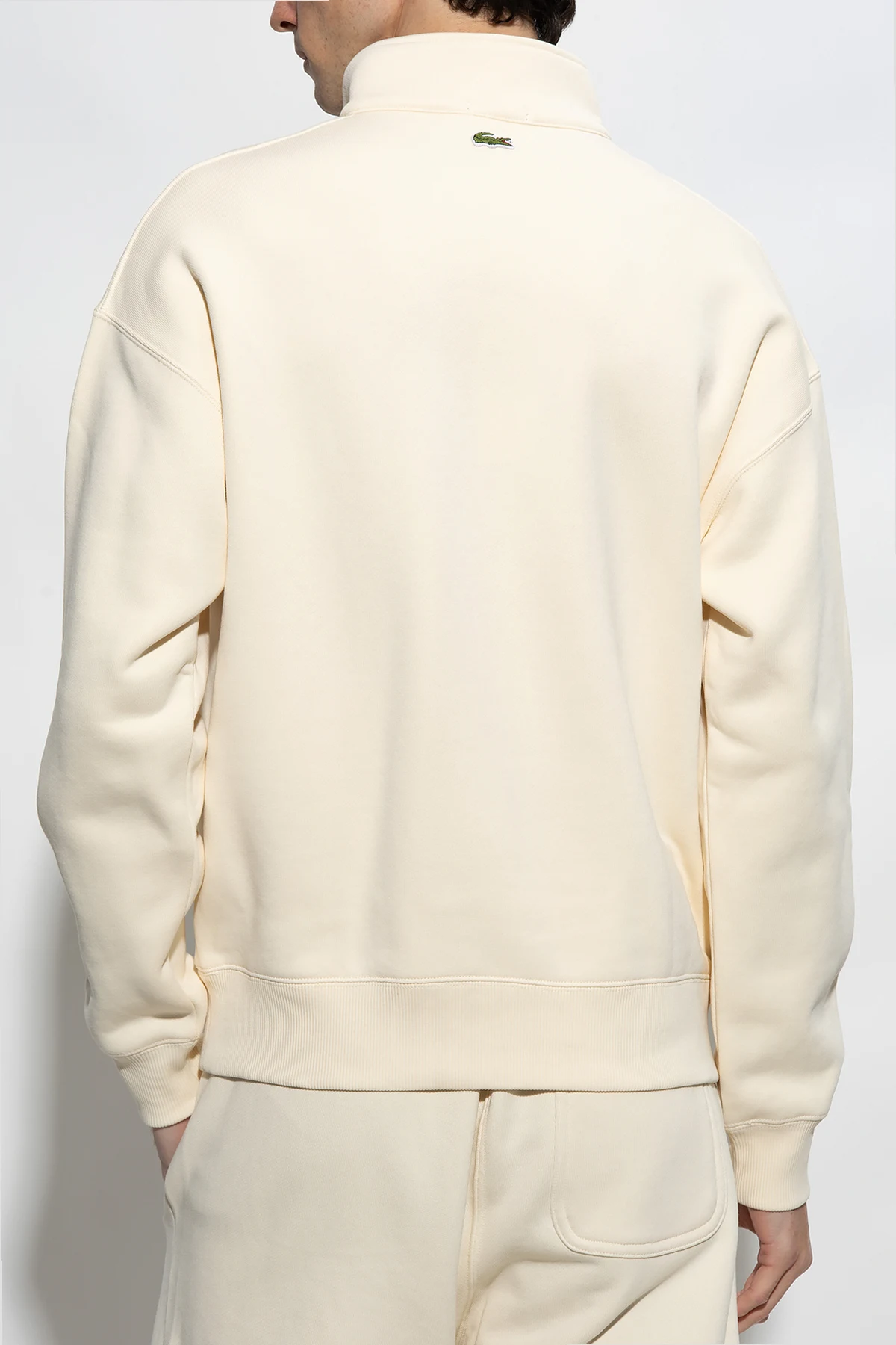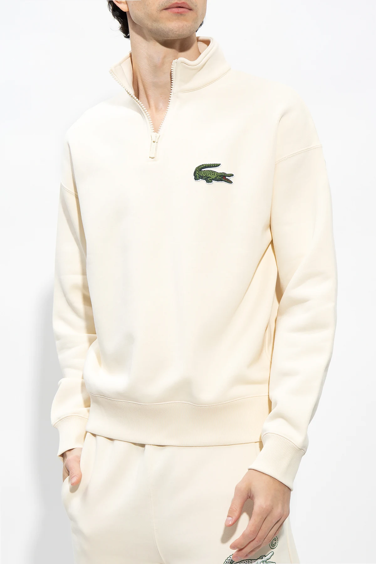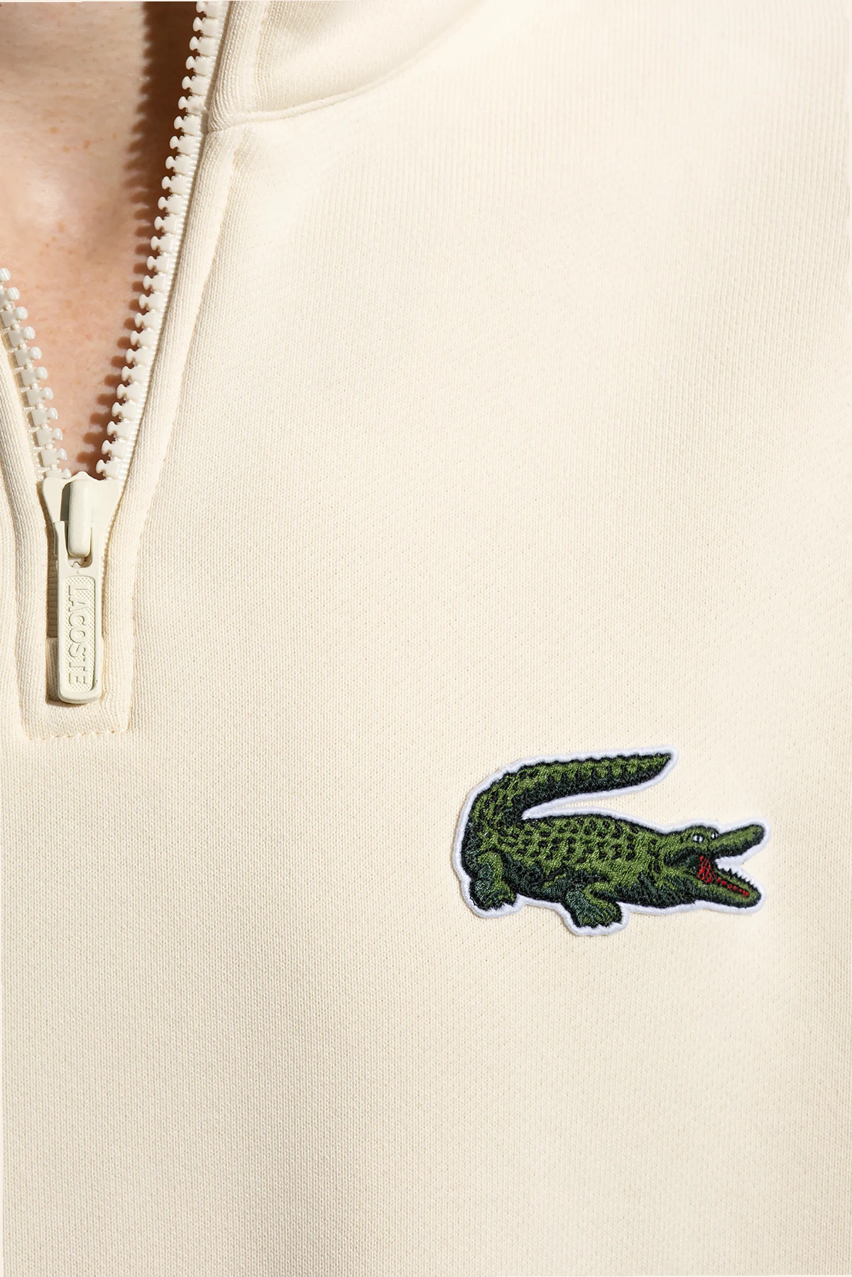 Kremowa bluza o luźnym kroju Lacoste. Wykonana z bawełny organicznej. Dekolt wykończony stójką zapinaną na zamek. Z przodu oraz z tyłu naszywka w kształcie logo w kolorze zielonym. Długie rękawy oraz dół wykończone ściągaczem.