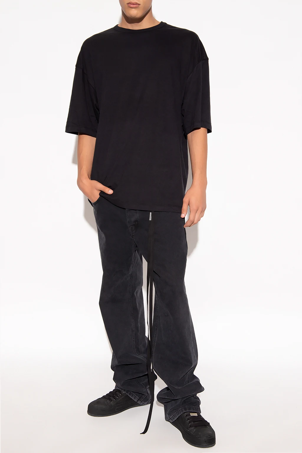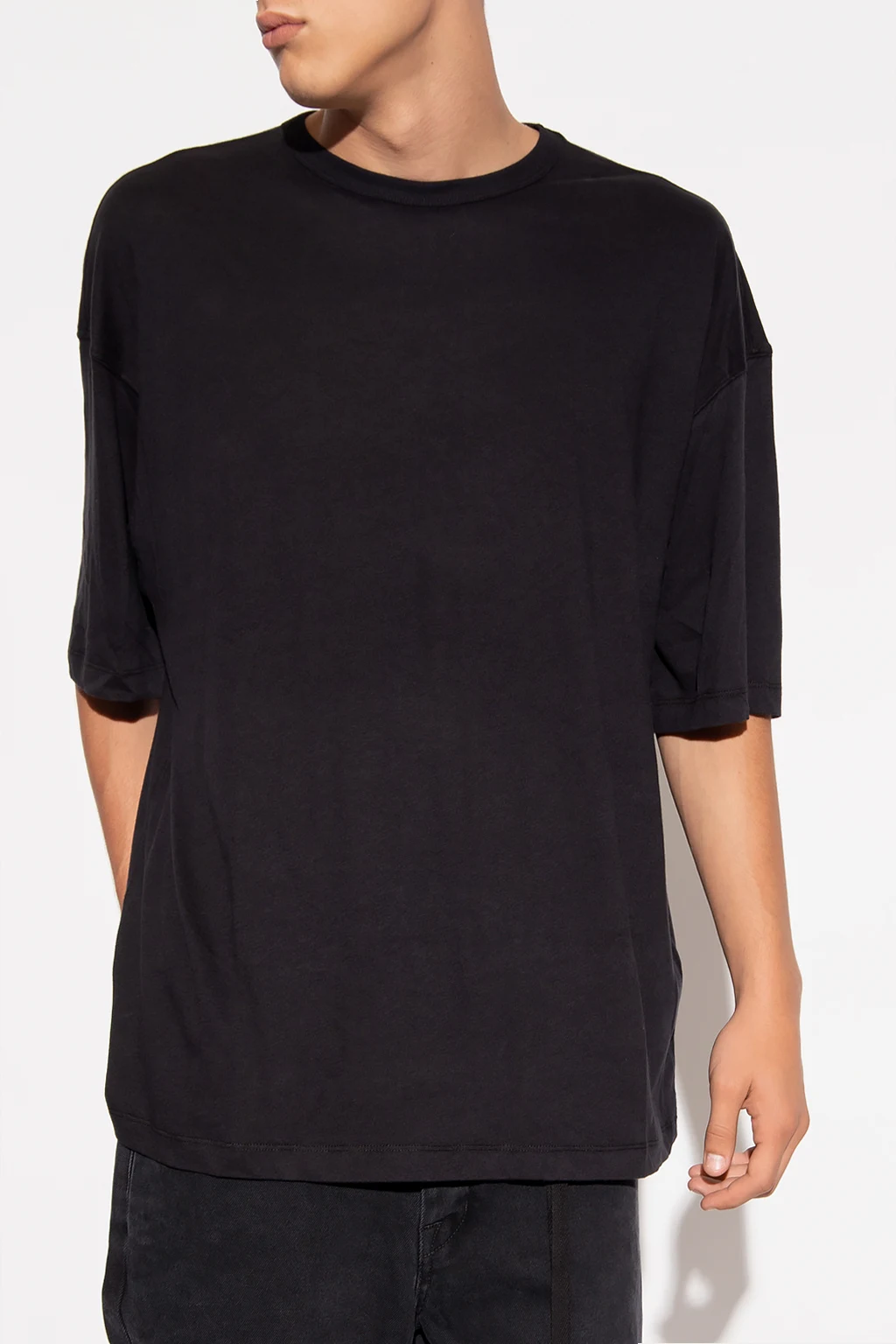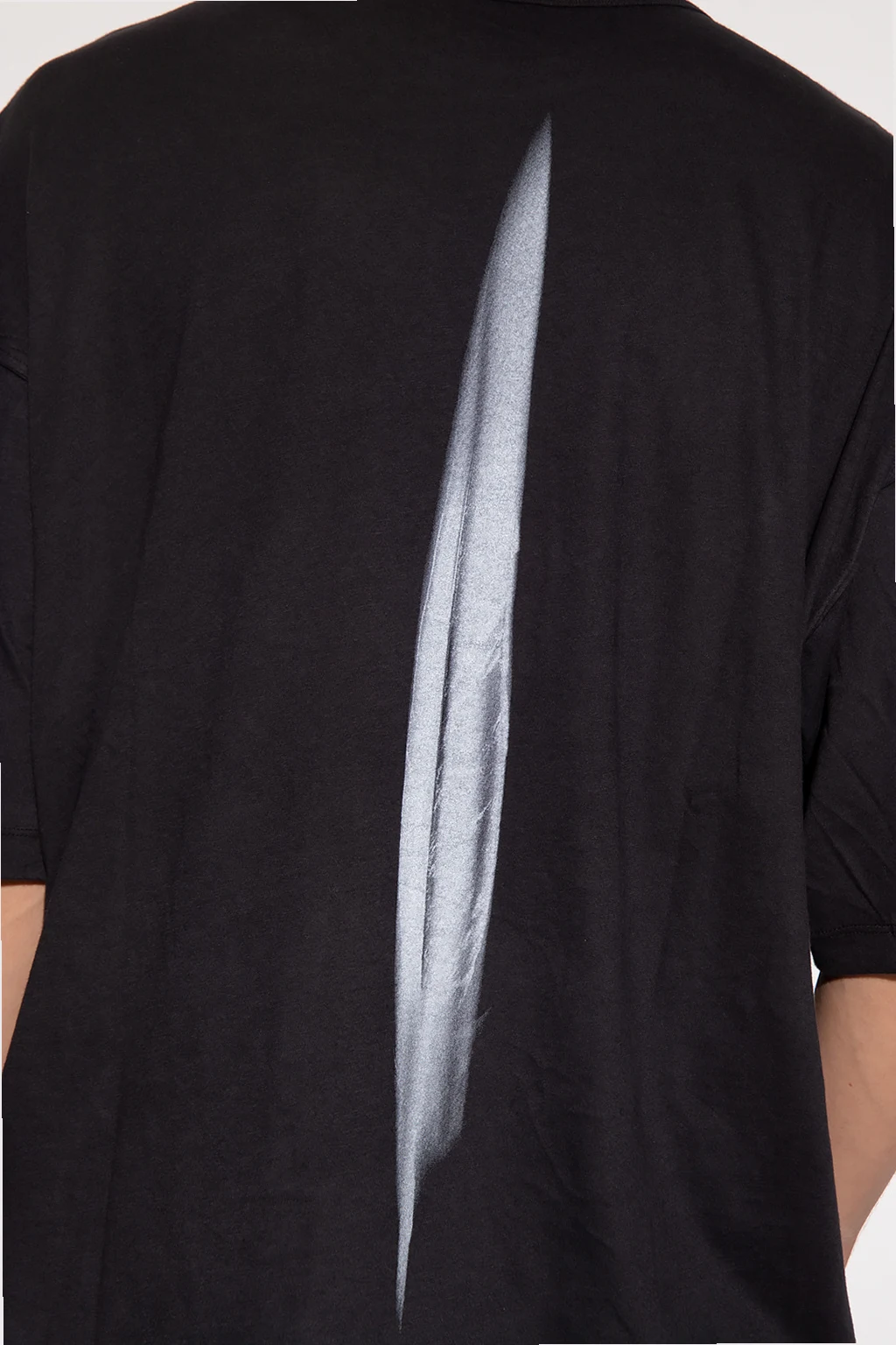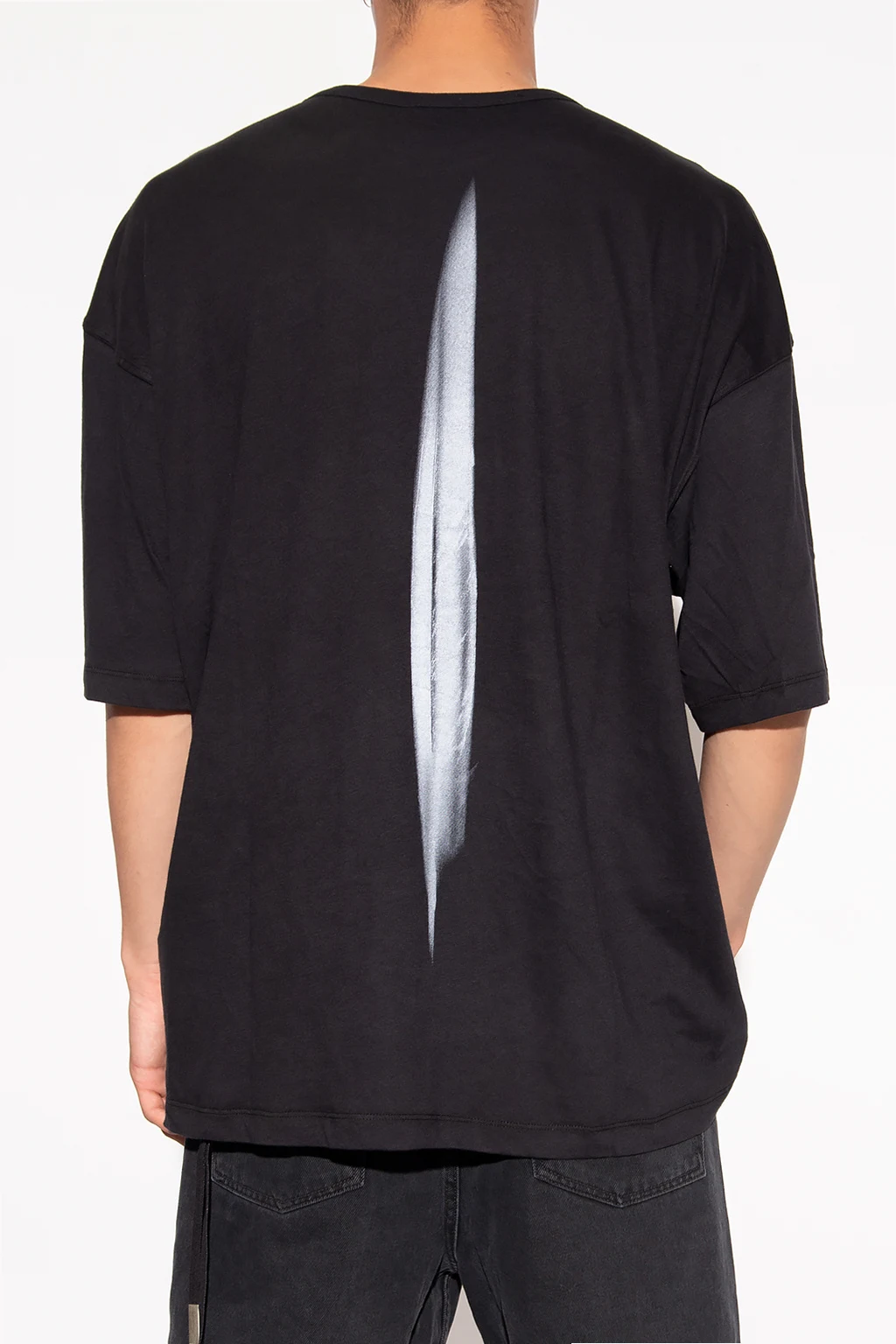 Czarny t-shirt Ann Demeulemeester. Wykonany z bawełny. Ozdobiony nadrukiem w kolorze szaro-białym. Okrągły dekolt wykończony ściągaczem. Krótkie rękawy.