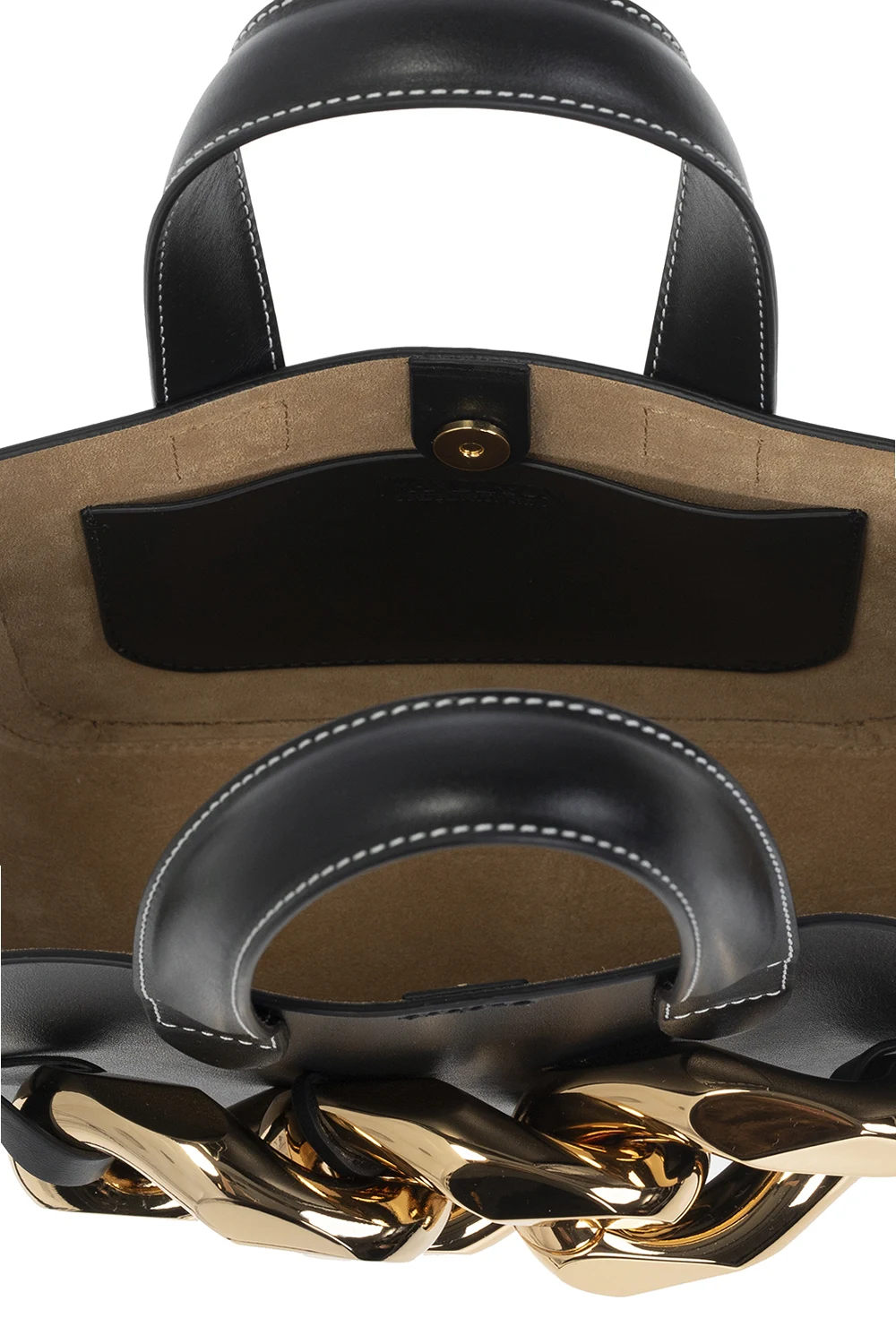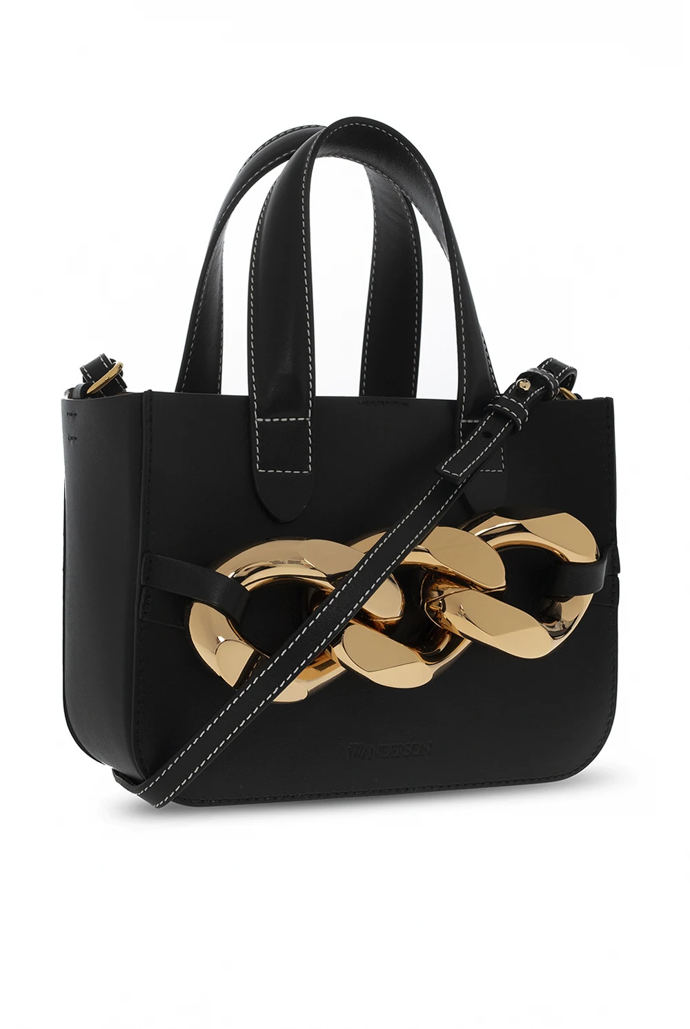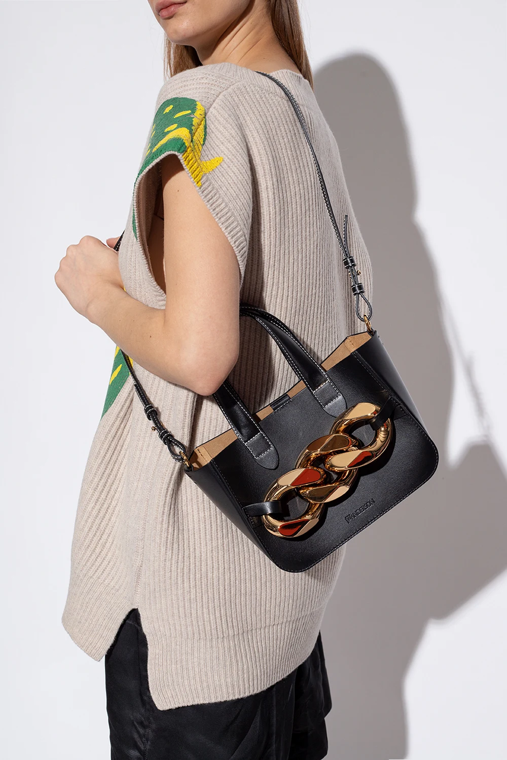 Czarna torba na ramię ‘Mini Chain’ JW Anderson. Wykonana ze skóry krowiej. Zamykana na magnetyczne zapięcie. Ozdobiona aplikacją z łańcuchem. Dwie półokrągłe rączki. Pas na ramię. Wewnątrz komora i wsuwana kieszeń. Metalowe wykończenie w kolorze złotym.