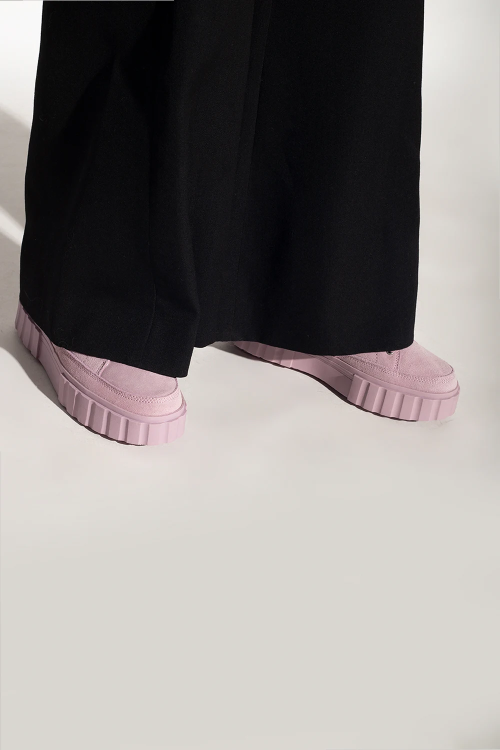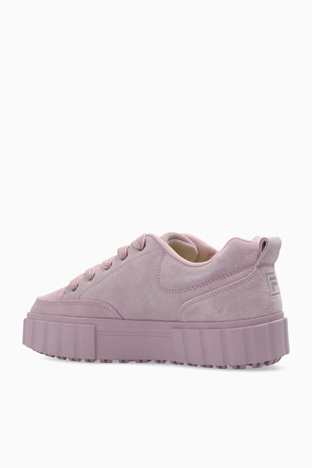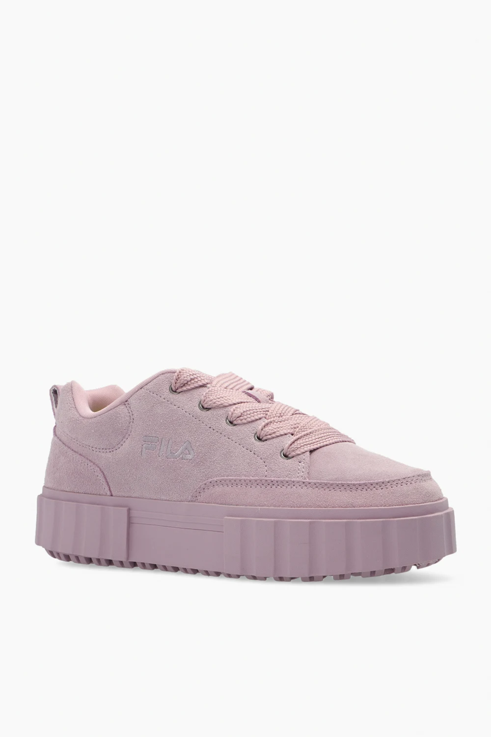 Różowe, sznurowane buty sportowe na platformie, model ‘Sandblast’ Fila. Wykonane z powlekanego zamszu. Ozdobione wyszytym logo. Różowa, gumowa podeszwa.