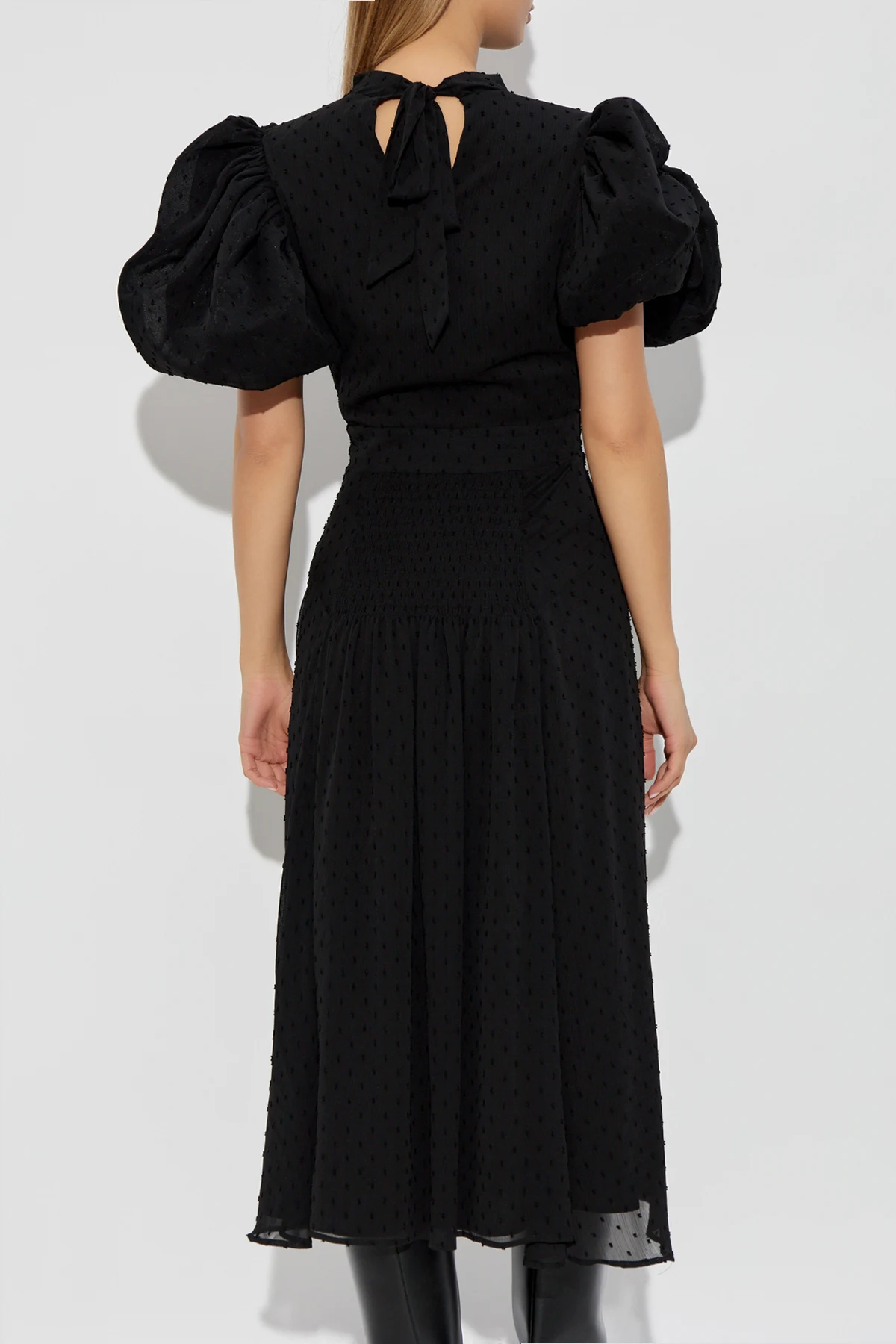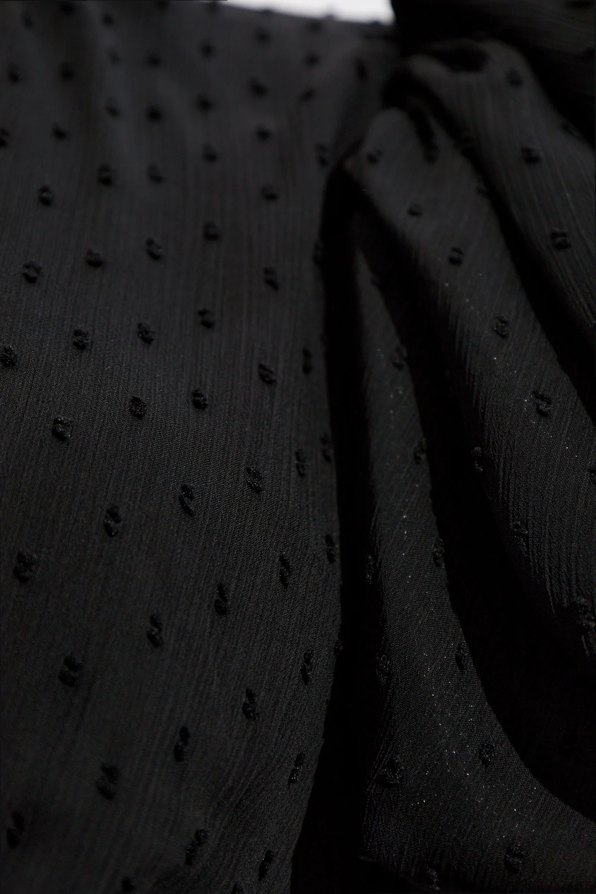 Wykonana z lekkiego i przewiewnego materiału, sukienka charakteryzuje się subtelnym wzorem w drobne, wypukłe kropki, które dodają jej niepowtarzalnego uroku. Wyraźnie zaznaczona talia podkreśla sylwetkę, a bufiaste rękawy stanowią główny element dekoracyjny, nadając kreacji elegancji i objętości.