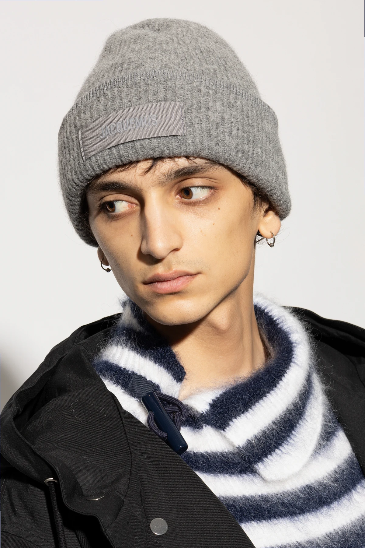 Wykonana z najwyższej jakości wełny , czapka urzeka swoim prążkowanym wzorem , który dodaje jej wyjątkowej tekstury i stylu. Na przodzie znajduje się subtelna naszywka z napisem "JACQUEMUS", harmonijnie komponująca się z dominującym szarym kolorem czapki.