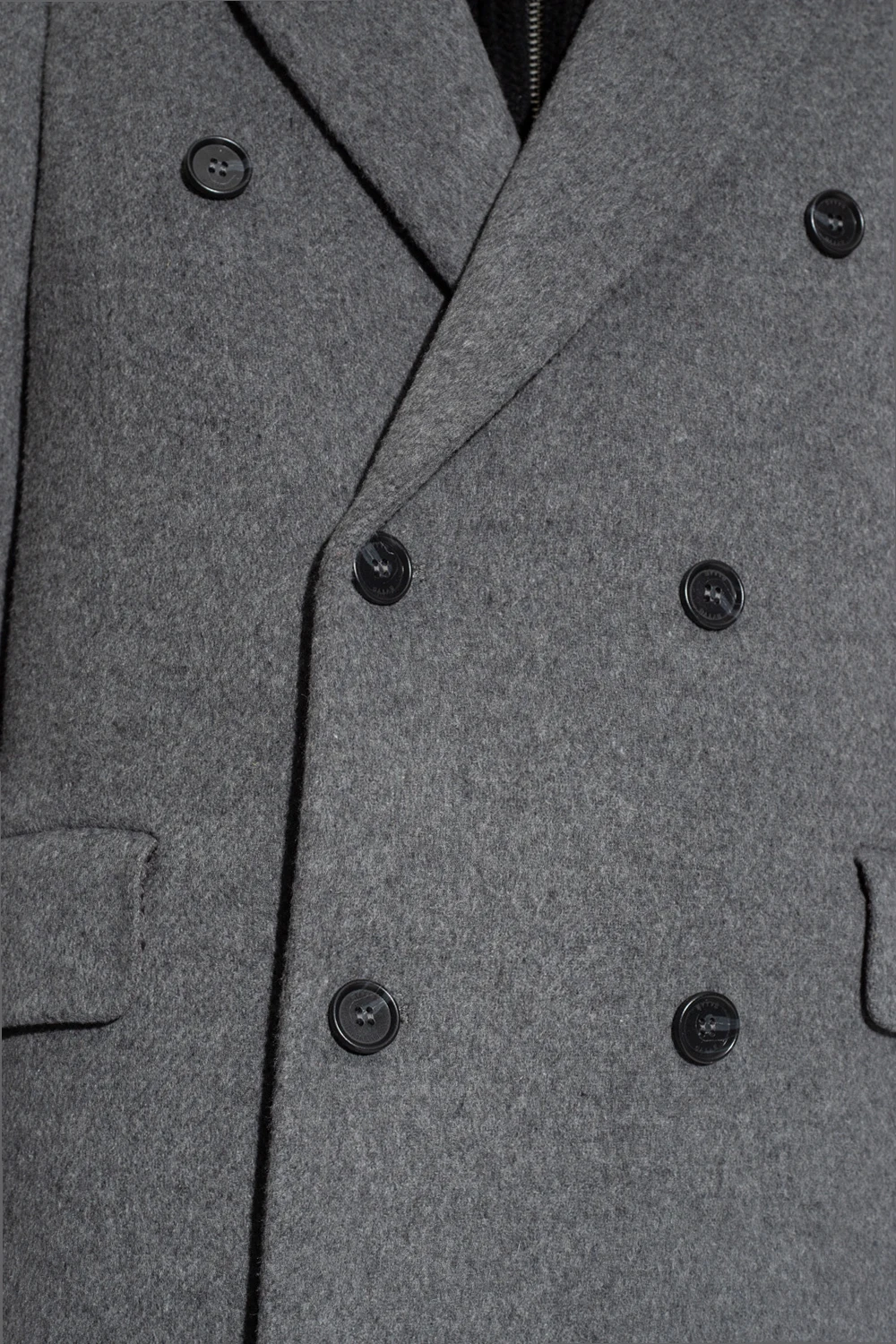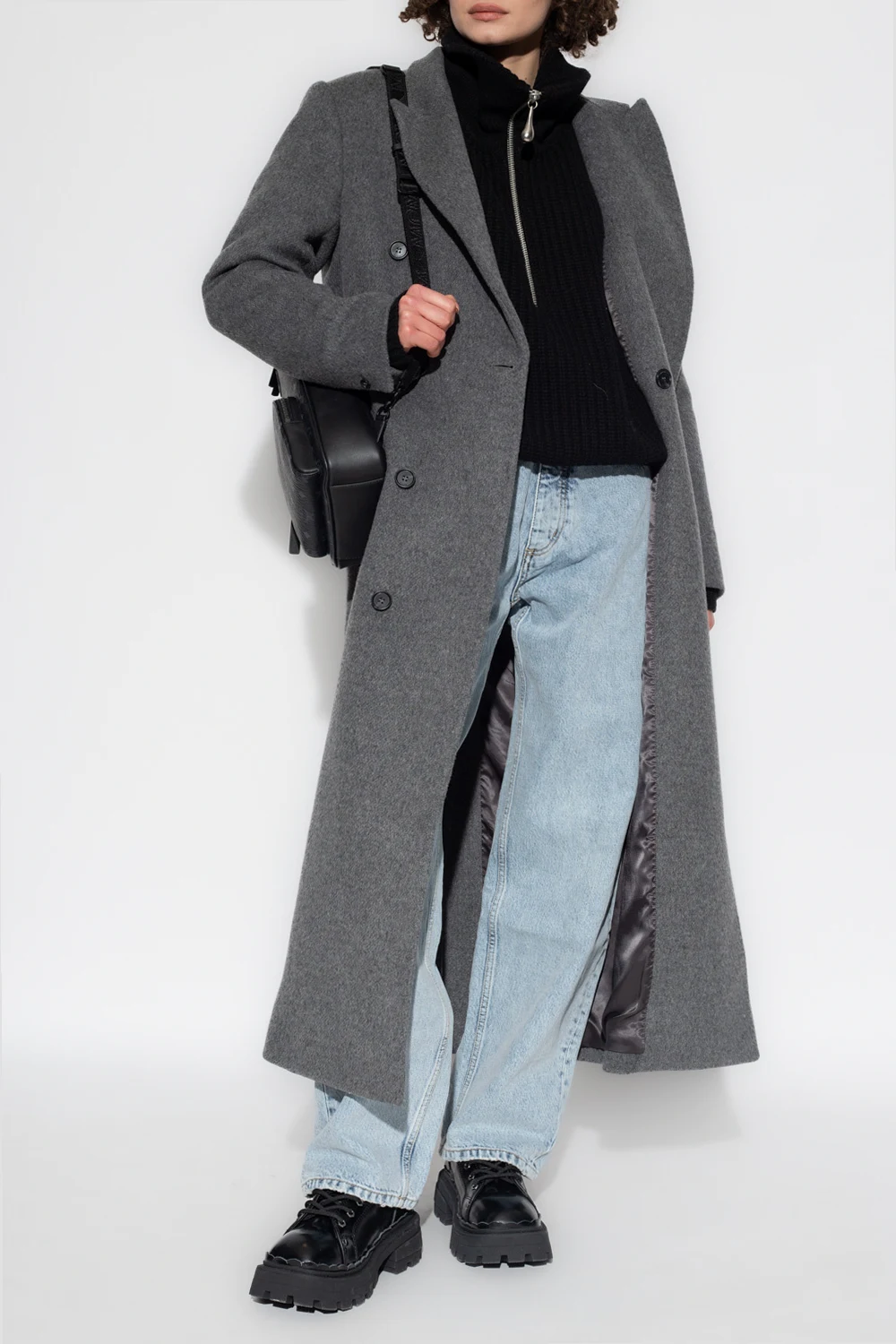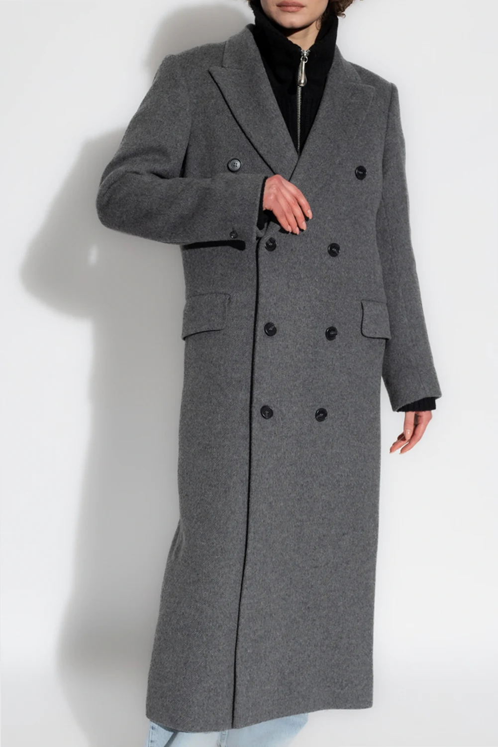 Szary, wełniany płaszcz z zamkniętymi klapami, model 'Genesis' Eytys. Dwurzędowe zapięcie. Z przodu dwie kieszenie z klapami zamykane na magnetyczne zatrzaski. Na rękawie czarna naszywka w wyszytym logo w kolorze szarym. Pojedyncze rozcięcie.