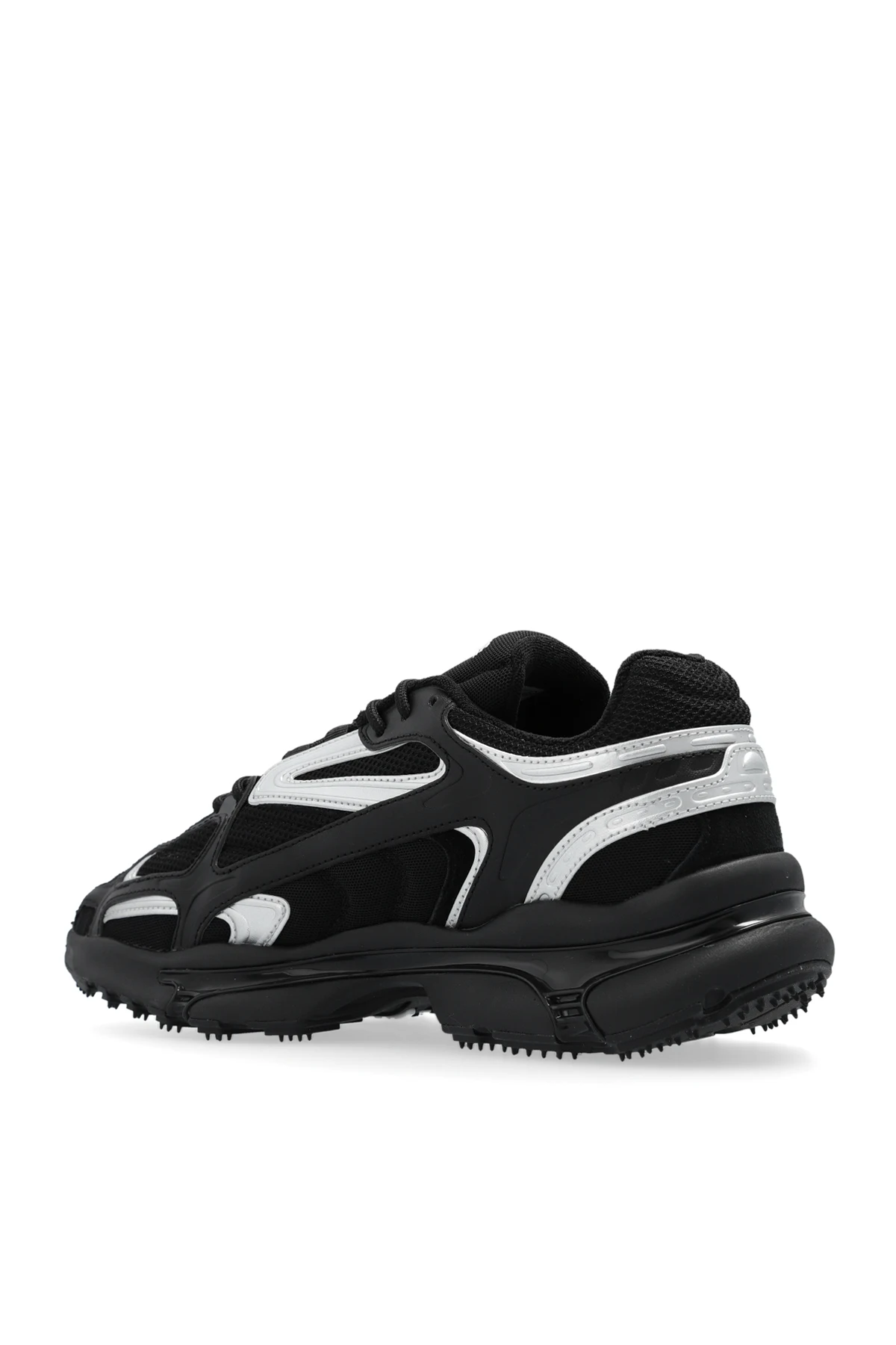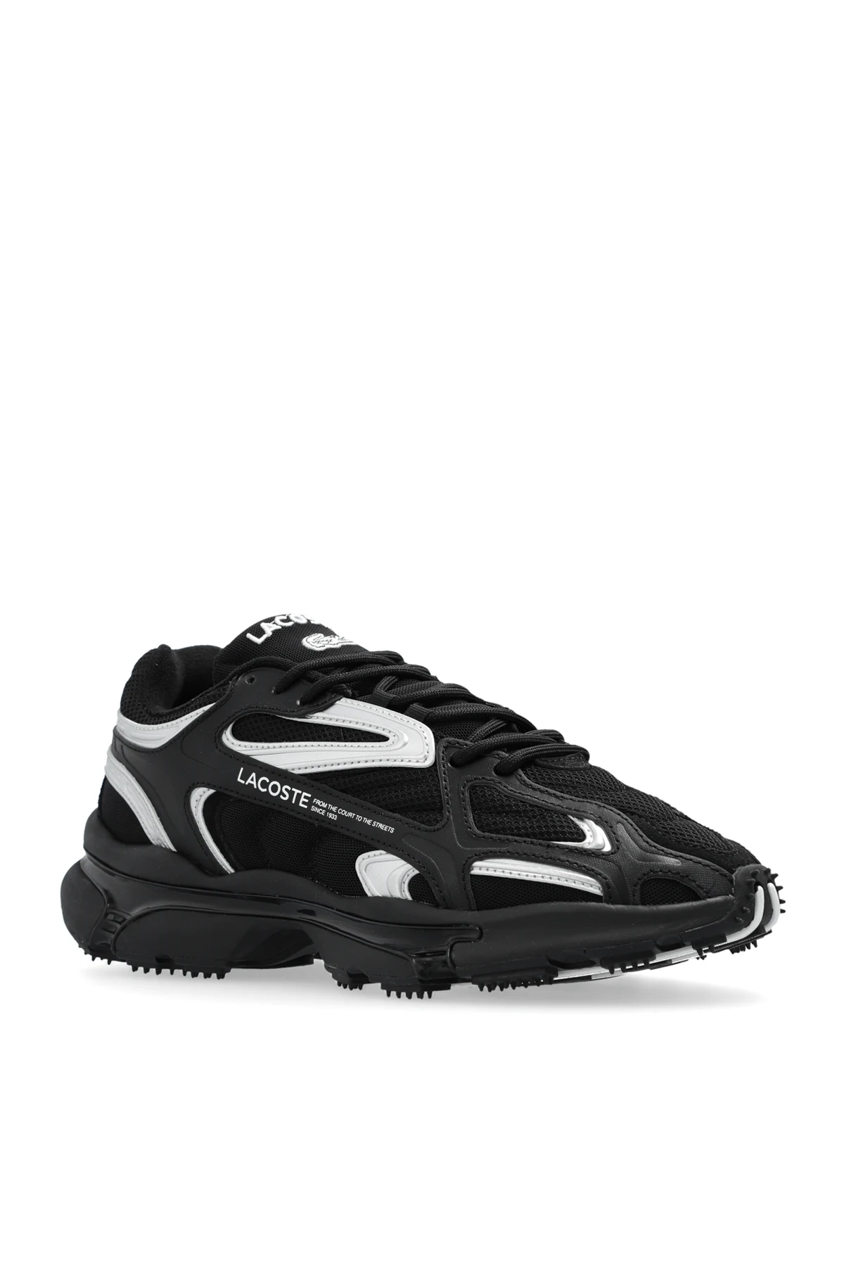 Czarne, sznurowane buty sportowe, model ‘L003’ Lacoste. Wykonane z siatki i imitacji skóry. Dekoracyjne panele w kolorze czarnym i srebrnym. Na języku wyszyte białą nicią logo. Oddychająca wkładka Ortholite®. Czarno-biała, gumowa podeszwa.