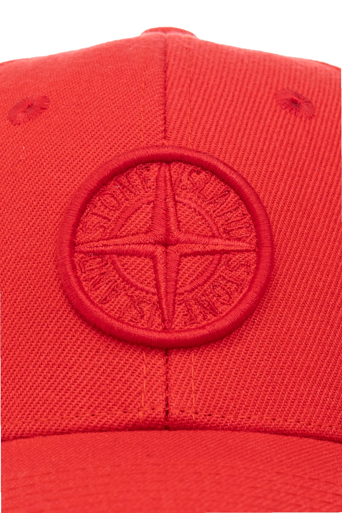 Czerwona czapka z daszkiem Stone Island Kids. Z przodu ozdobiona wyszytym logo. Z tyłu regulowany pasek z klamrą.