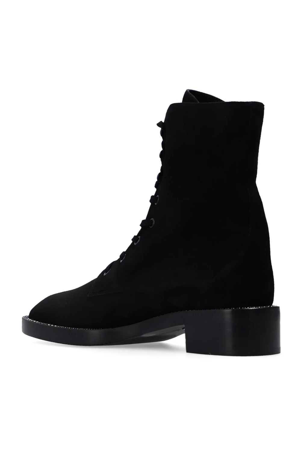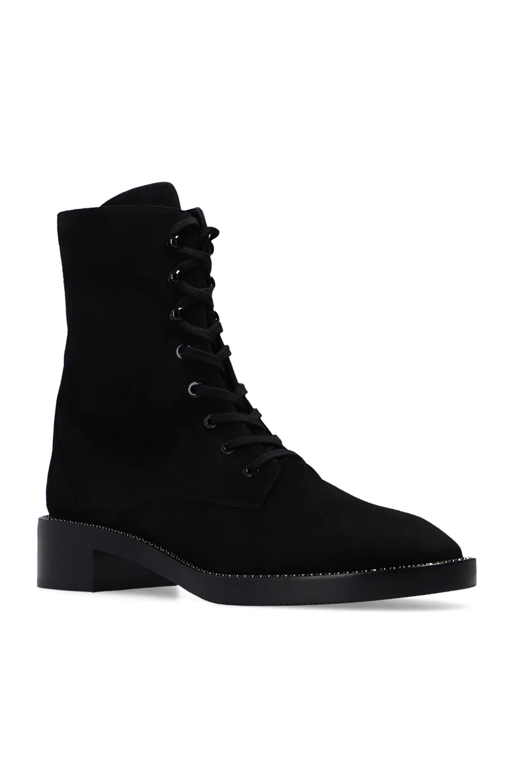 Czarne, sznurowane botki, model ‘Sondra’ Stuart Weitzman. Wykonane ze skóry. Wykończone zamszem. Ozdobione aplikacją w kolorze czarnym. Czarna, gumowa podeszwa.