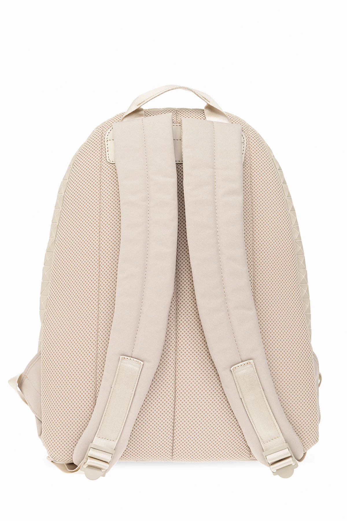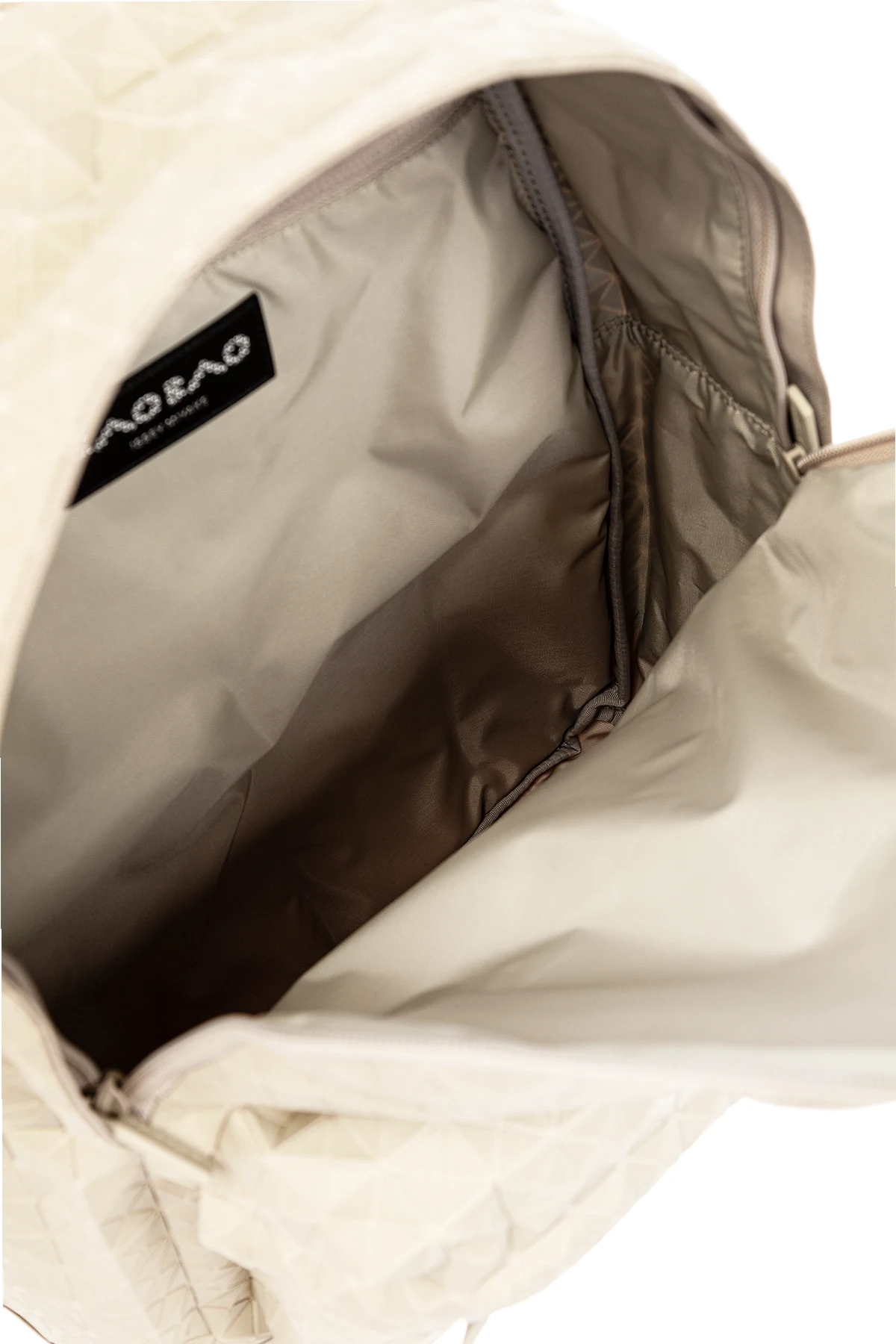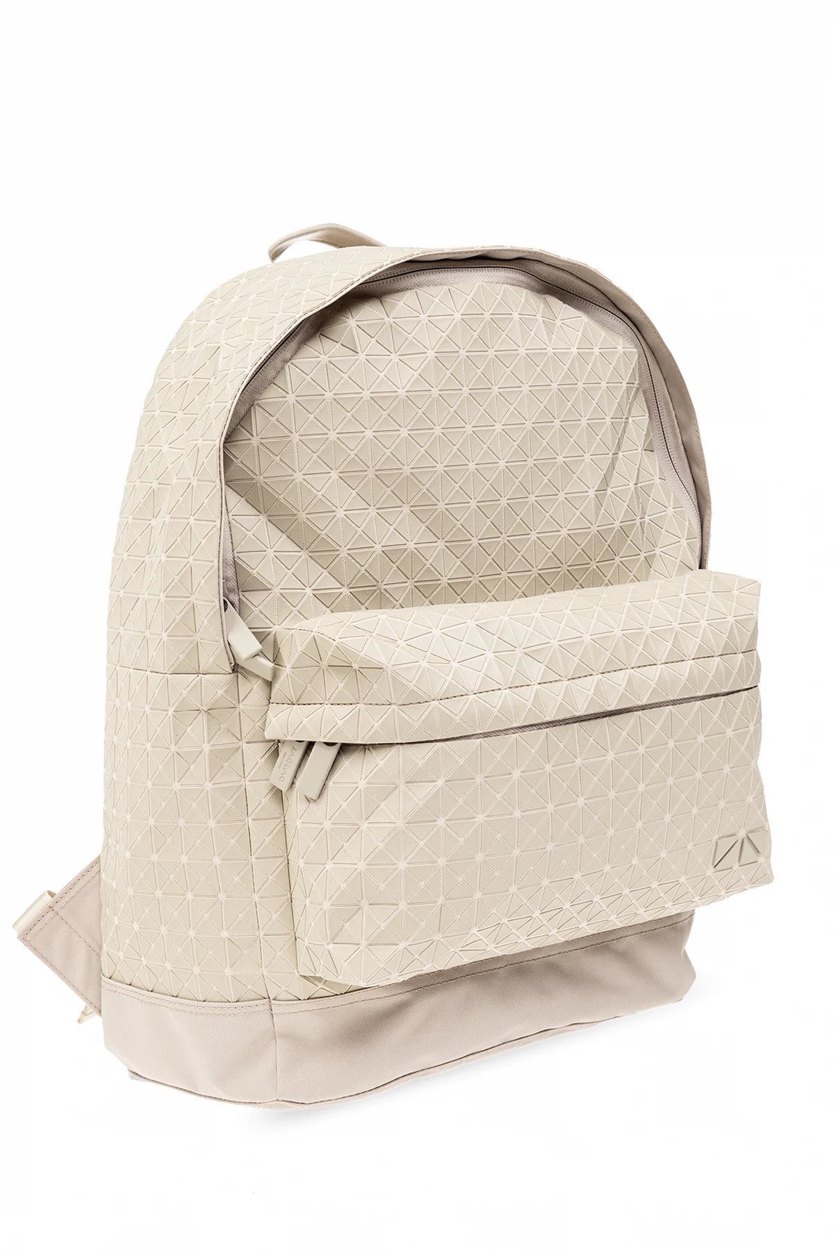 Jasnobeżowy plecak, model ‘Daypack’ Bao Bao Issey Miyake. Zamykany na dwubiegunowy zamek. Ozdobiony geometrycznym wzorem. Z przodu kieszeń zamykana na dwubiegunowy zamek. Półokrągła rączka. Regulowane szelki. Wewnątrz komora.