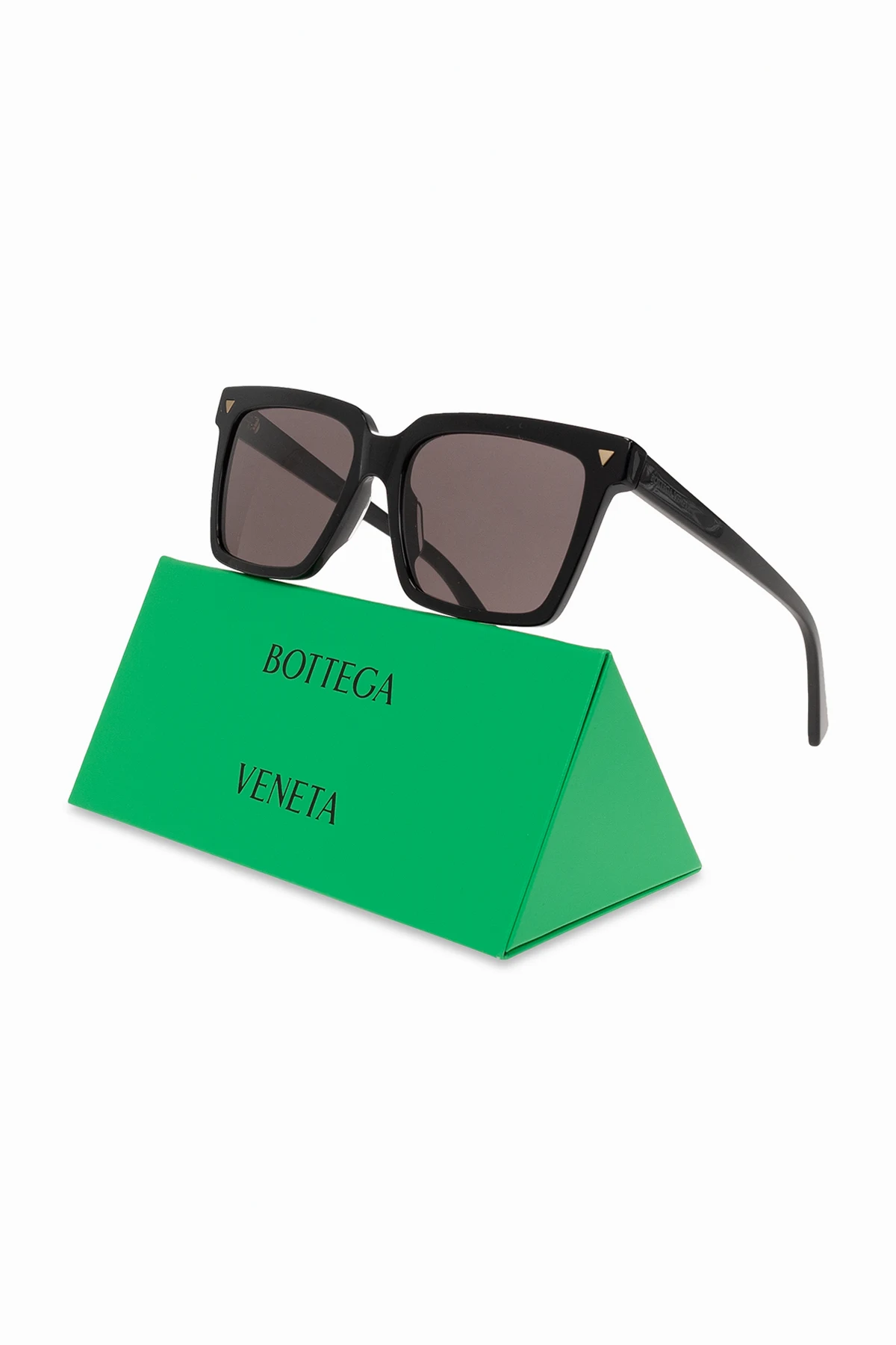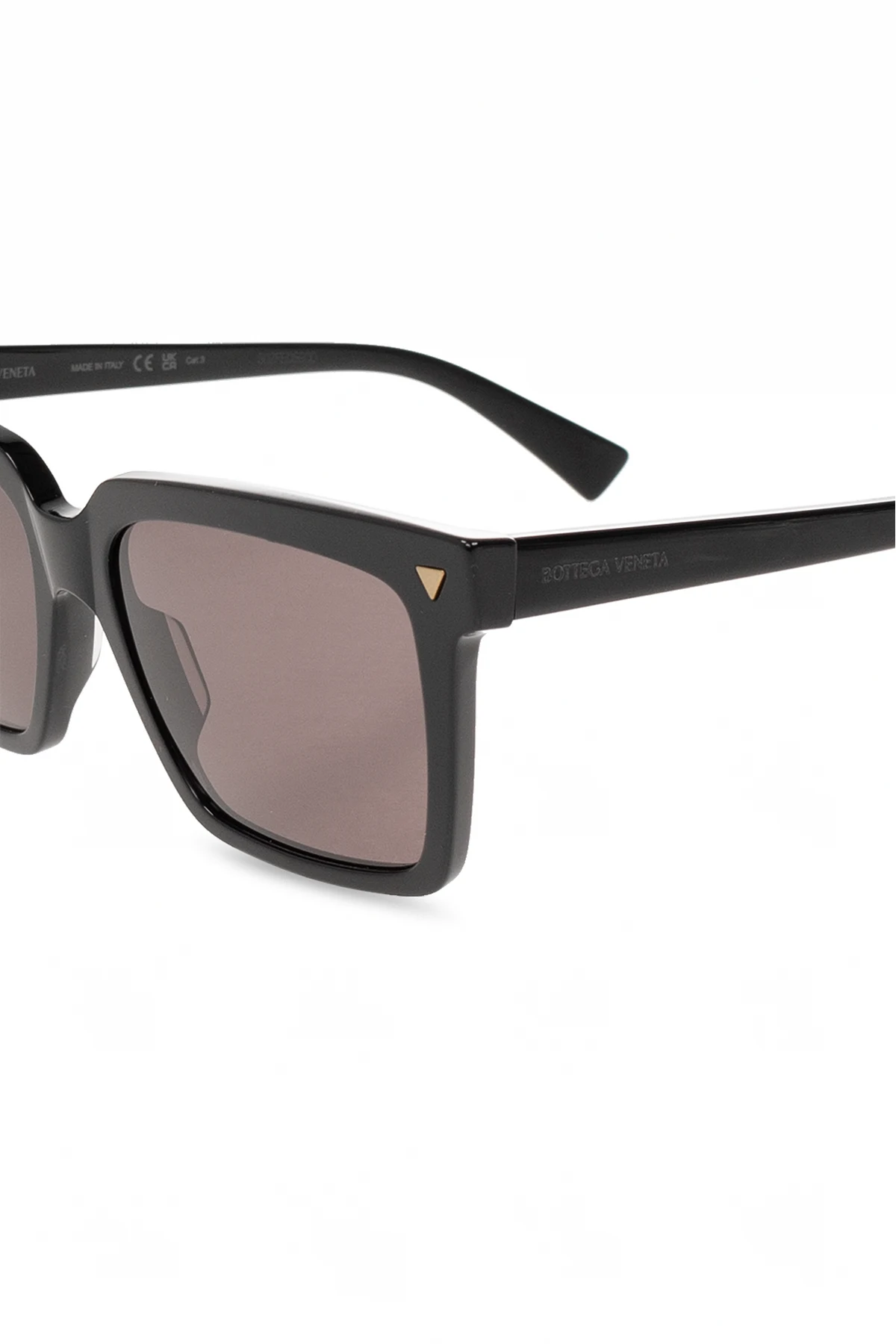Czarne okulary przeciwsłoneczne Bottega Veneta. Kwadratowe oprawki po bokach ozdobione aplikacją w kształcie trójkąta w kolorze złotym. Szare soczewki ze 100% ochroną przed promieniowaniem UV. Dołączone etui.