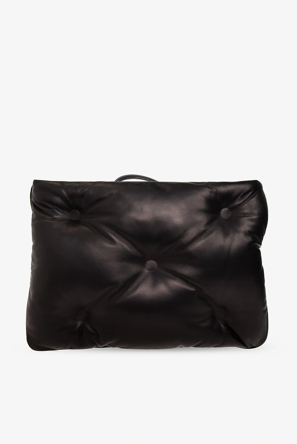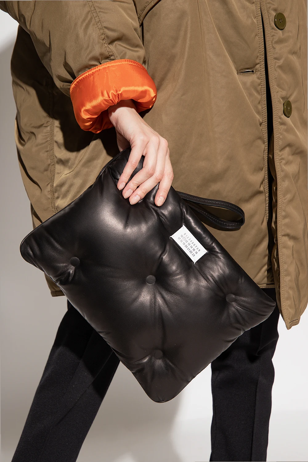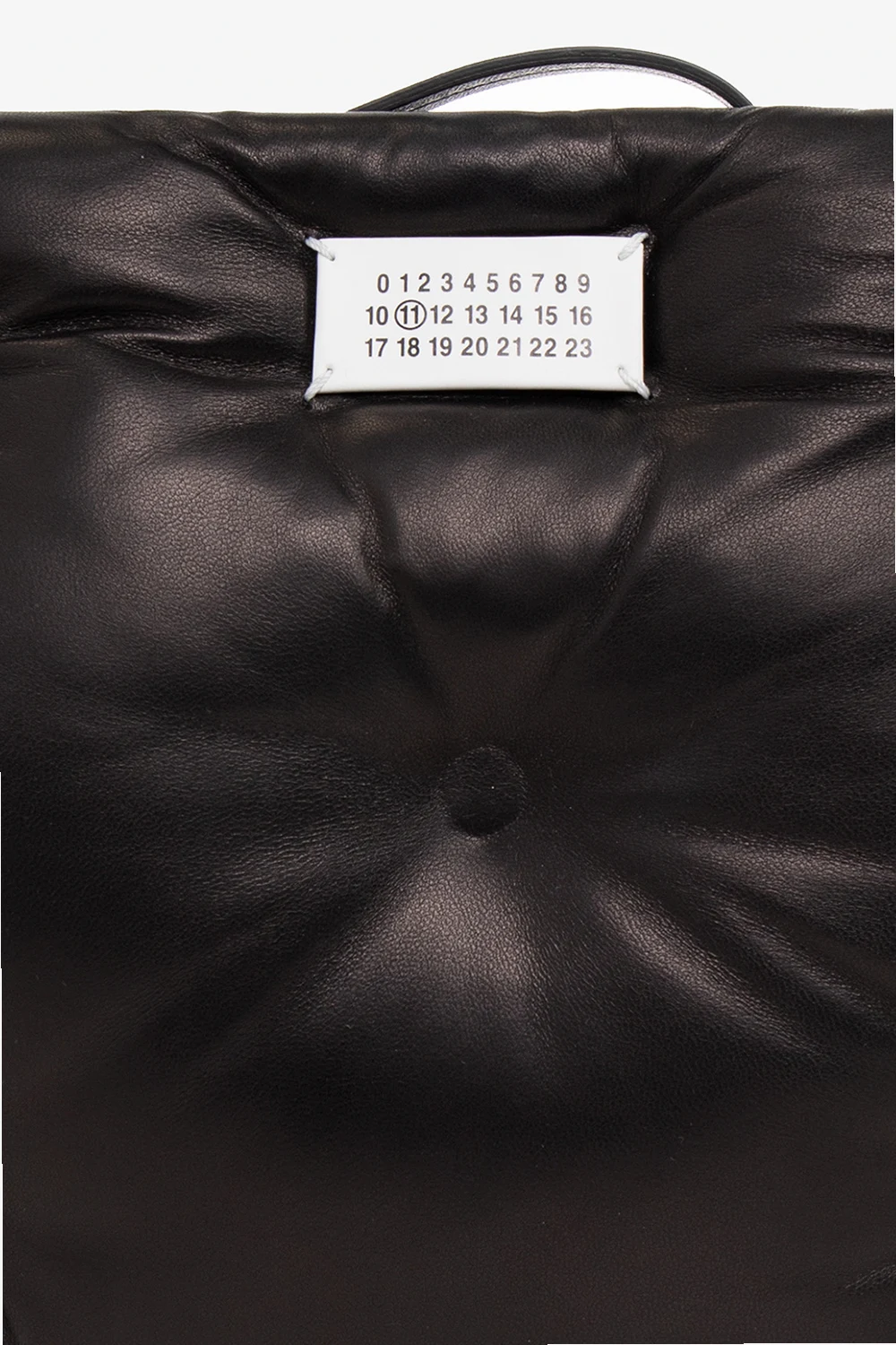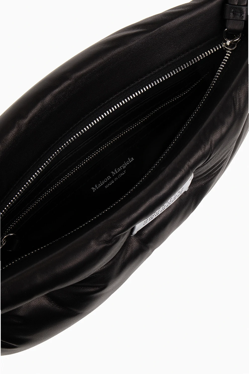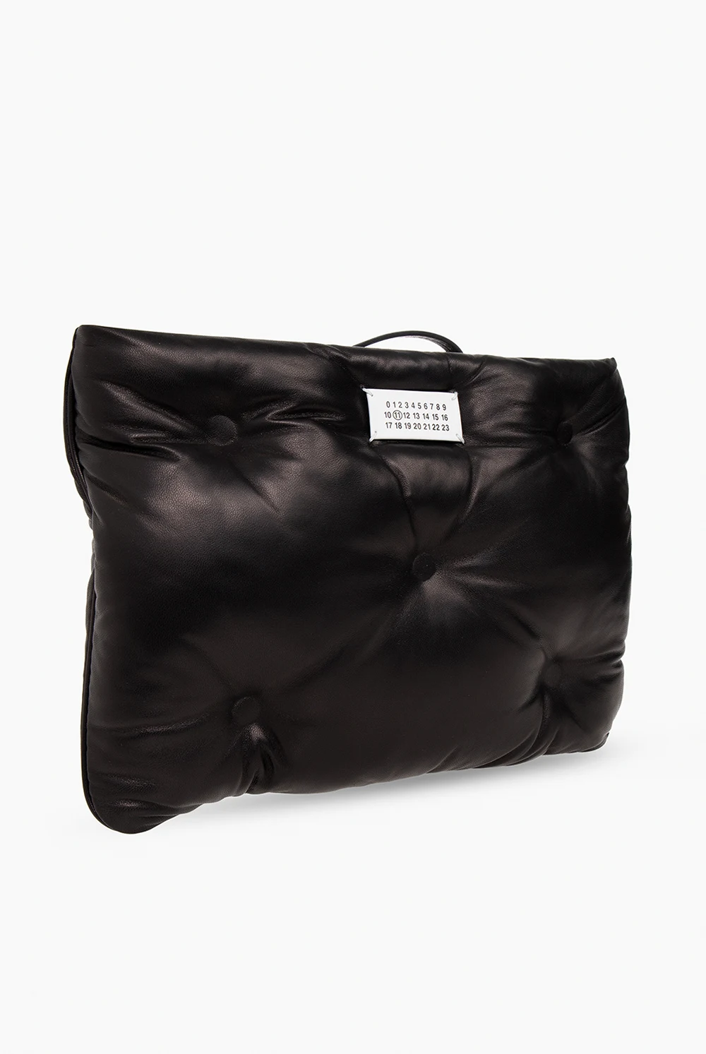 Czarna, pikowana kopertówka, model 'Glam Slam' Maison Margiela. Wykonana ze skóry owczej. Zamykana na zamek. Ozdobiona naszywką z logo w kolorze biało-czarnym. Wewnątrz komora oraz kieszeń zamykana na zamek. Metalowe wykończenie w kolorze srebrnym.