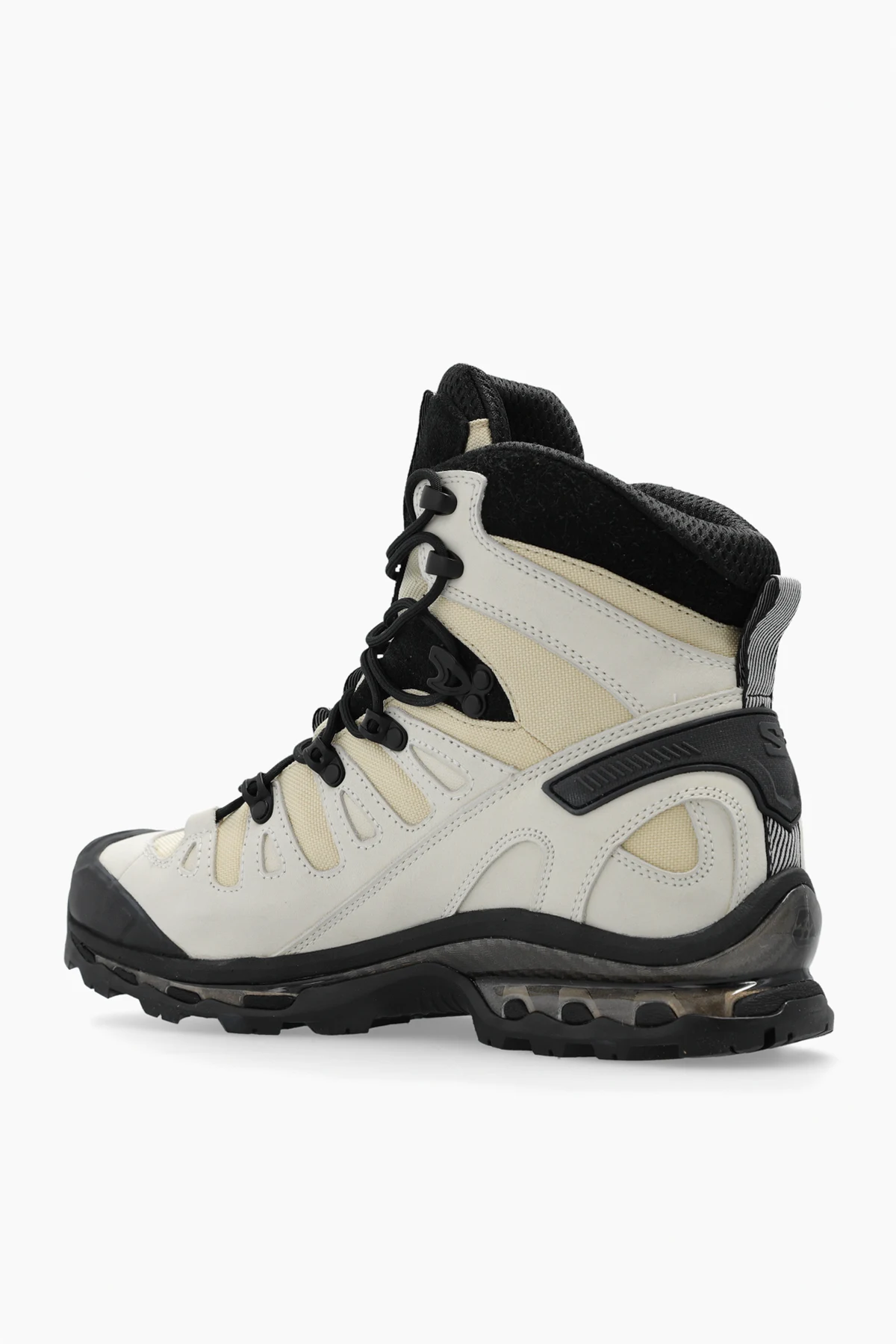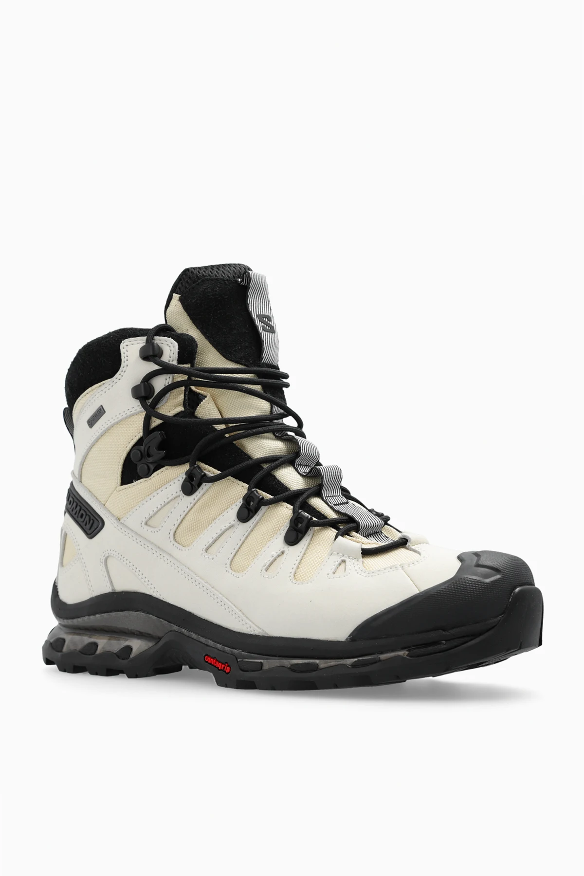 Beżowe, sznurowane buty sportowe, model ‘Quest GTX Advanced’ Salomon. Technologia GORE-TEX® utrzymuje stopy w suchości zarówno z zewnątrz, jak i od wewnątrz. Na buty nałożono specjalną powłokę, która zapewnia dodatkową ochronę i sprawia, że materiał nie pochłania wilgoci podczas lekkich i przelotnych opadów. Miękka, oddychająca wyściółka, gwarantująca maksymalną wygodę. Wkładki OrthoLite® są formowane tak, aby się dostosowywać do kształtu stopy. Zapewniają doskonałą amortyzację, wentylację i wytrzymałość. Dzięki temu poprawiają komfort i parametry butów. Czarna podeszwa All Terrain Contagrip® to wszechstronne rozwiązanie do biegów na każdej nawierzchni. Oferuje trwałość i pewność na mokrych, suchych, twardych i grząskich nawierzchniach.
