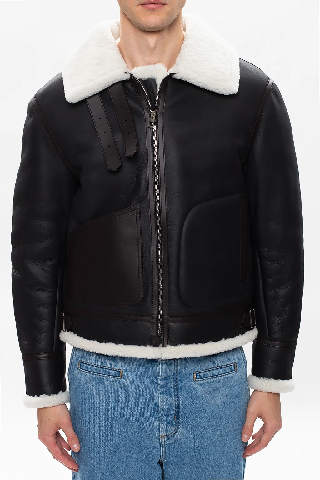 Czarno-brązowo-biały kożuch Loewe. Wykonany ze skóry jagnięcej. Zapinany na zamek. Z przodu dwie wsuwane kieszenie. Mankiety zapinane na regulowane paski z klamrą. Wnętrze oraz kołnierz wykończone futrem jagnięcym.