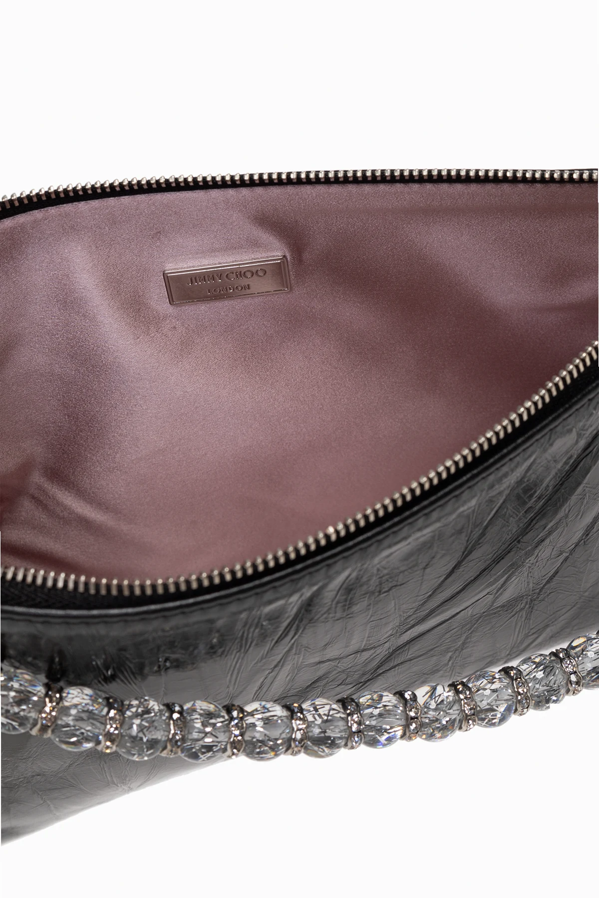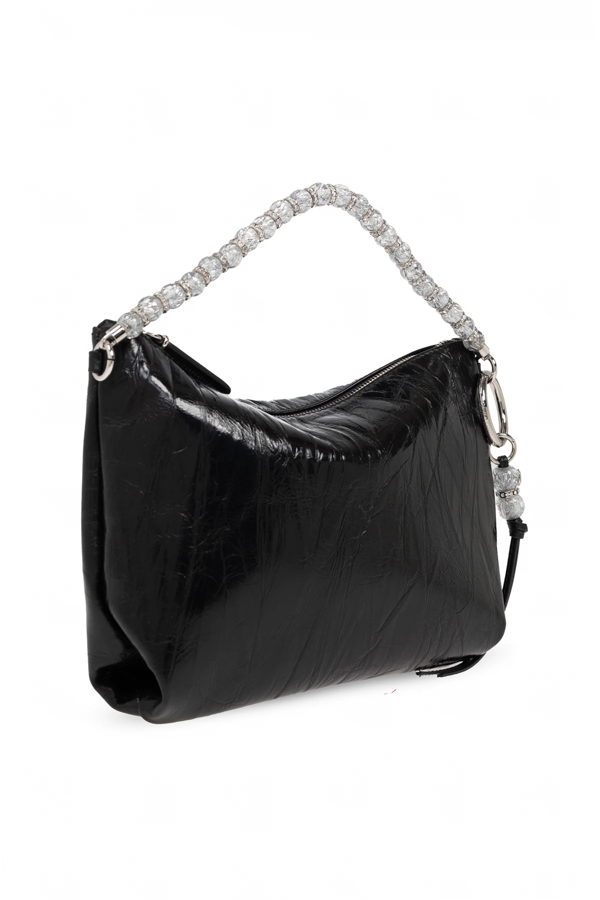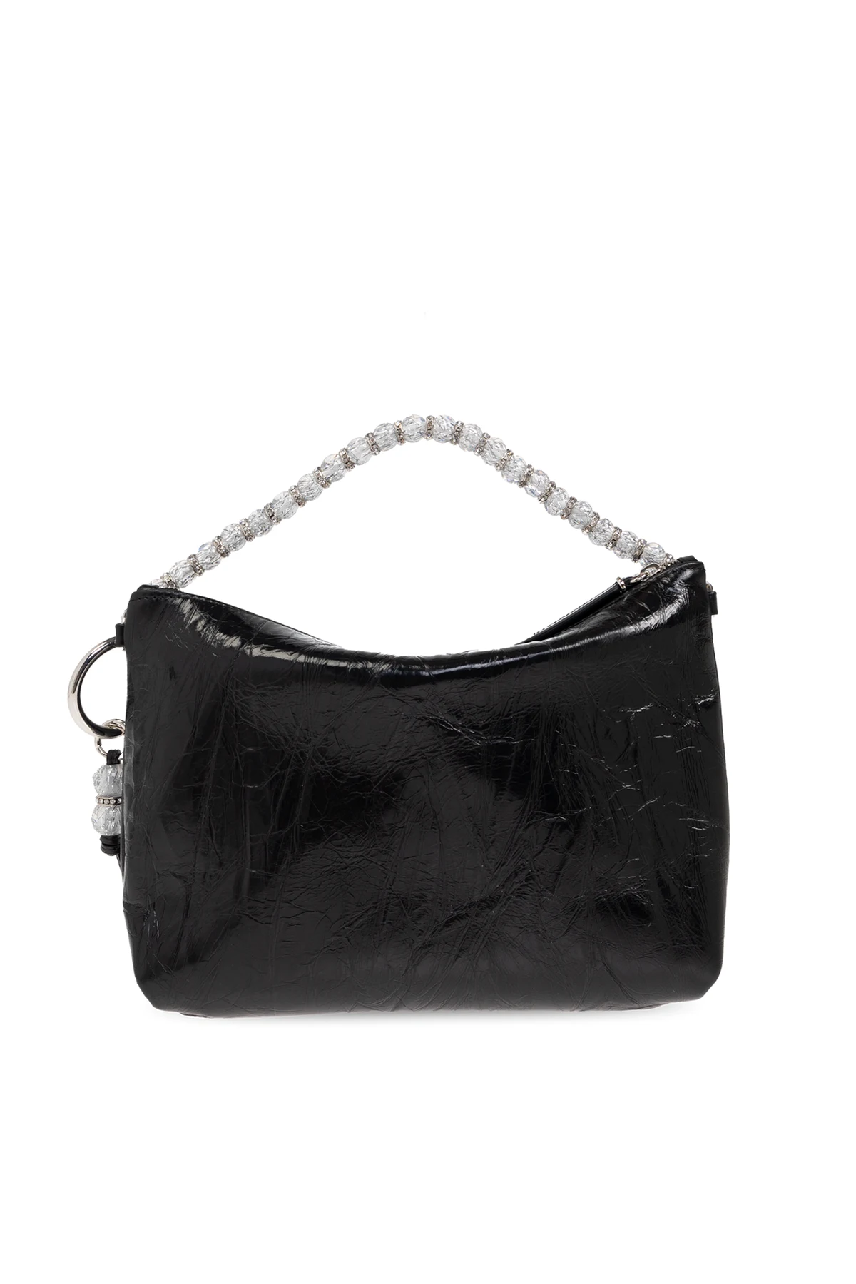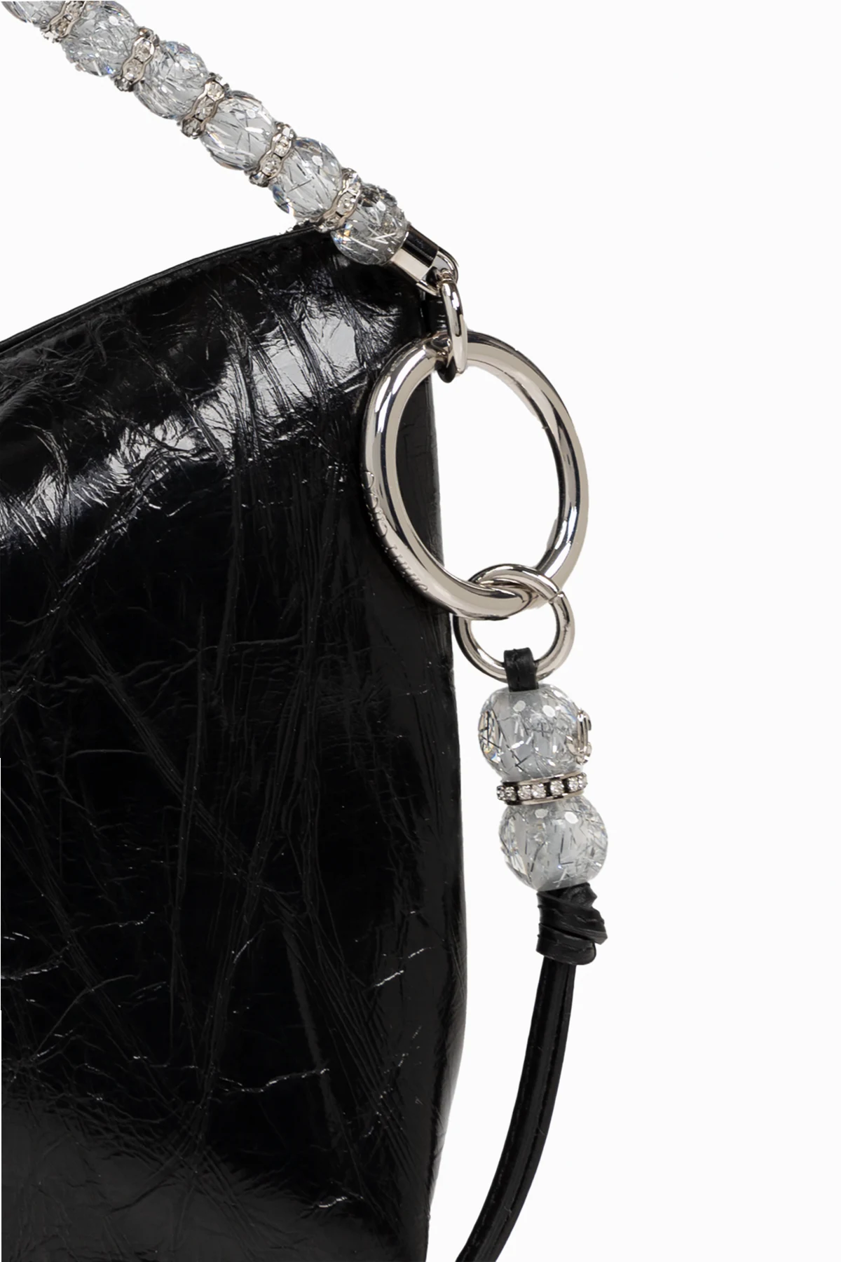 Ozdobny uchwyt, skomponowany z przezroczystych, fasetowanych koralików, stanowi uosobienie nowoczesnego szyku. Dodatkowym akcentem jest metalowy pierścień z zawieszką, które idealnie współgrają z uchwytem. Wnętrze torby kryje w sobie różową wyściółkę oraz metalową blaszkę z nazwą projektanta, podkreślając prestiż tego wyjątkowego akcesorium.