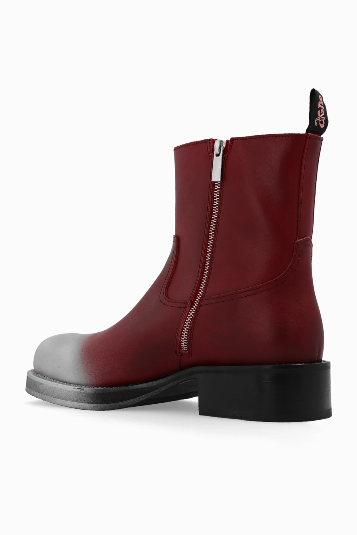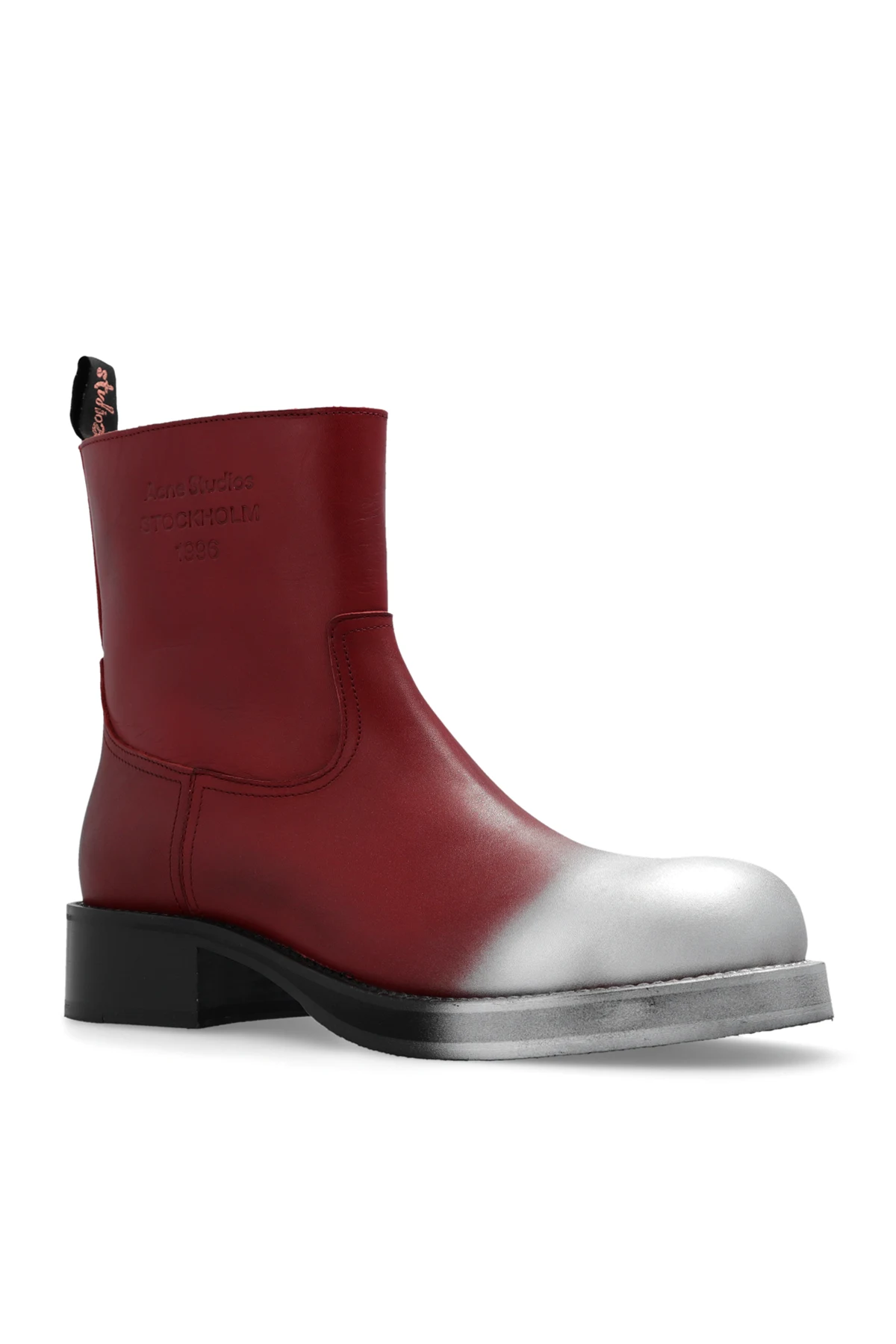 Ciemnoczerwone botki Acne Studios. Wykonane ze skóry cielęcej. Zapinane na zamek. Z boku ozdobione wytłoczonym logo. Okrągły nosek w kolorze srebrnym. Podeszwa w kolorze czarnym wykonana z gumy.