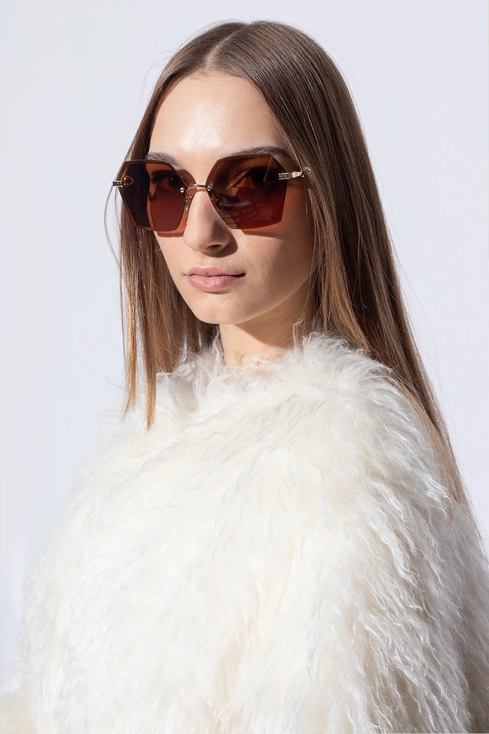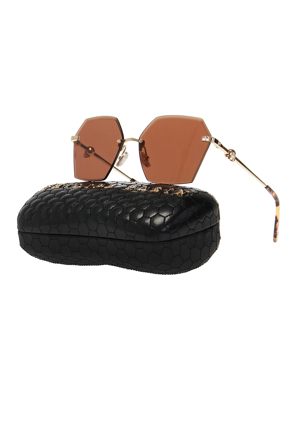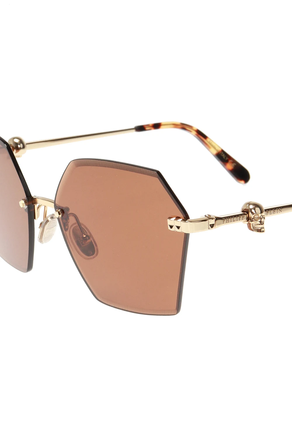 Okulary przeciwsłoneczne, model ‘Beverly’ Philipp Plein. Brązowe, sześciokątne szkła. Mosiężne zauszniki z wytłoczonym logo oraz charakterystyczną dla marki czaszką w kolorze złotym. Z przodu drobne ćwieki. Certyfikowane soczewki UVA/UVB.
