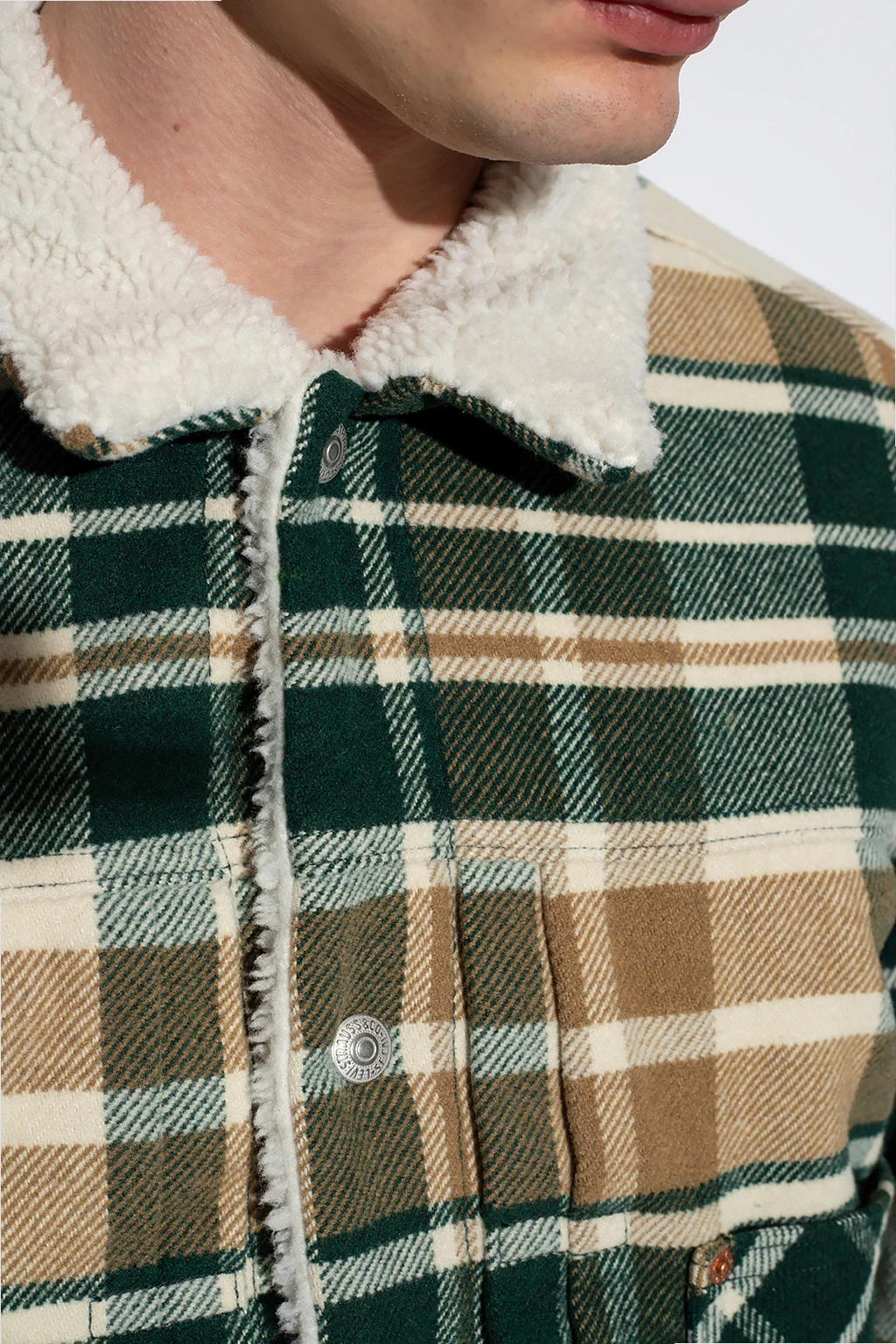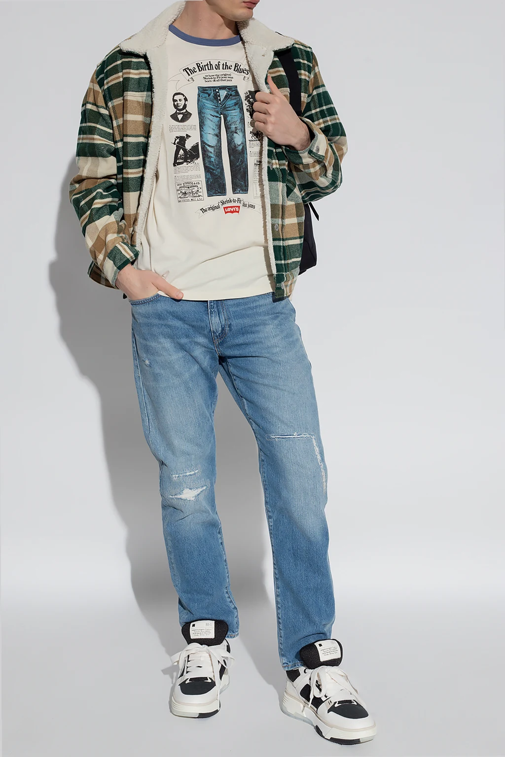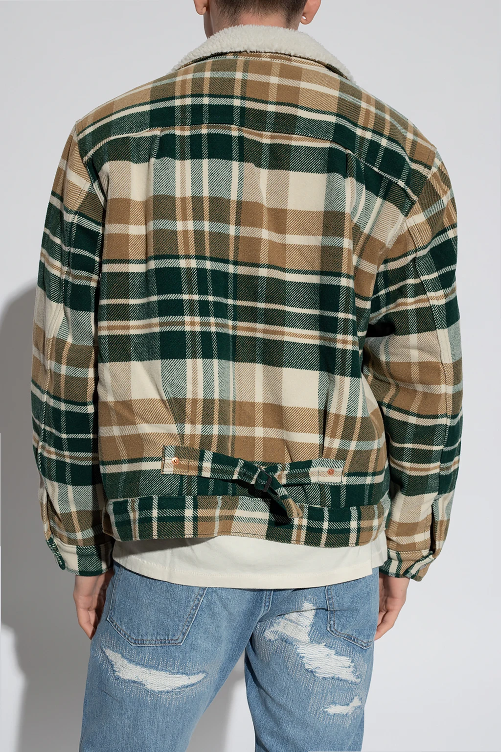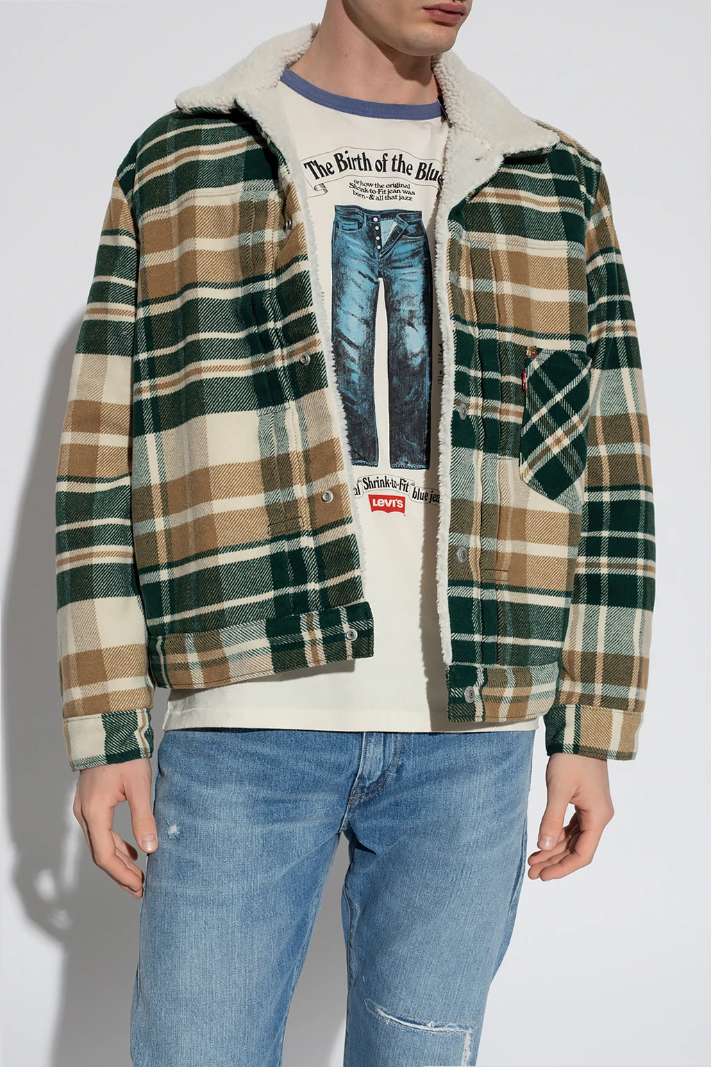 Zielono-kremowo-żółta kurtka Levi’s, kolekcja ‘Premium’. Zapinana na guziki. Ozdobiona wzorem w kratę. Trzy kieszenie wsuwane. Ozdobiona naszywką z logo. Wzór w kratę. Długie rękawy.