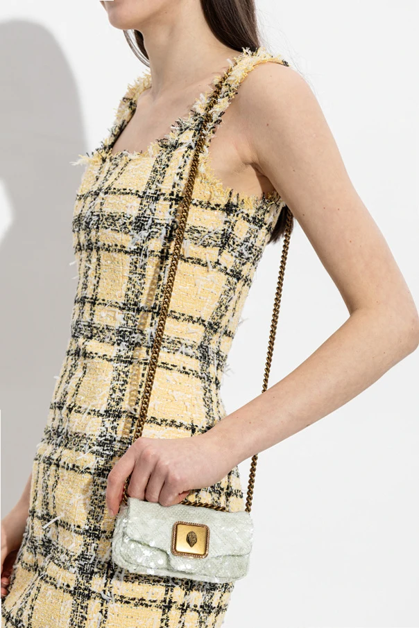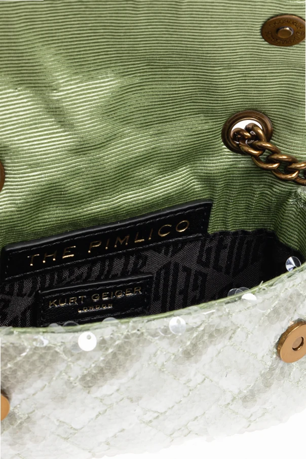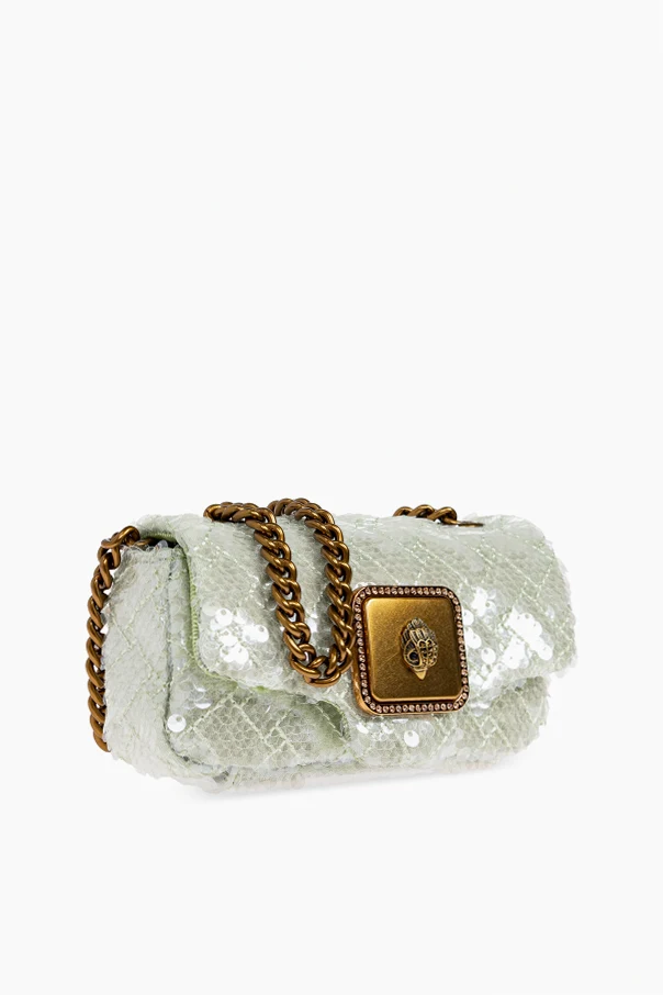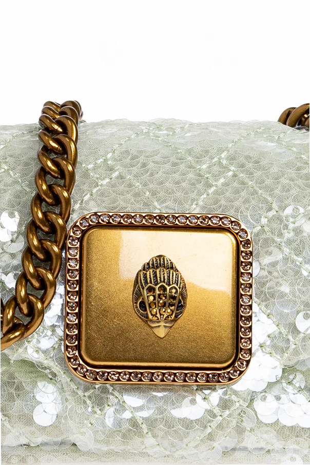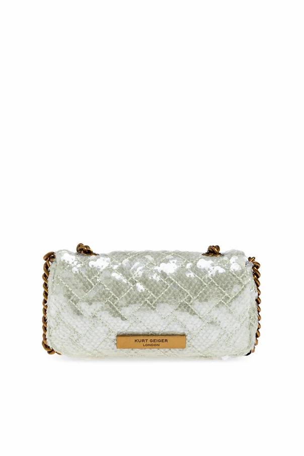 Luksusową fakturę torby tworzą migoczące cekiny misternie rozmieszczone na delikatnej siateczce, którą przecina subtelny, pikowany wzór. Wrażenie ekskluzywności podkreśla masywny, złoty łańcuch oraz dekoracyjna klamra ozdobiona biżuteryjnym motywem i drobnymi kryształkami. Tył zdobi dyskretna, złota blaszka z napisem „KURT GEIGER”.