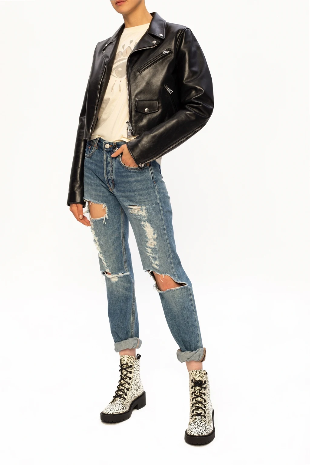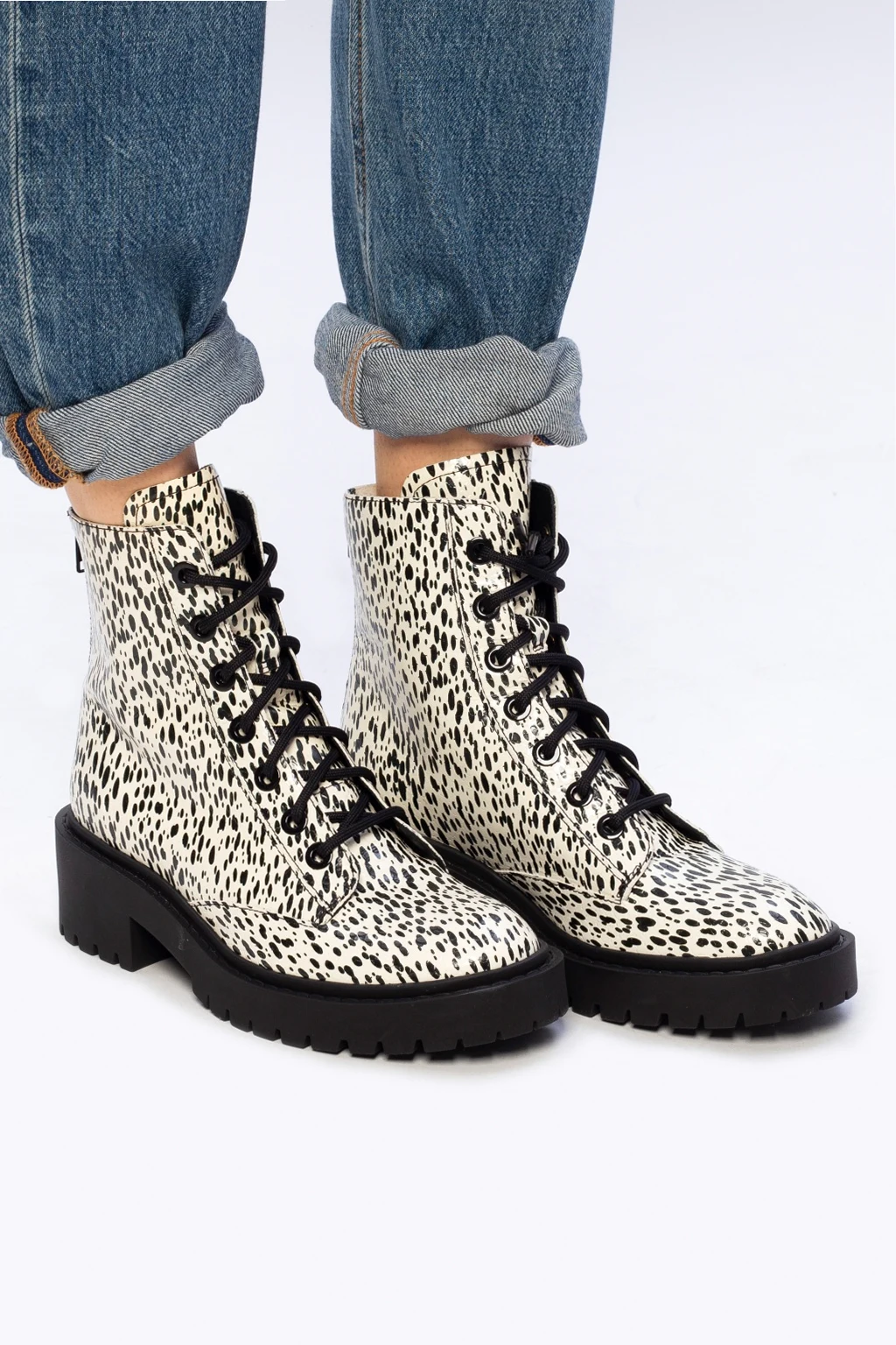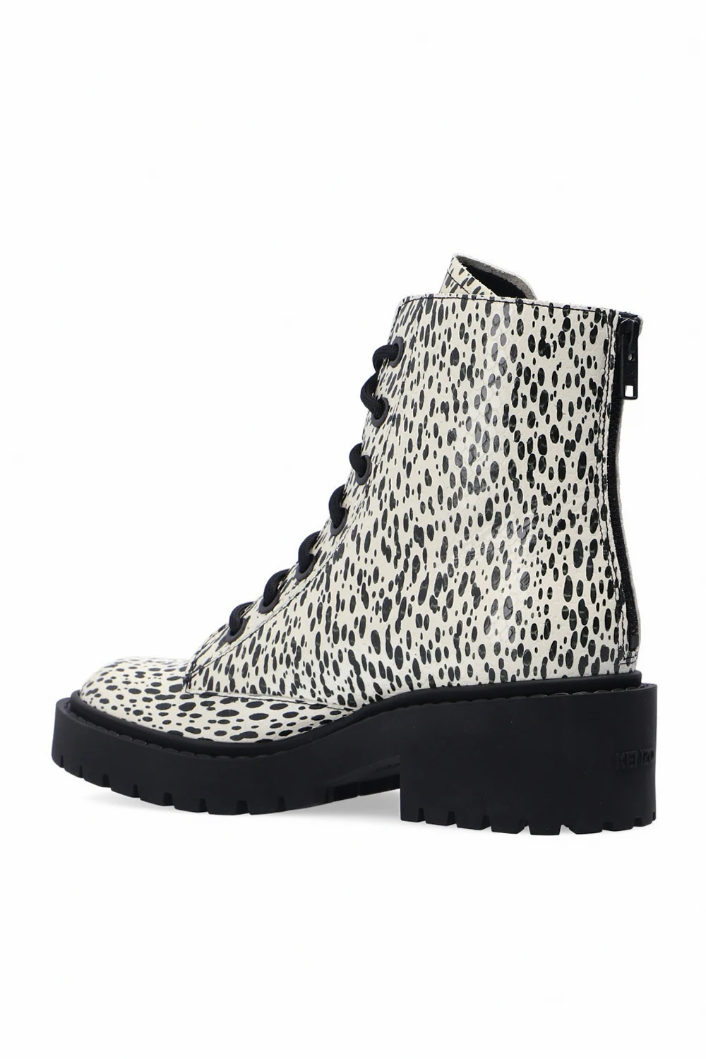 Beżowo-czarne, sznurowane botki na obcasie Kenzo. Wykonane ze skóry o specjalnej fakturze imitującej skórę węża. Ozdobione nadrukowanym wzorem. Z tyłu zapinane na zamek. Czarna, gumowa podeszwa.
