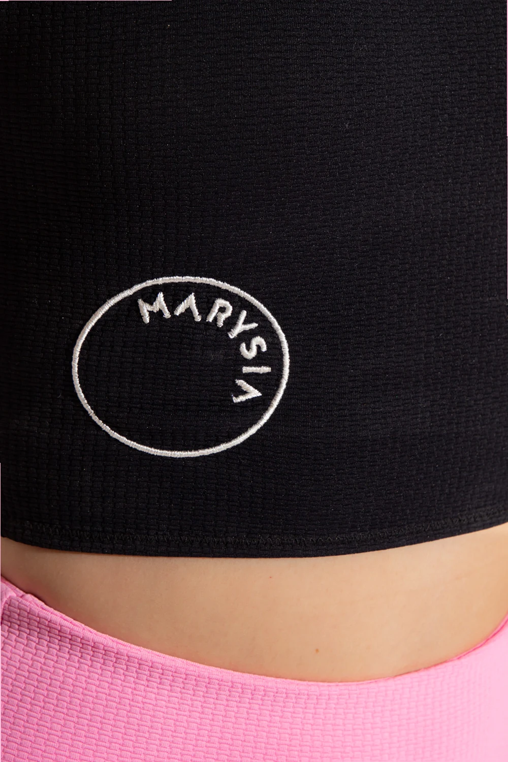 Czarny top na ramiączkach, model ‘Steffi’ Marysia, kolekcja ‘SPORTCLEAN’. Wykonany z elastycznej, teksturowanej tkaniny. Charakterystyczne, ręcznie wycinane brzegi. Z przodu wyszyte białe logo.