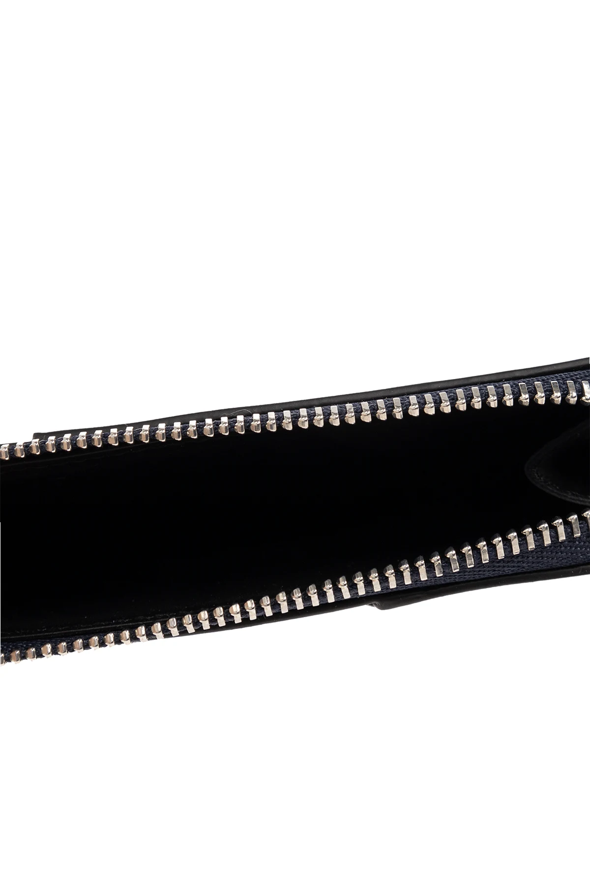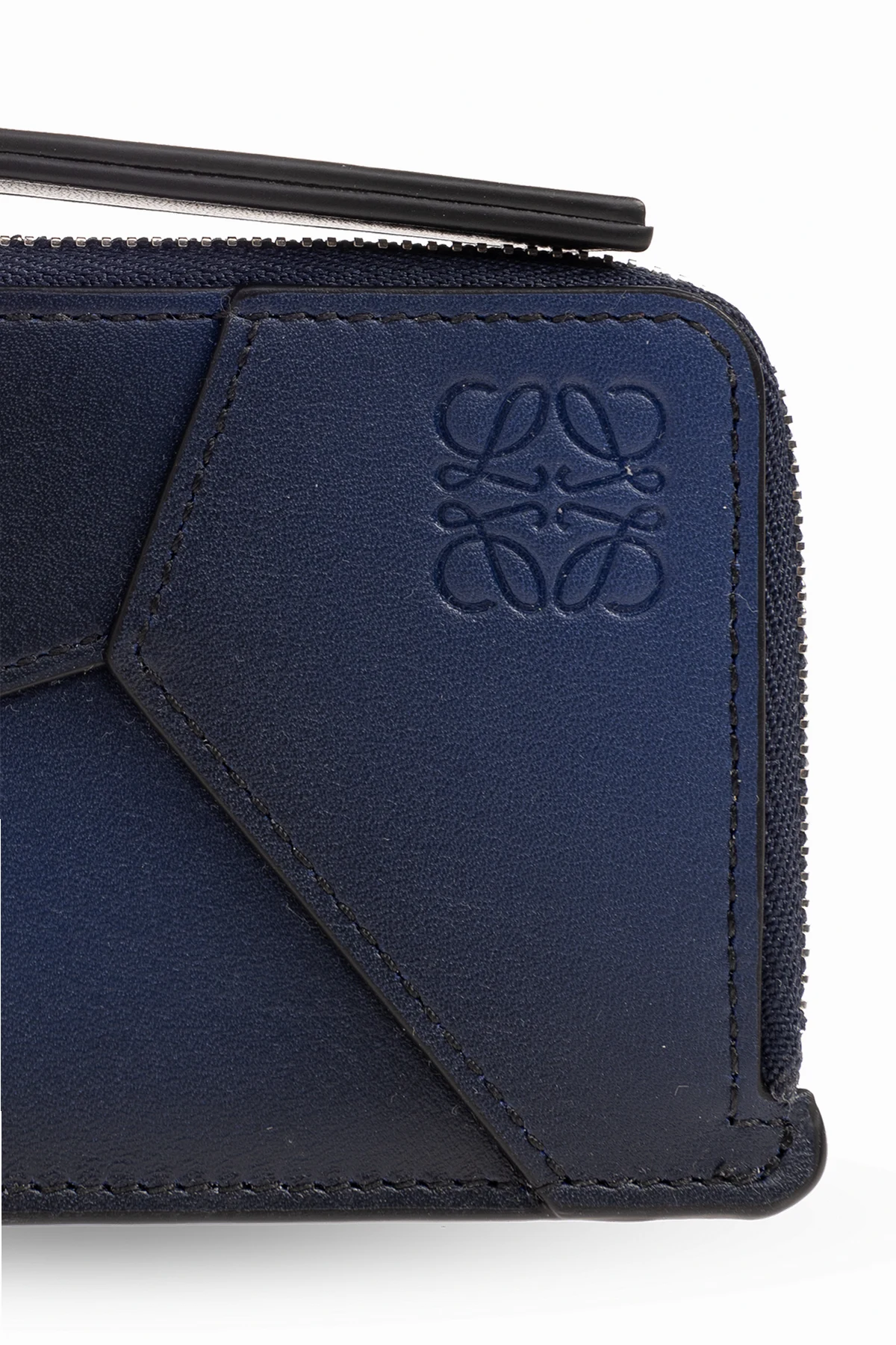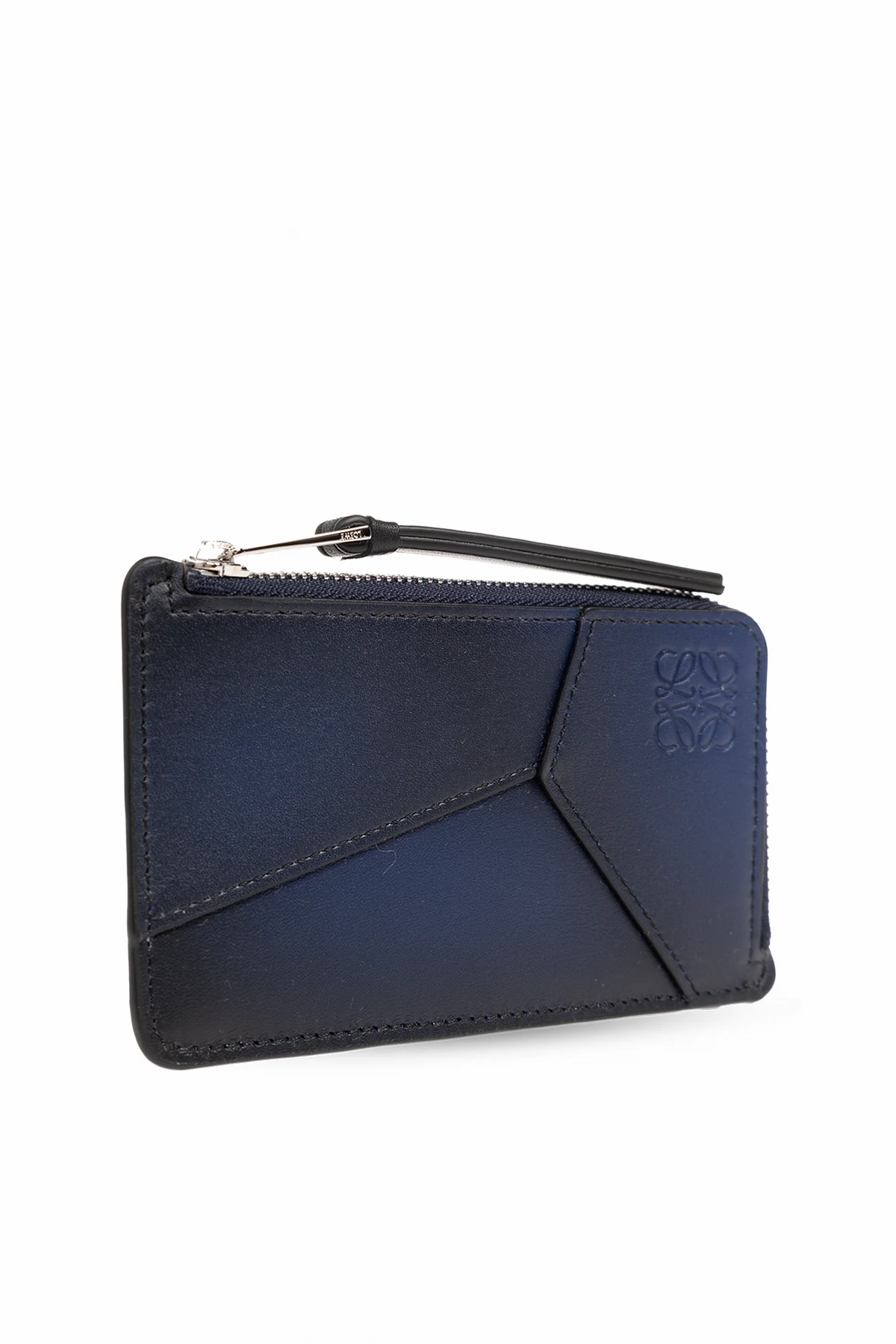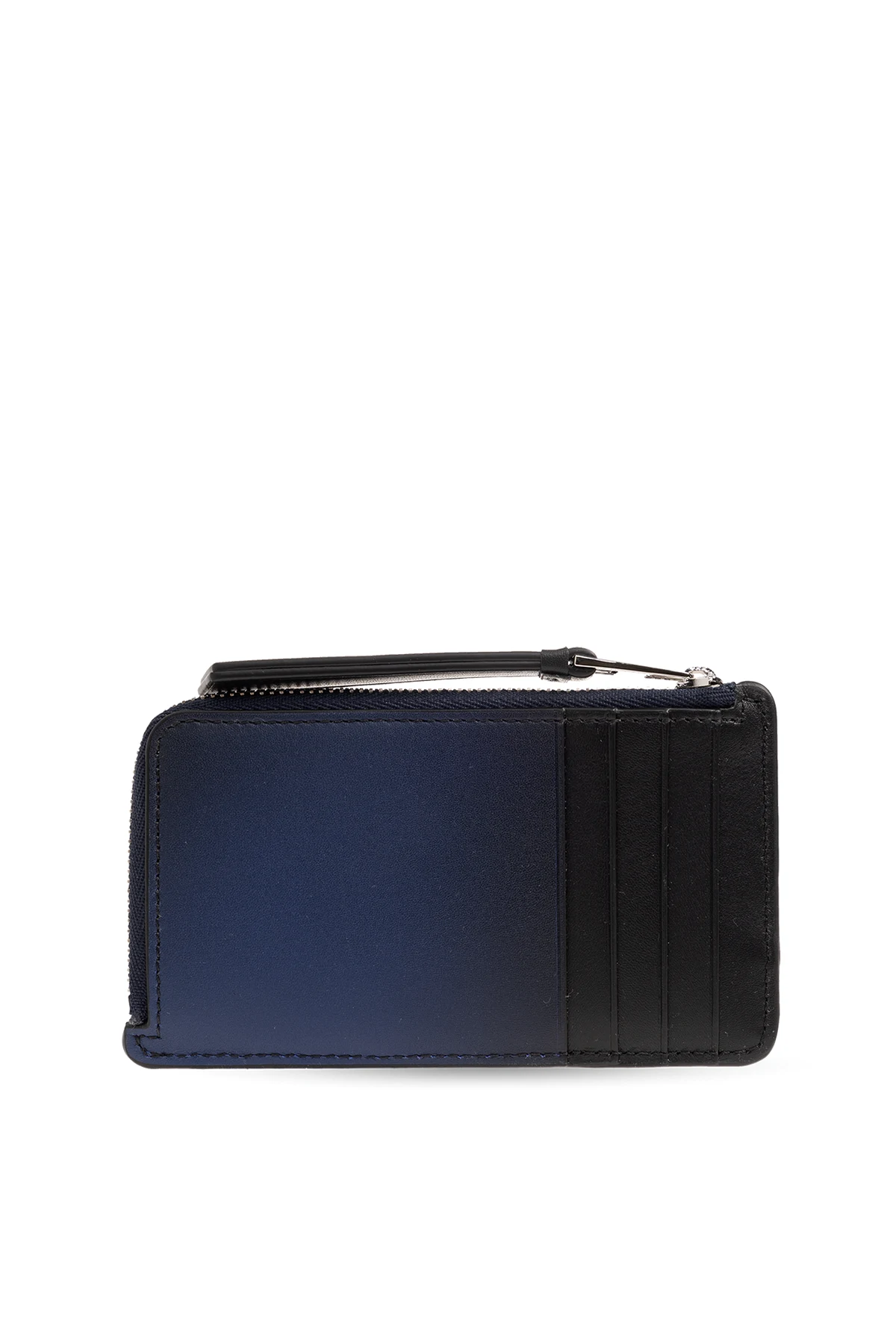 Czarno-granatowe, gradientowe etui na karty Loewe. Wykonane ze skóry cielęcej. Ozdobione asymetrycznymi naszywkami i wytłoczonym logo. Z tyłu cztery miejsca na karty. Kieszeń na monety zamykana na zamek.