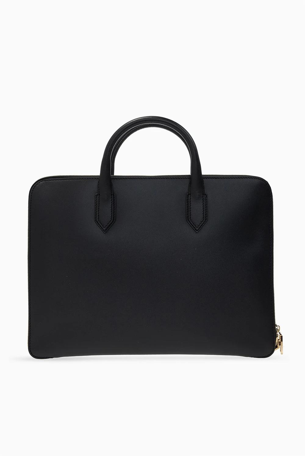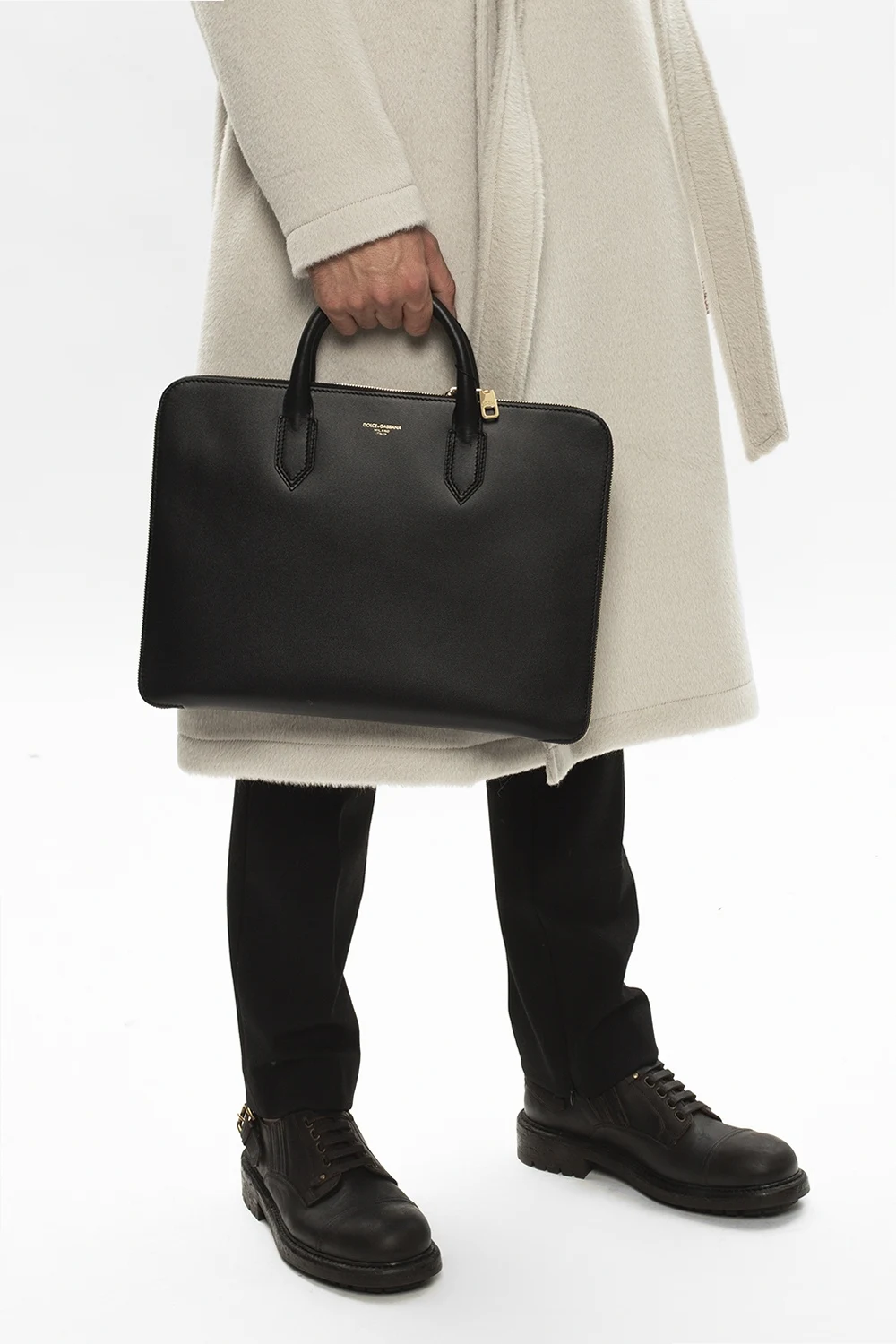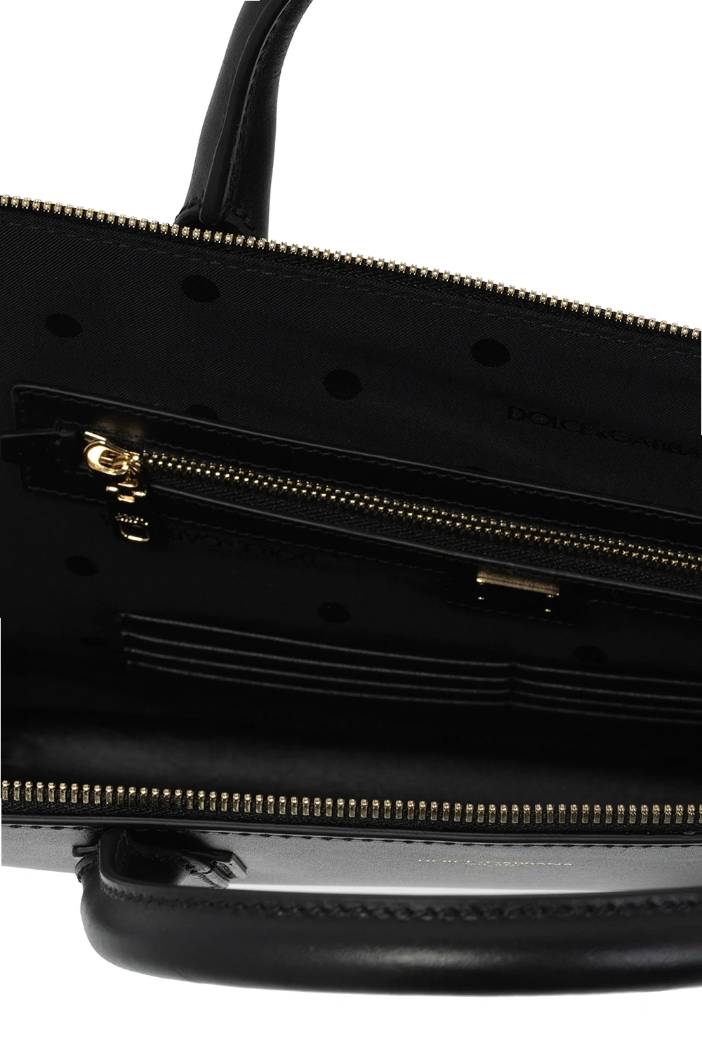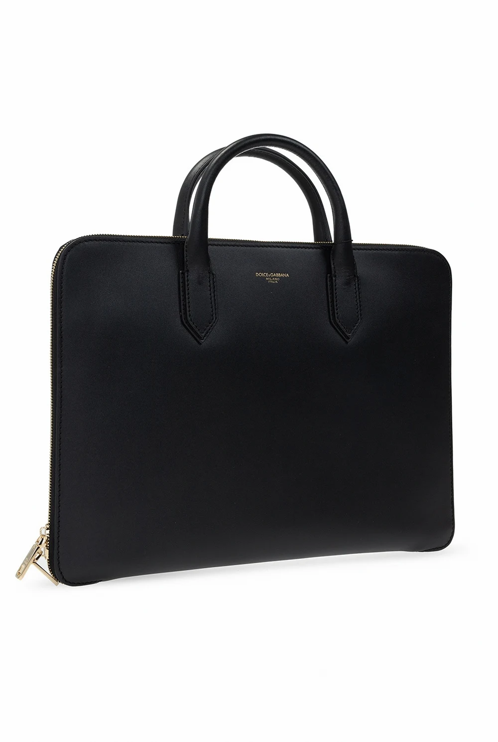 Czarna aktówka Dolce & Gabbana. Wykonana ze skóry cielęcej. Zamykana na dwubiegunowy zamek. Ozdobiona nadrukowanym logo w kolorze złotym. Dwie półokrągłe rączki. Wewnątrz komora z trzema wsuwanymi kieszeniami, kieszenią zamykaną na zamek oraz osiem miejsc na karty.