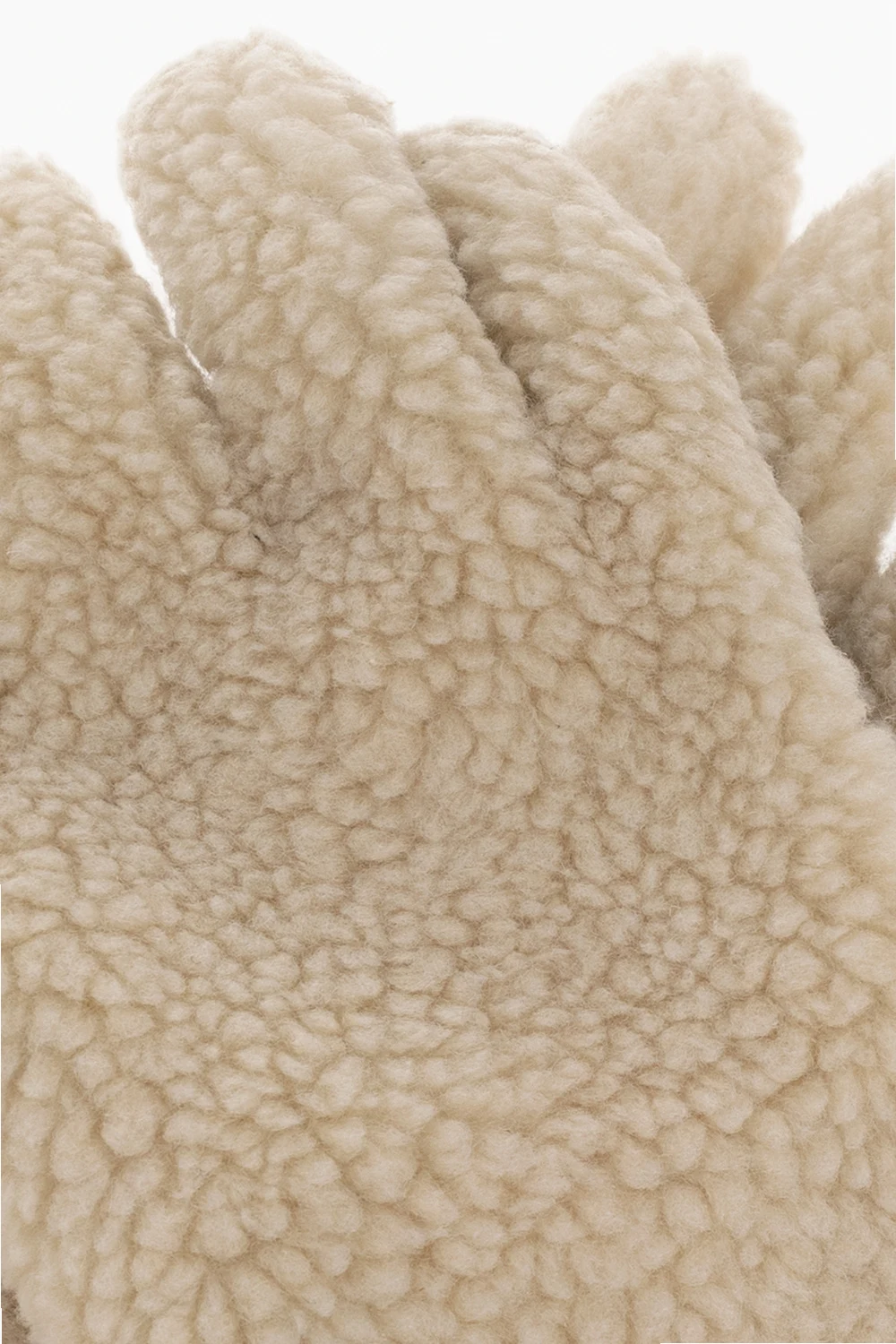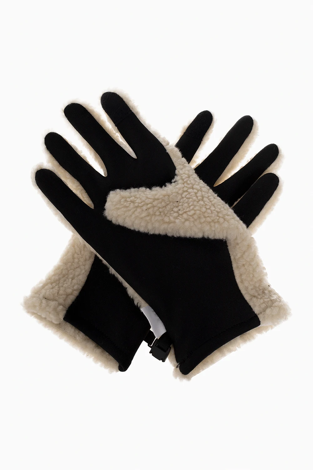 Kremowo-czarne rękawiczki, model ‘Chan’ Samsoe Samsoe. Wykonane z materiału z recyklingu. Ozdobione wyszytym wzorem z logo w kolorze czarnym.
