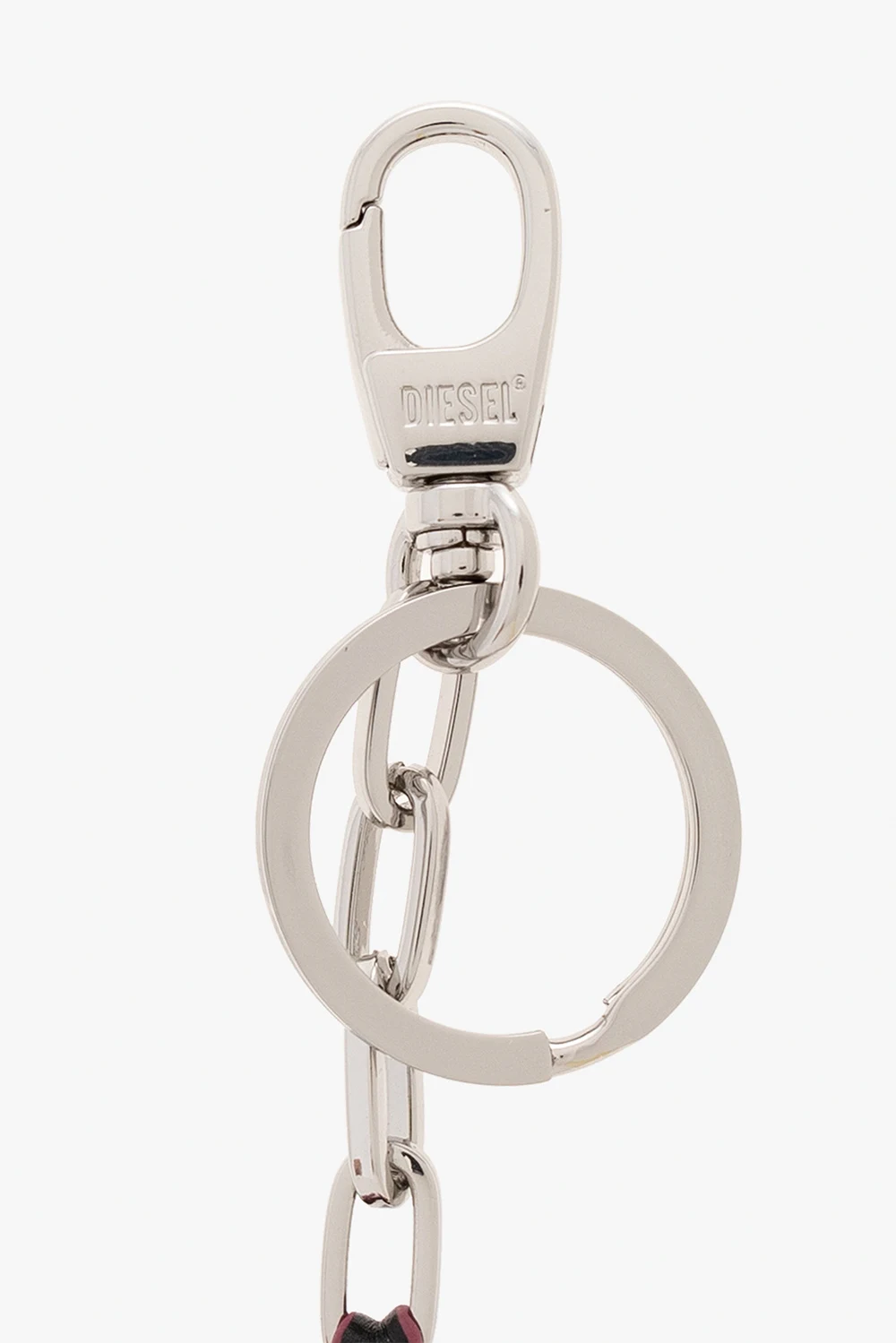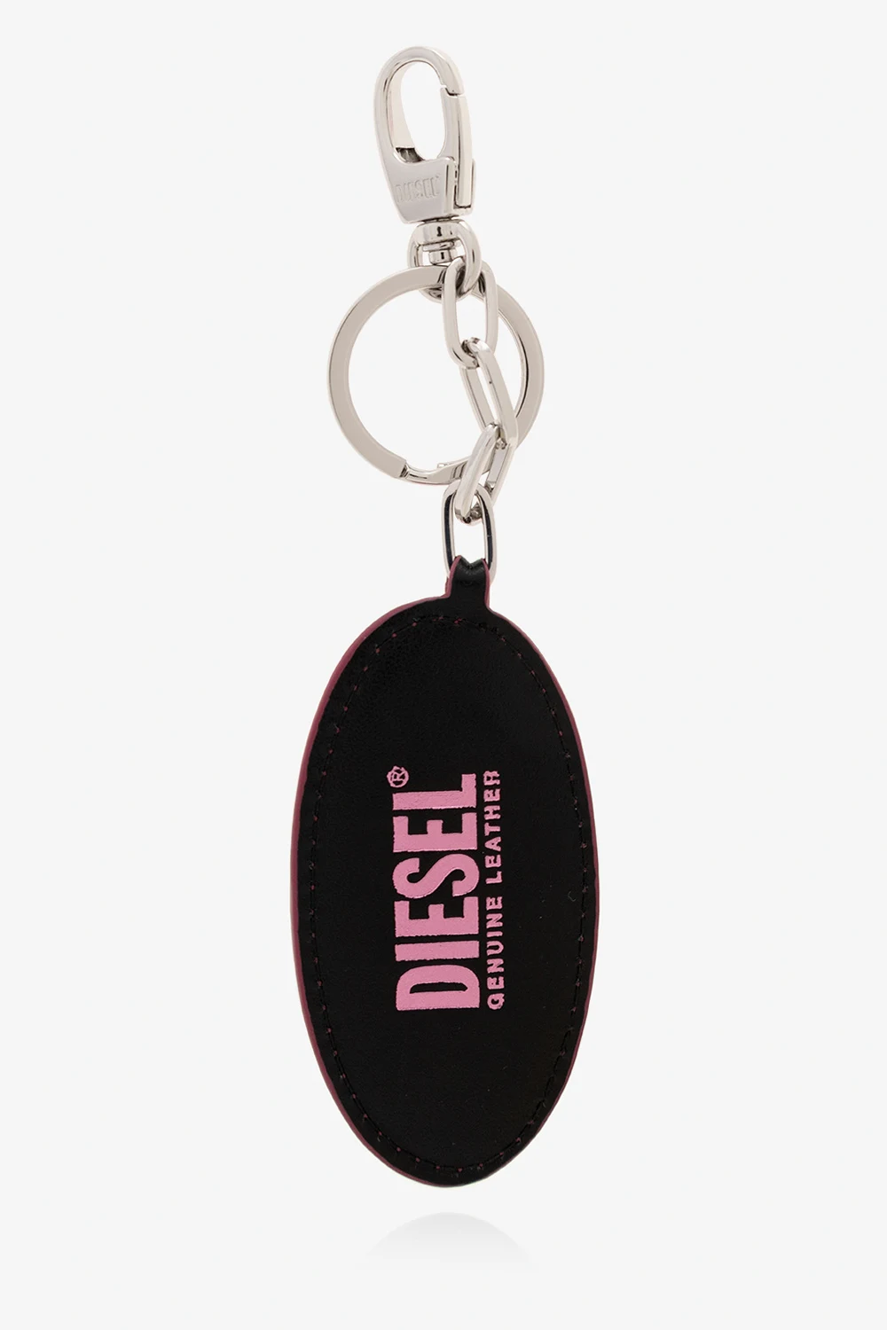 Brelok w kolorze różowo-czarnym, model ‘HOLLY-D’ Diesel. Zakończony karabińczykiem. Ozdobiony skórzaną zawieszką z aplikacją z logo. Z tyłu wytłoczone logo.