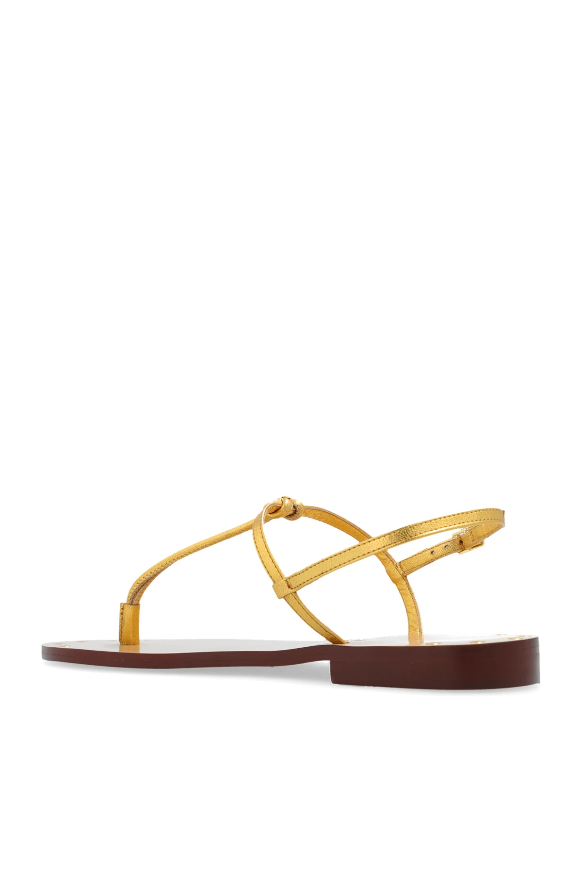 Sandały w kolorze złotym, model ‘Capri’ Maria Luca. Wykonane ze skóry. Wokół kostki zapinane na regulowany pasek z klamrą. Podeszwa wykonana z gumy w kolorze beżowym.
