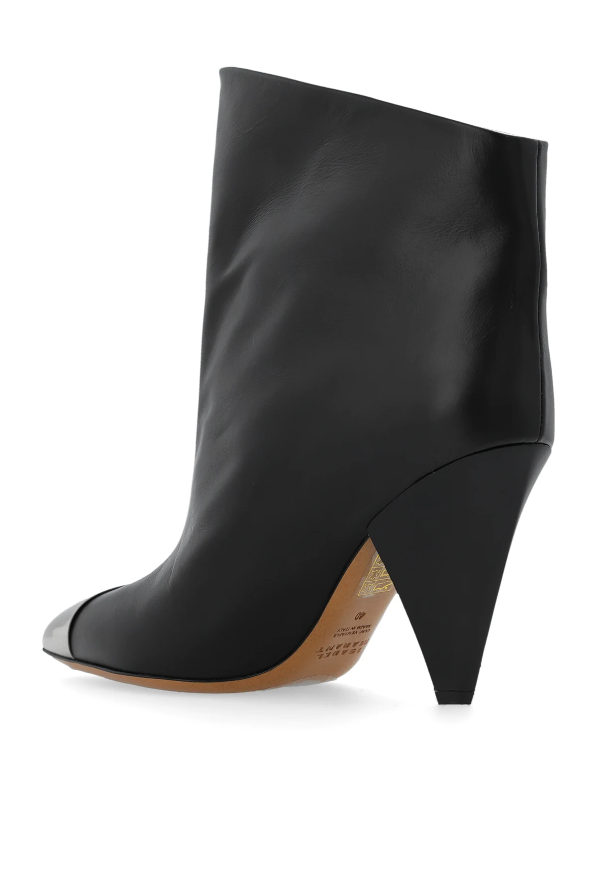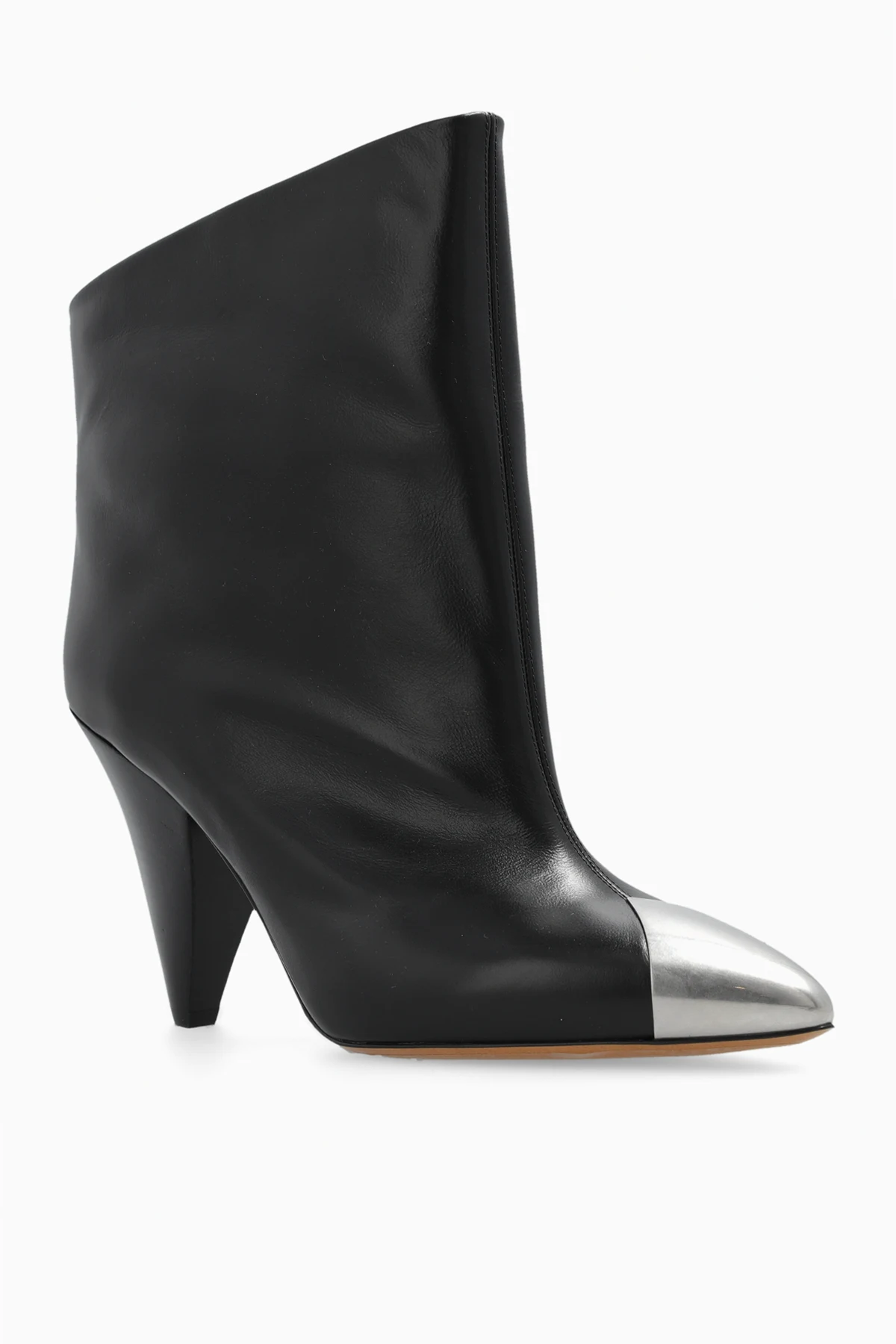 Czarne botki na obcasie, model ‘Lapio’ Isabel Marant. Wykonane ze skóry. Z przodu dekoracyjna, metalowa wstawka w kolorze srebrnym. Nosek w szpic. Brązowa, skórzana podeszwa.