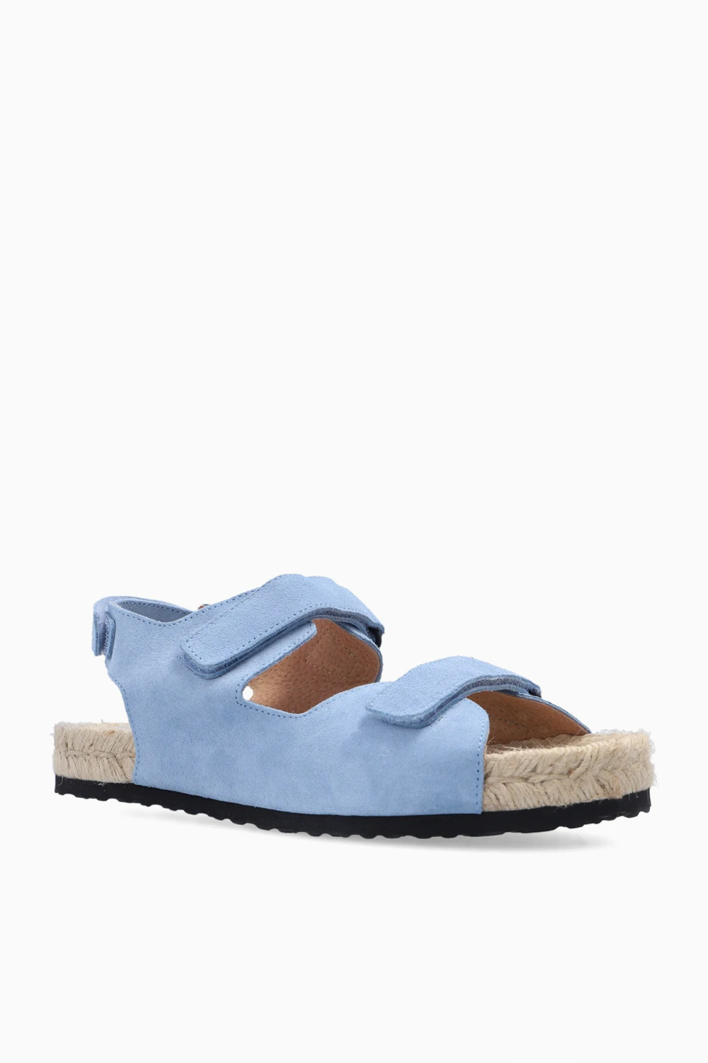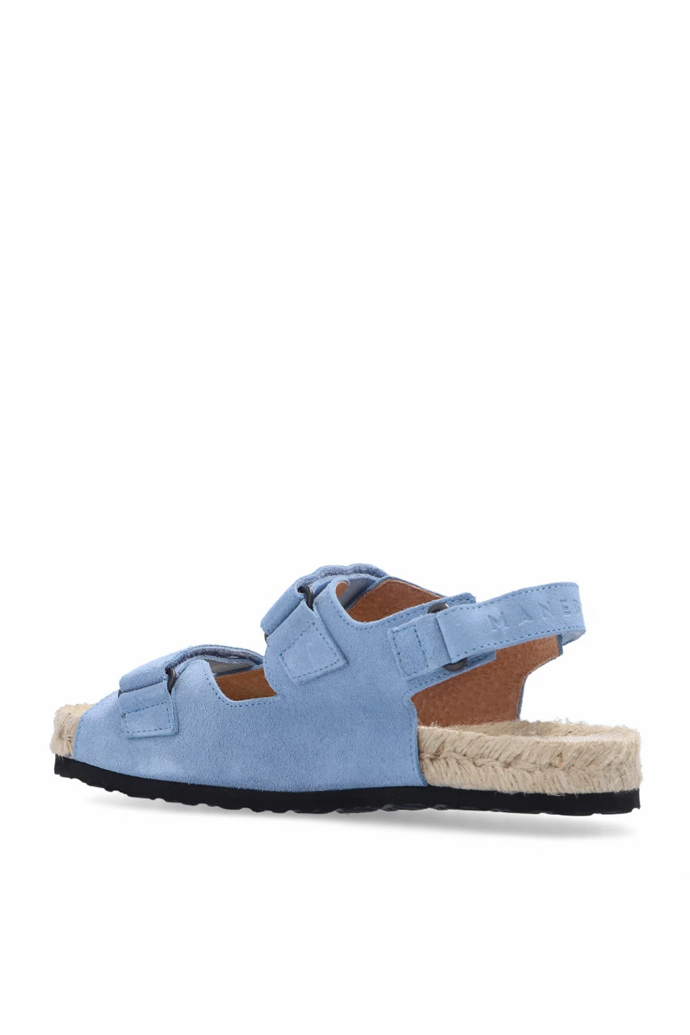 Niebieskie sandały Manebi. Wykonane z zamszu. Zapinane na pasy z rzepem. Podeszwa wykonana z naturalnej juty wykończonej cienką warstwą kauczuku w kolorze czarnym.