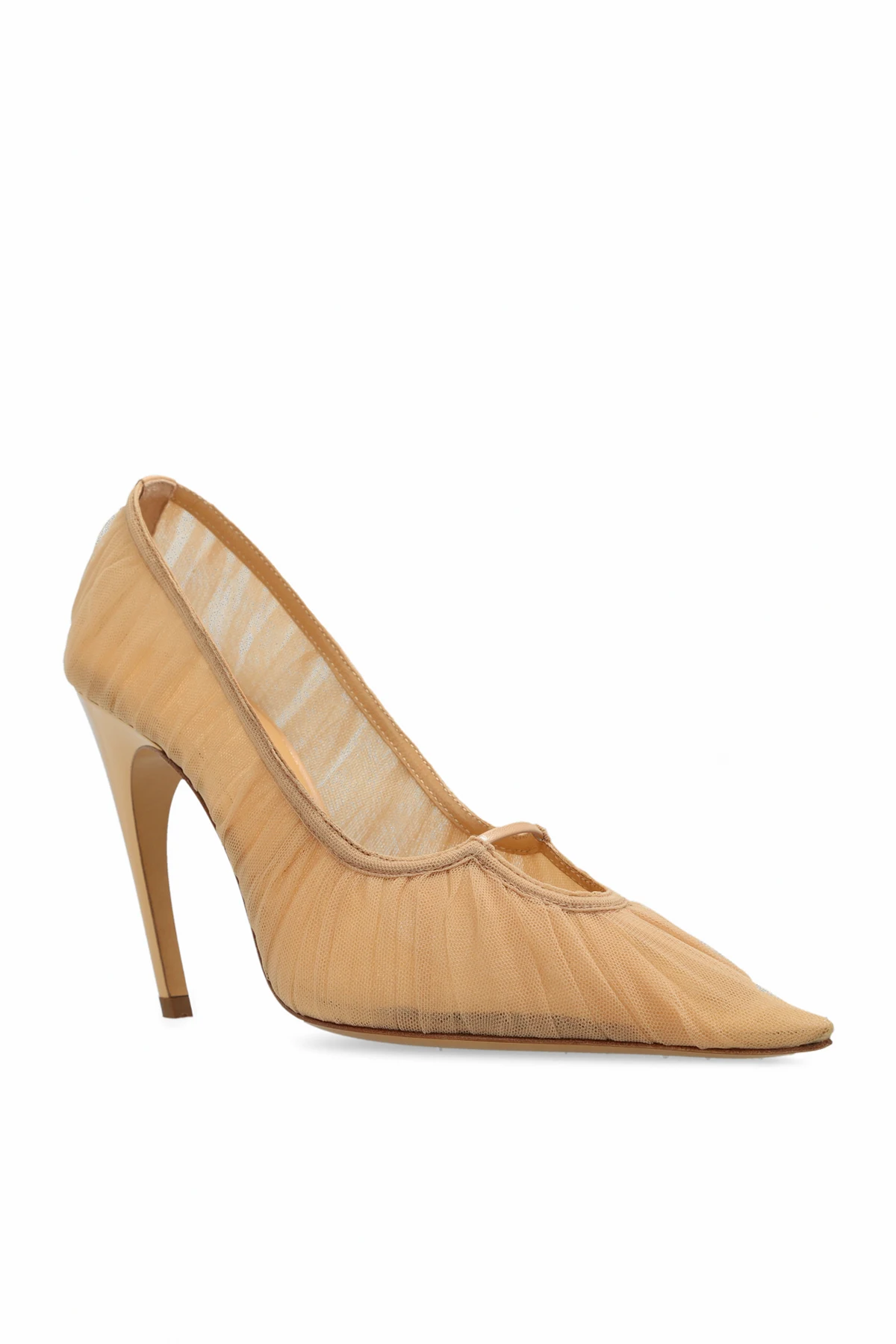 Beżowe szpilki Nensi Dojaka. Wykonane z dekoracyjnie drapowanego tiulu i skóry. Nosek w szpic. Beżowa, skórzana podeszwa.