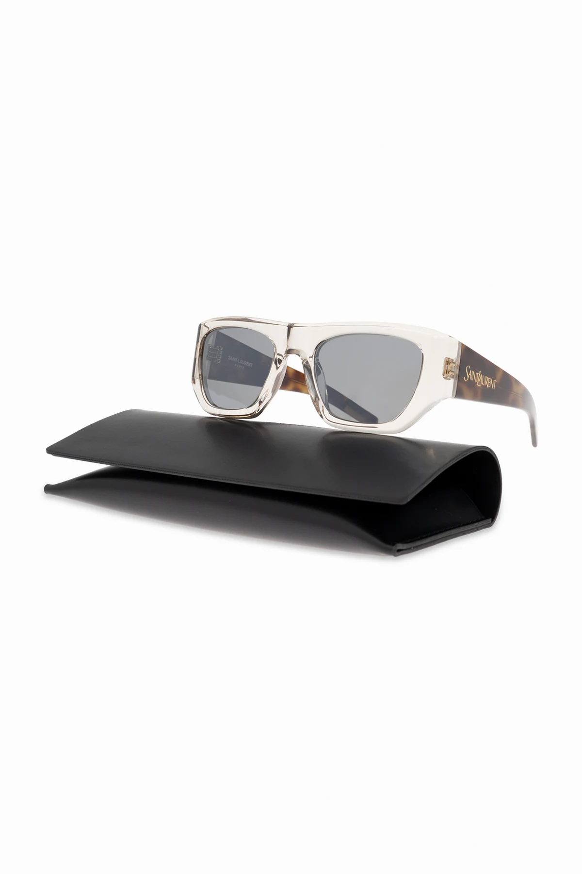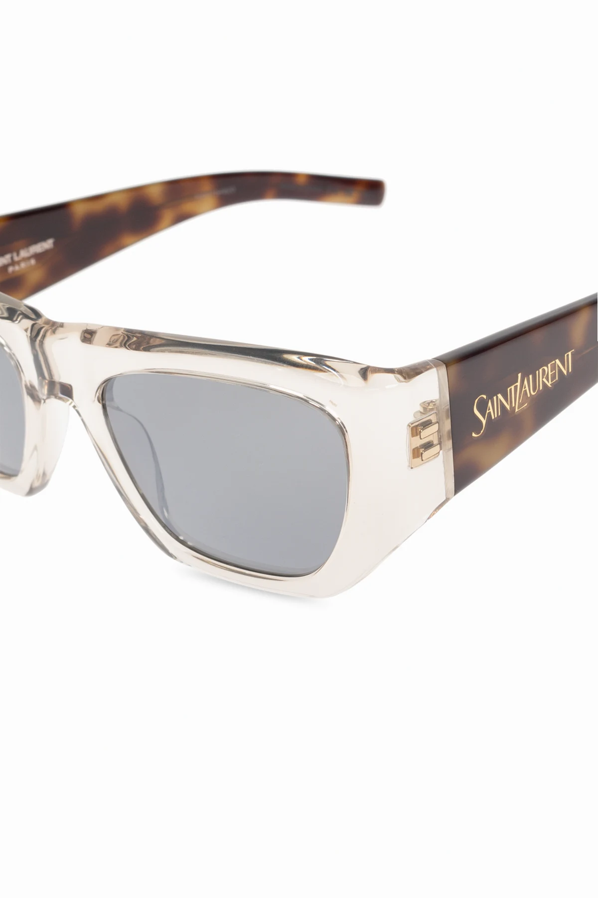 Na zausznikach dumnie widnieje złote logo "Saint Laurent", które podkreśla prestiż i renomę marki. Subtelne złote zawiasy dodają okularom wyrafinowania. Szare soczewki nie tylko prezentują się stylowo, ale również zapewniają skuteczną ochronę przeciwsłoneczną, chroniąc oczy przed szkodliwym promieniowaniem UV.