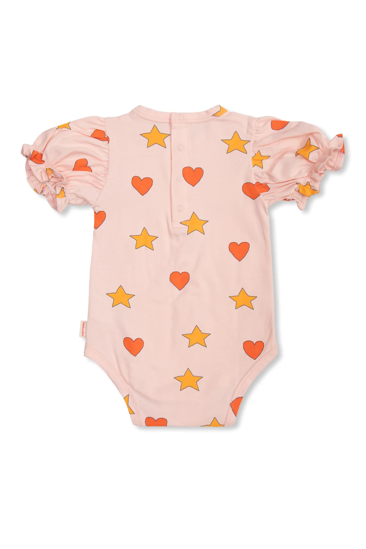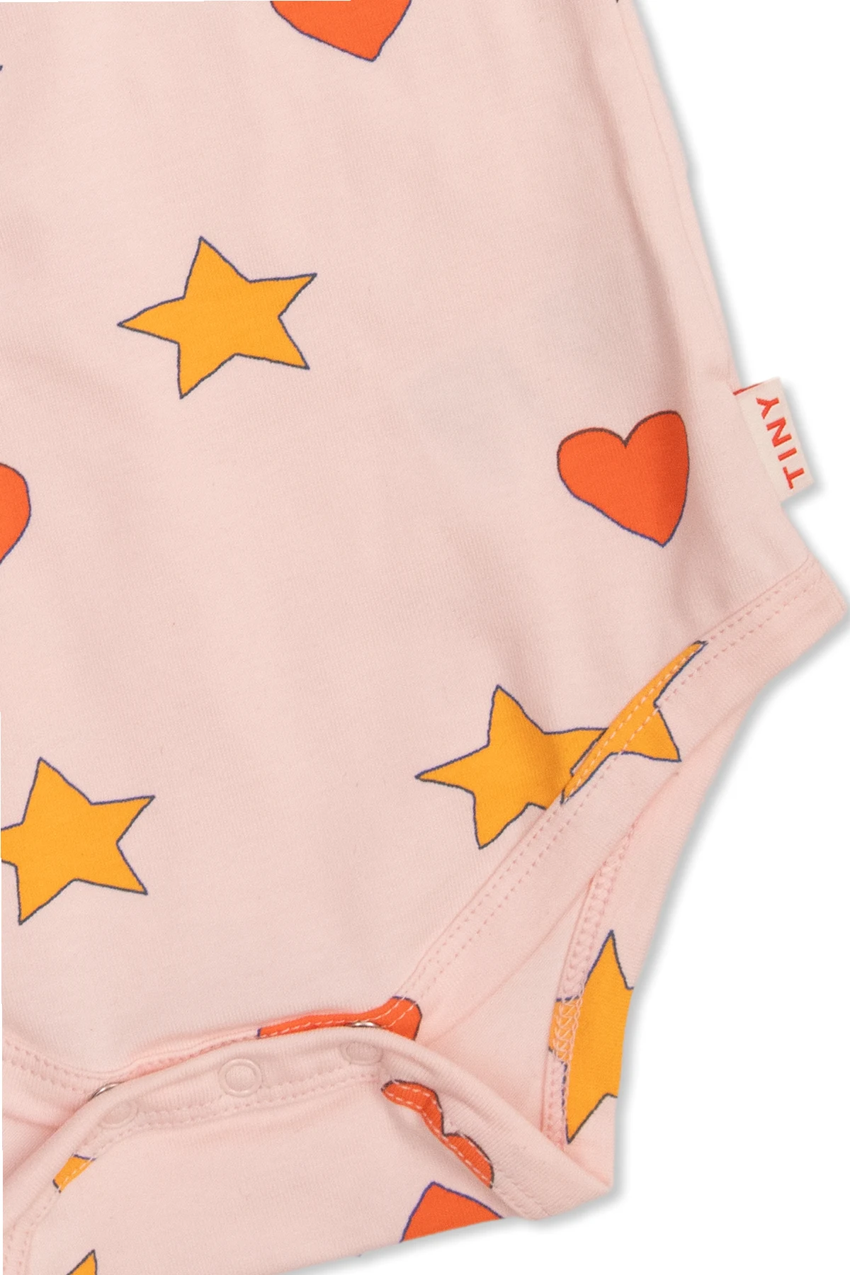 Jasnoróżowe body Tiny Cottons. Wykonane z bawełny Pima. Z tyłu i na dole zapinane na zatrzaski. Ozdobione pomarańczowo-żółtym wzorem z motywem gwiazd i serc. Okrągły dekolt. Krótkie, bufiaste rękawy zakończone ściągaczem.