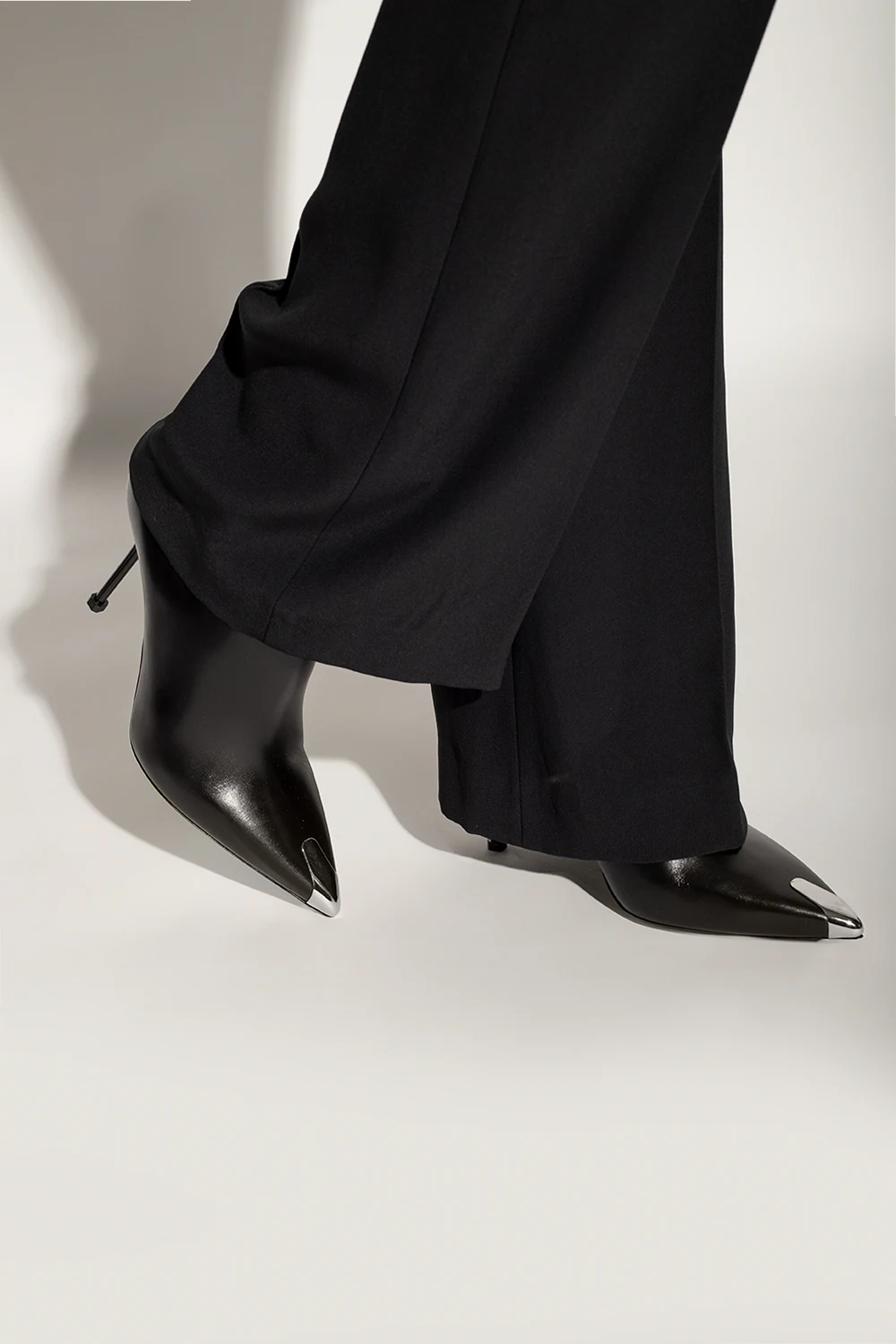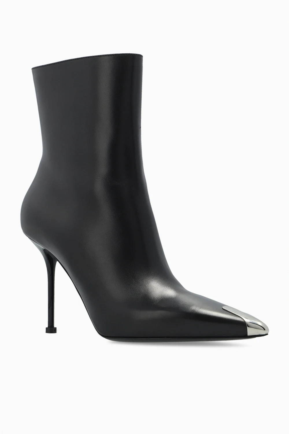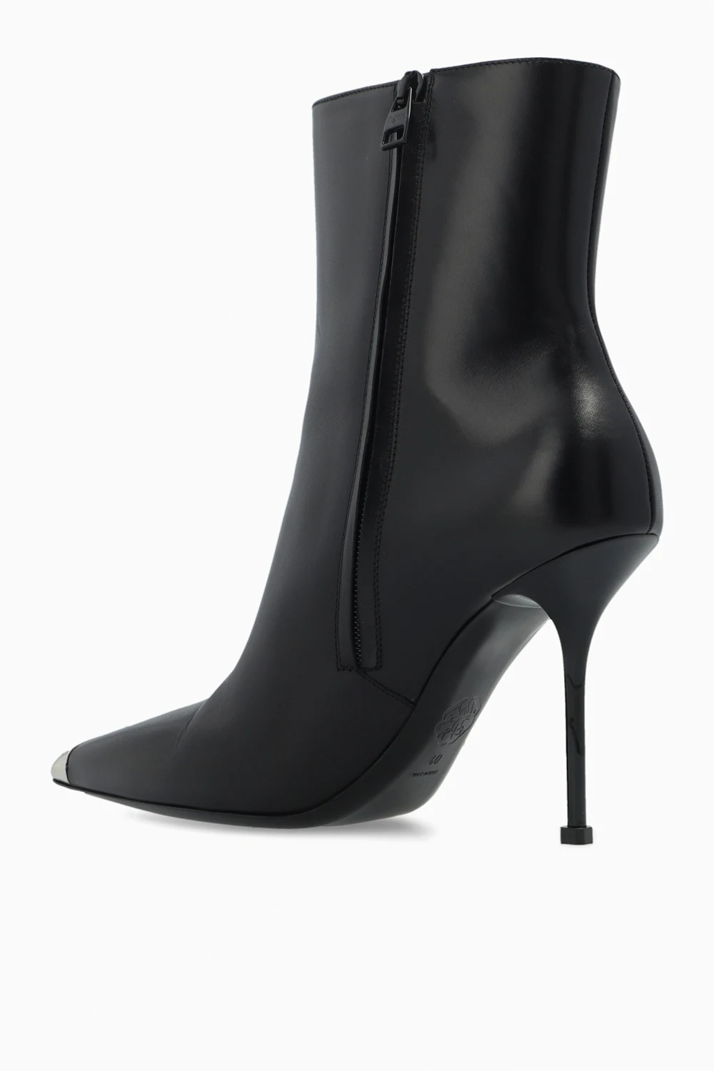 Czarne botki na obcasie Alexander McQueen. Wykonane z gładkiej skóry. Z boku zapinane na zamek. Nosek w szpic ozdobiony aplikacją w kolorze srebrnym. Czarna, gumowa podeszwa.