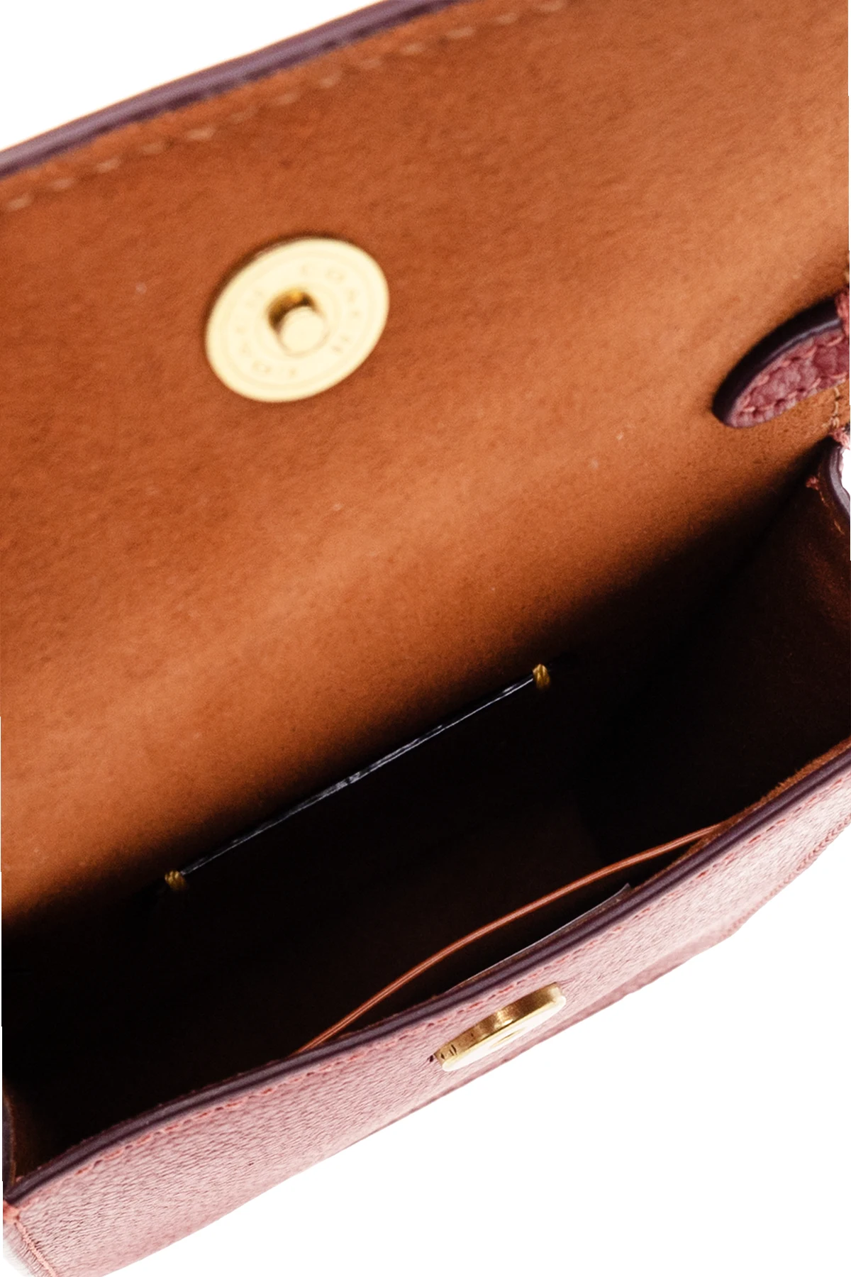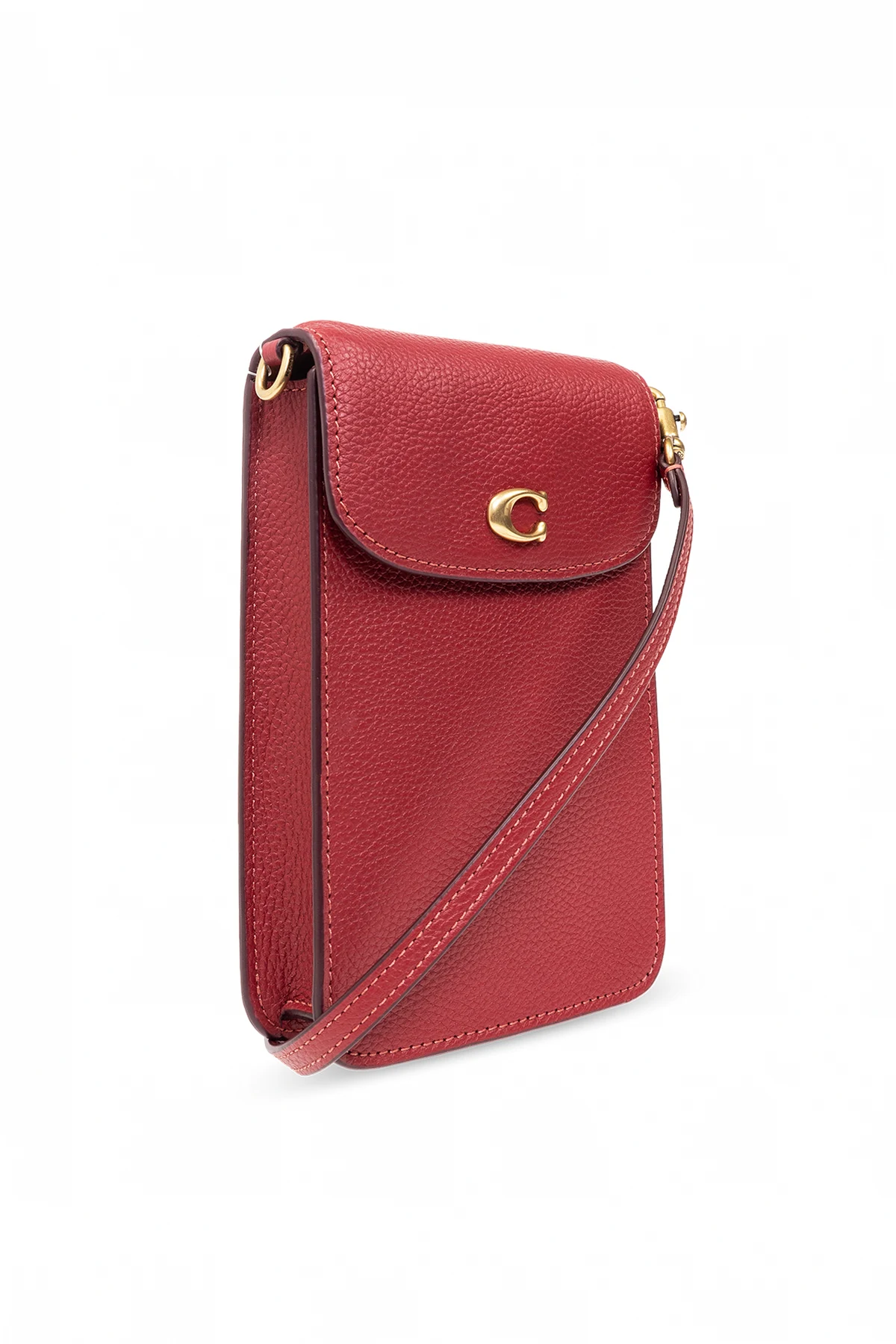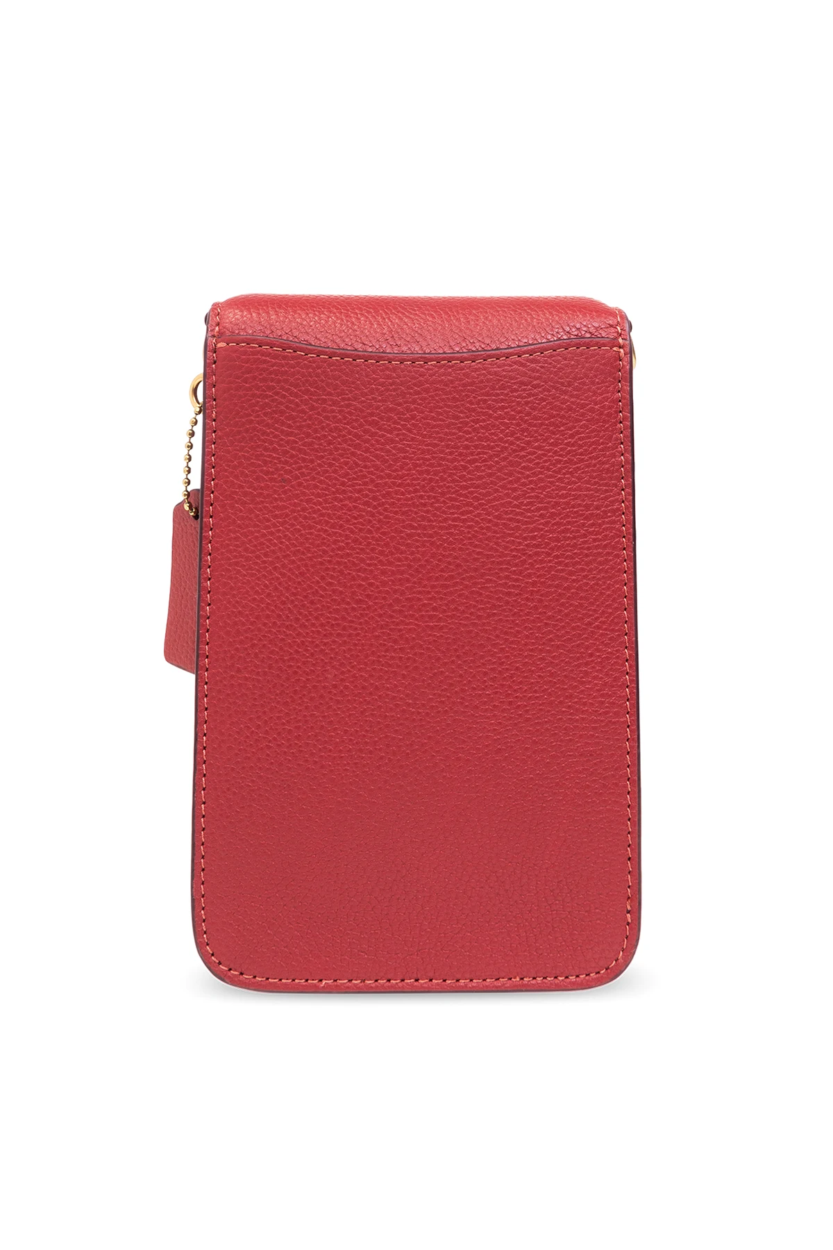 Czerwone etui na telefon na pasku Coach. Wykonane ze skóry. Zamykane na magnetyczny zatrzask. Z przodu aplikacja w kształcie logo. Długi, odpinany, regulowany pasek. Wewnątrz komora i dwa miejsca na karty.