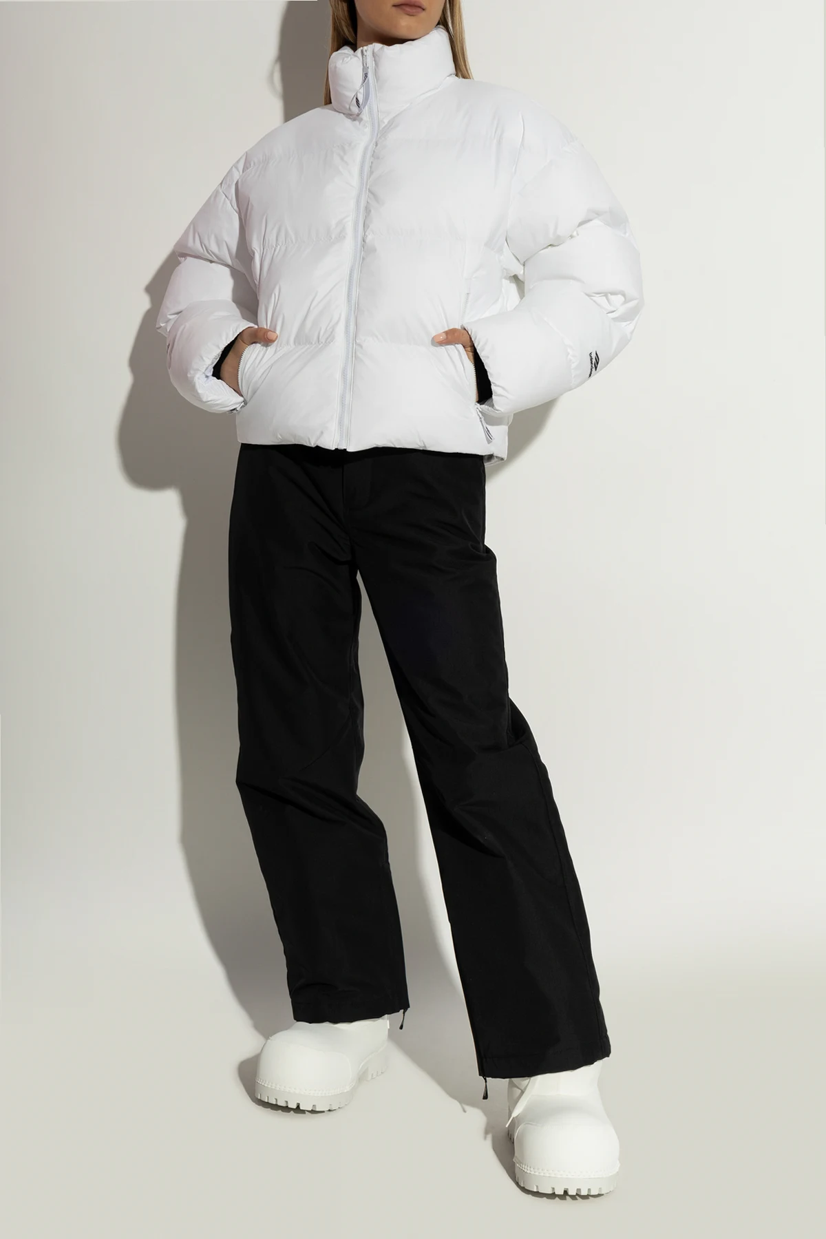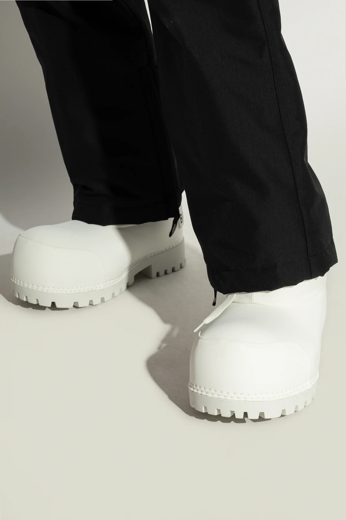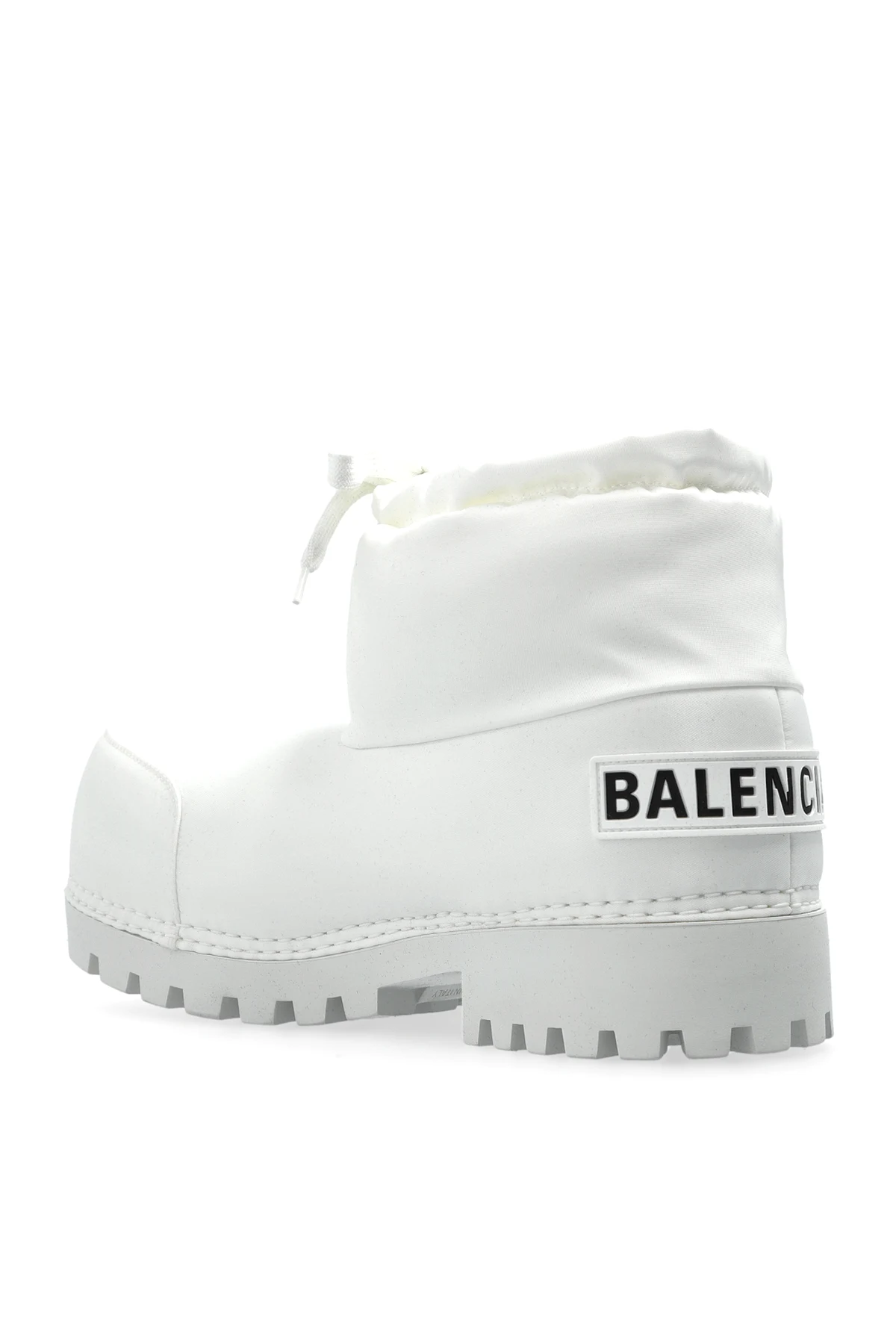 Wykonane z wodoodpornego materiału syntetycznego, śniegowce posiadają masywną, opływową formę z zaokrąglonym noskiem, zapewniającą komfort i styl. Ich gruba, żłobiona podeszwa z gumy gwarantuje doskonałą przyczepność na śniegu i lodzie, a napis „BALENCIAGA” na tylnej części buta stanowi subtelny akcent identyfikujący markę.